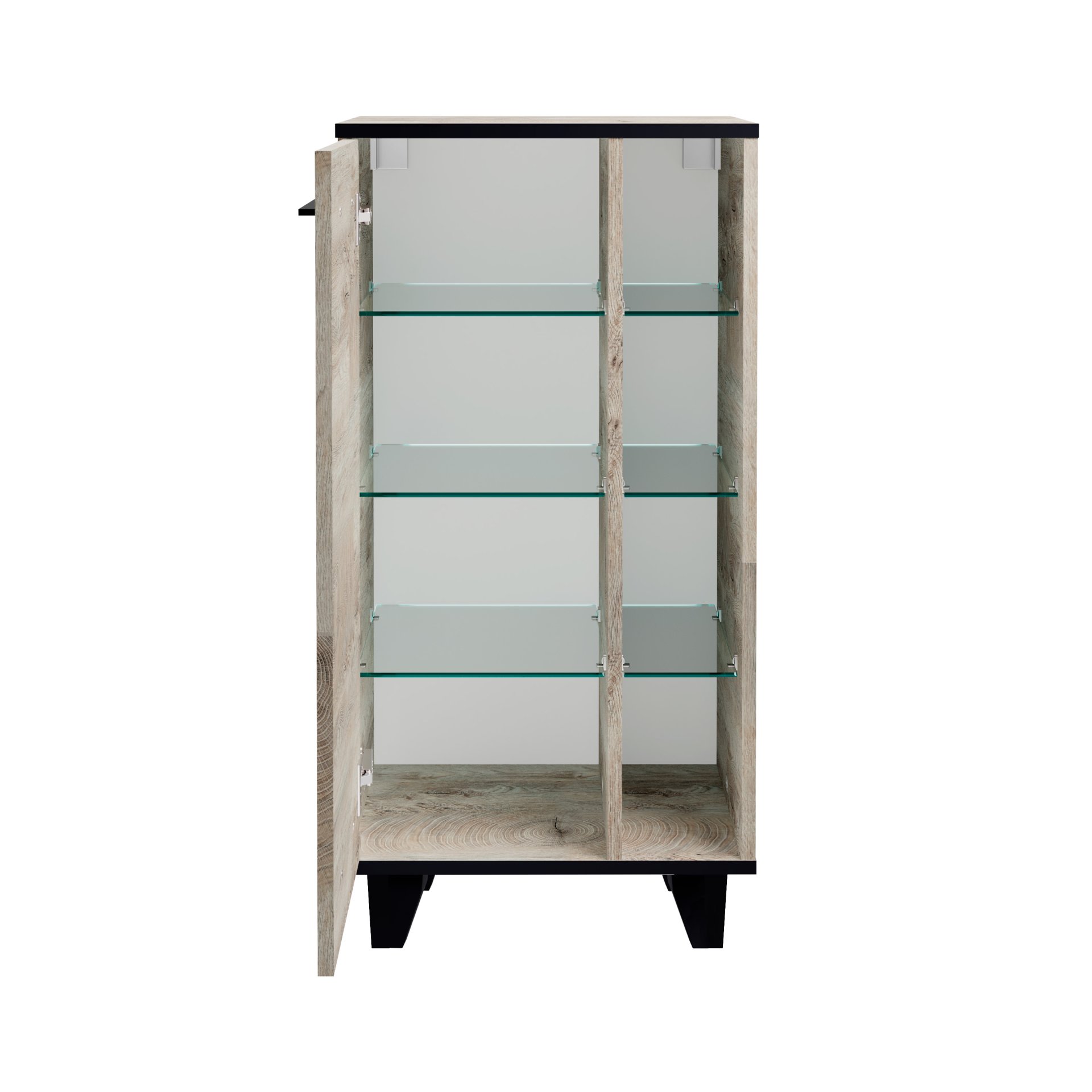 - Ausstattung: 1 Tür, 3 Glaseinlegeböden, 3 Glasfachböden, Abdeckplatte, schwarze Kanten und 4 Sockelfüße (Höhe 10 cm)