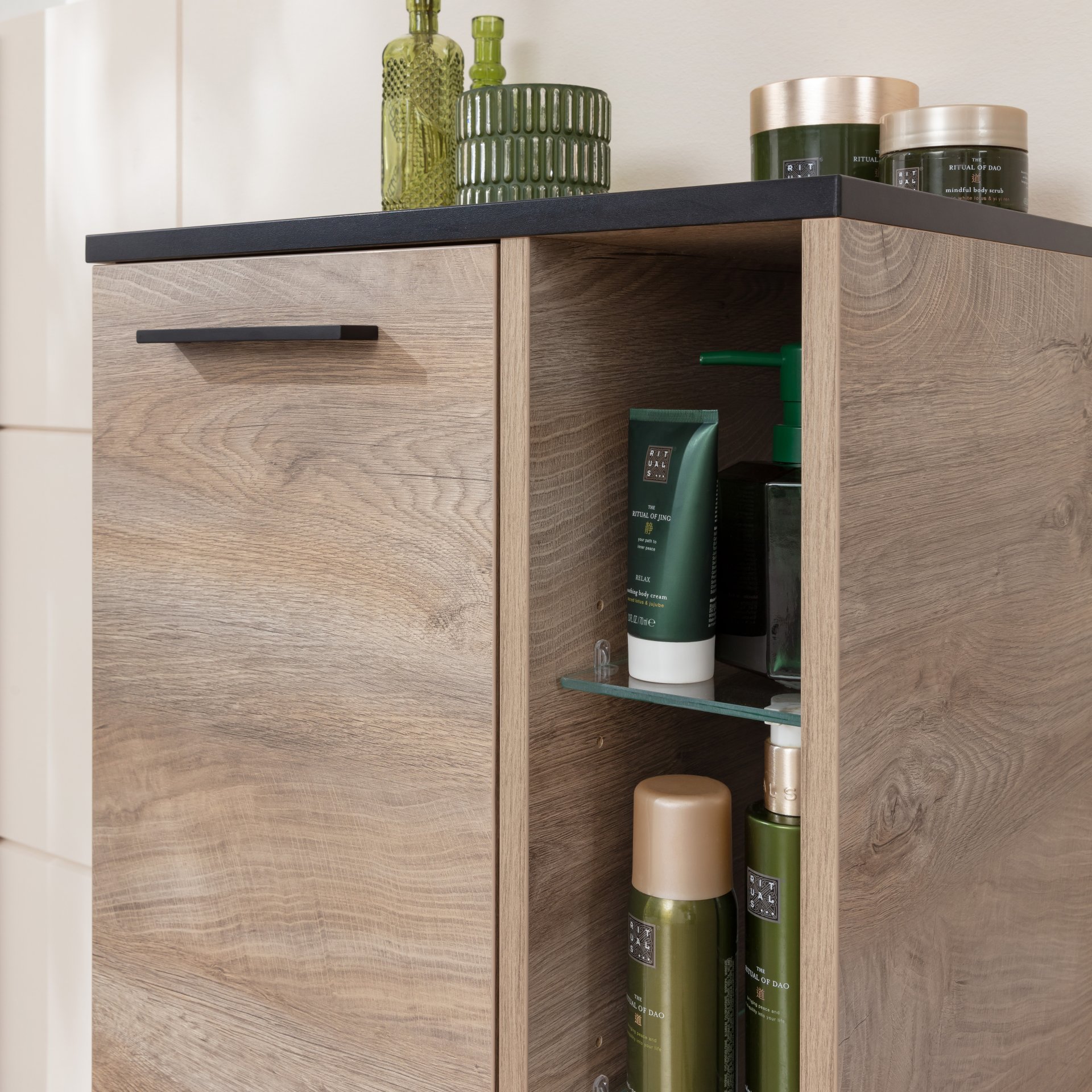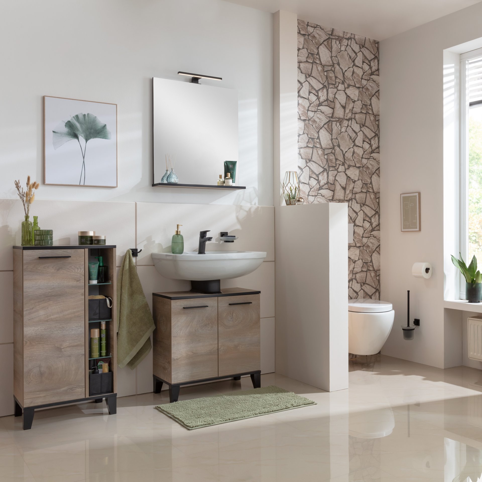 Dieser moderne Midischrank im natürlichen Nature Oak Stil aus der Serie TE-A von Fackelmann bietet Dir sowohl stilvollen Stauraum als auch ein elegantes Design. Die hellbraune Oberfläche erinnert an das natürliche Farbspiel der Eiche und bringt Wärme in Dein Badezimmer. Mattschwarze Kanten und Sockelfüße setzen stylische Akzente und verleihen dem Badschrank einen zeitlosen Charakter. Der Schrank ist mit einer Tür ausgestattet, hinter der sich drei Glaseinlegeböden befinden. Hier lassen sich Deine Badaccessoires, von Handtüchern bis hin zu Toilettenartikeln, bequem verstauen. Auf der rechten Seite befindet sich ein offenes Regal mit Glaseinlegböden. Viel Spielraum für Deine eigene Kreativität. Das moderne Design und die hochwertigen Materialien machen diesen Badezimmerschrank zu einer langlebigen Ergänzung für jedes Badezimmer. Badmöbel von Fackelmann werden mit viel Liebe zum Detail in Deutschland gefertigt. Der Fackelmann TE-A Midischrank 47 cm mit Füßen, Braun hell ist zerlegt und wird mit einer leicht verständlichen Aufbauanleitung geliefert.