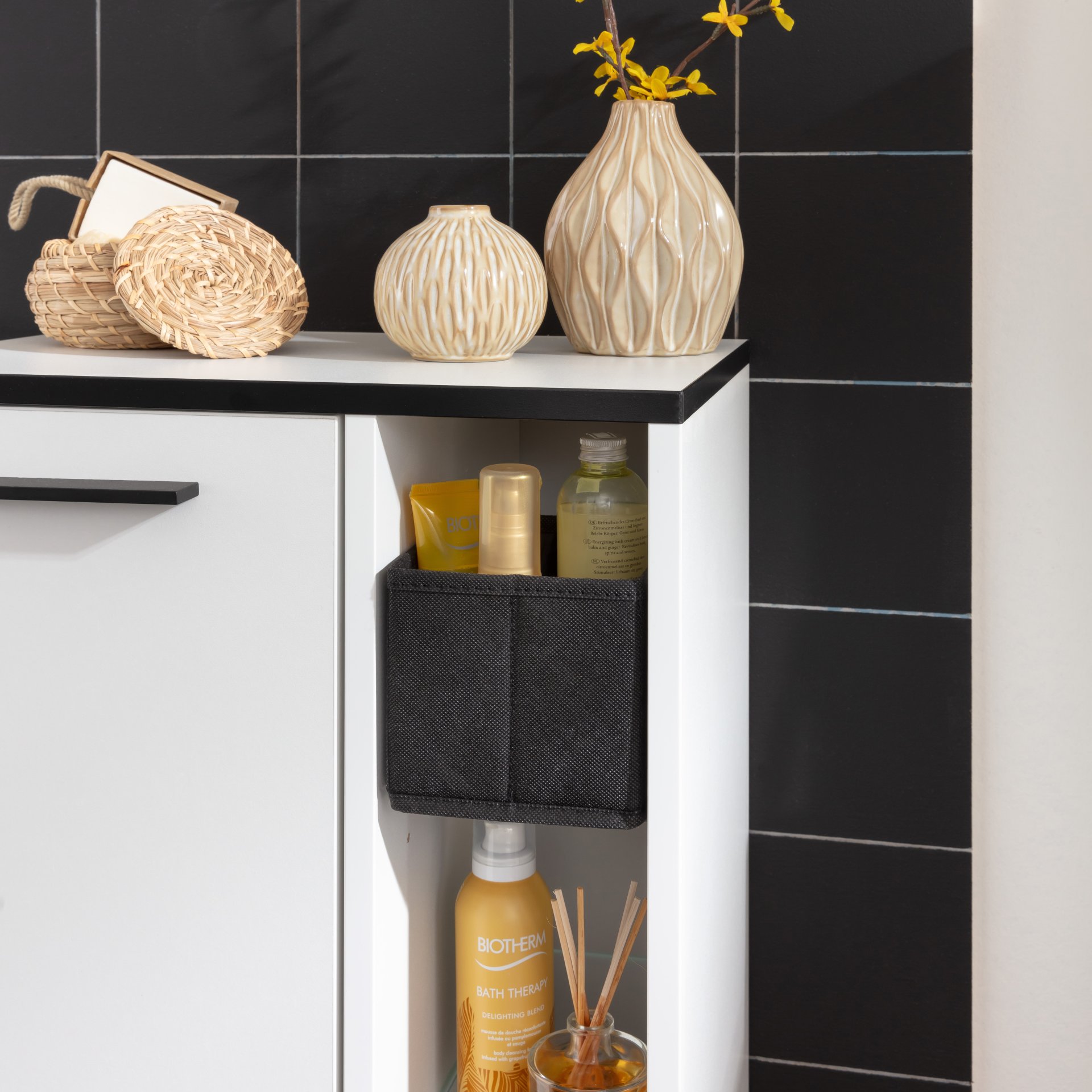 - Farbe: Korpus/Front Weiß matt, Kanten und Füße Schwarz matt, Rückwand Silbergrau/ Weiß
