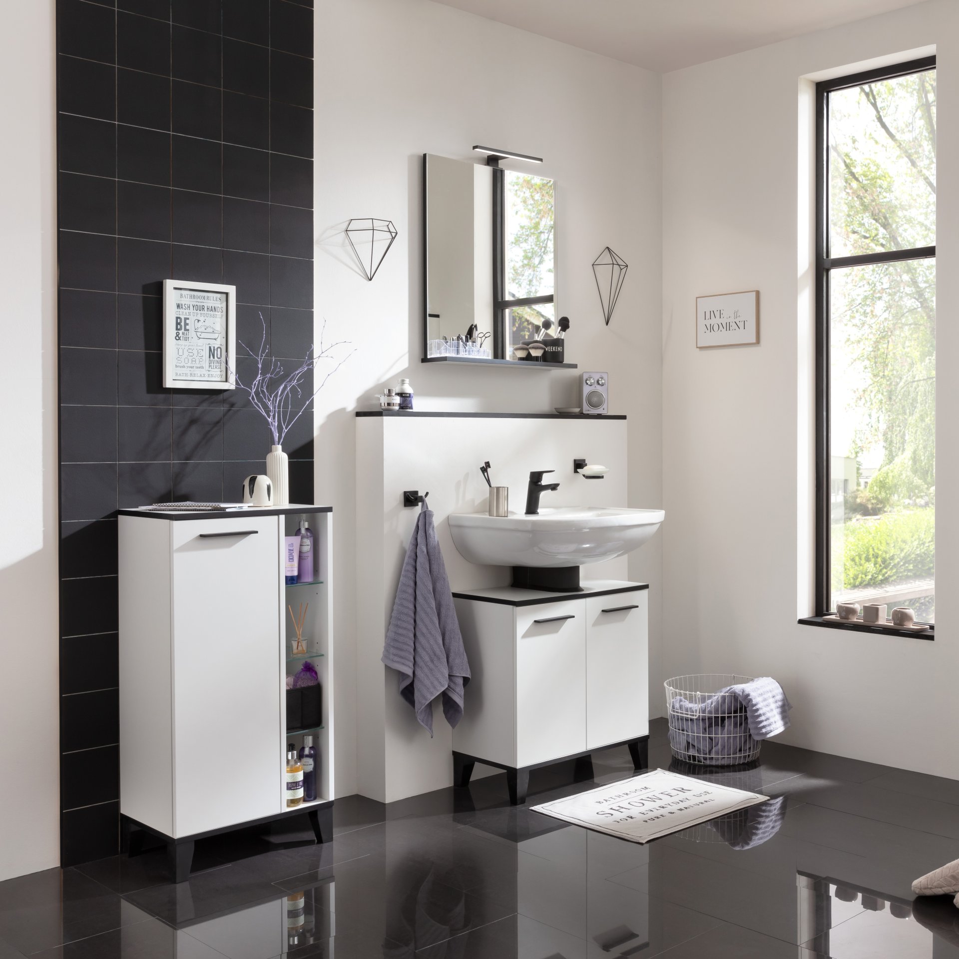 Dieser moderne Midischrank aus der Serie TE-A von Fackelmann bietet Dir sowohl stilvollen Stauraum als auch ein elegantes Design. Die matte weiße Oberfläche des Korpus und der Front sorgt für einen sauberen und frischen Look im Badezimmer. Mattschwarze Kanten und Sockelfüße setzen stylische Akzente und verleihen dem Badschrank einen zeitlosen Charakter. Der Schrank ist mit einer Tür ausgestattet, hinter der sich drei Glaseinlegeböden befinden. Hier lassen sich Deine Badaccessoires, von Handtüchern bis hin zu Toilettenartikeln, bequem verstauen. Auf der rechten Seite befindet sich ein offenes Regal mit Glaseinlegböden. Viel Spielraum für Deine eigene Kreativität. Das moderne Design und die hochwertigen Materialien machen diesen Badezimmerschrank zu einer langlebigen Ergänzung für jedes Badezimmer. Badmöbel von Fackelmann werden mit viel Liebe zum Detail in Deutschland gefertigt. Der Fackelmann TE-A Midischrank 47 cm mit Füßen, Weiß ist zerlegt und wird mit einer leicht verständlichen Aufbauanleitung geliefert.