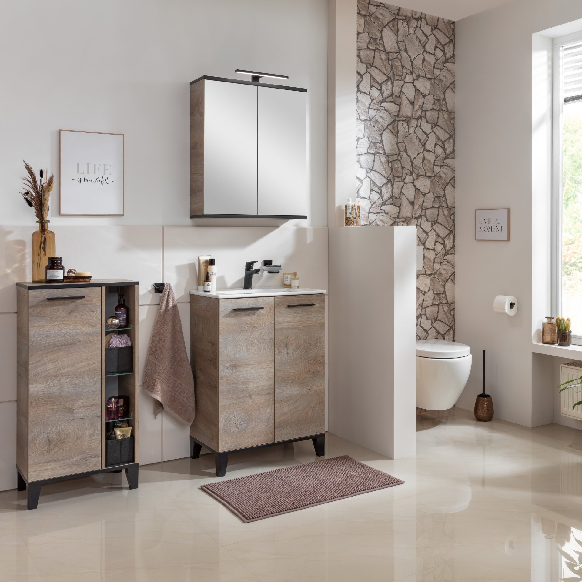 - Farbe: Rückwand Silbergrau/Weiß, Korpus Nature Oak, Kanten Schwarz