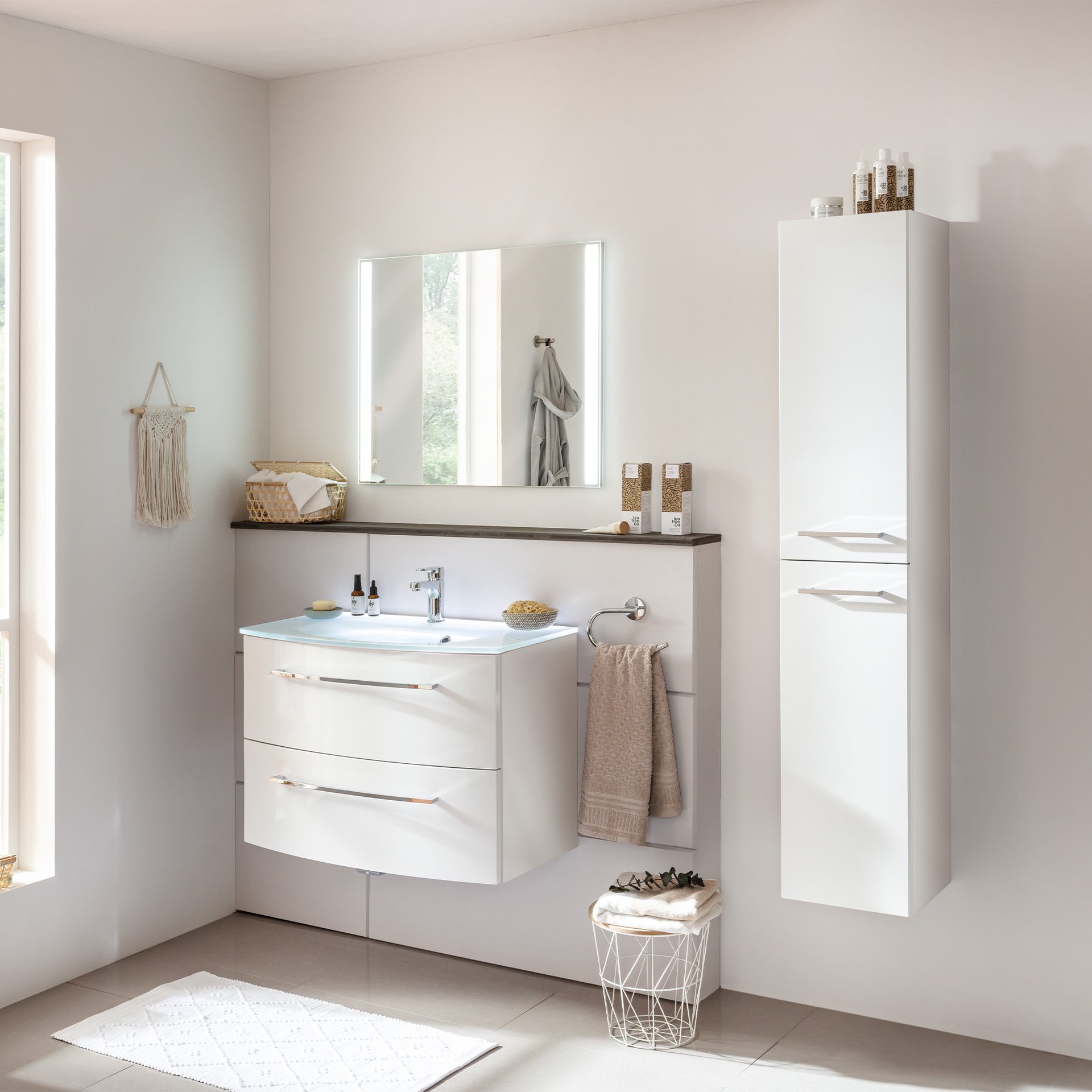 Ein Traum in Weiß verbunden mit einem exklusiven weißen Glasbecken. Was will man mehr? Das zeitlose 2-teilige Badmöbel Set aus der Serie VERONA von Fackelmann ist der Blickfang für Dein Badezimmer. Die leicht geschwungene Front des Waschtischunterschranks wird von dem Waschbecken aufgenommen. So entsteht Leichtigkeit und Exklusivität. Das hochglänzende Weiß der Front bringt die chromglänzenden Stangengriffe eindrucksvoll zur Geltung. Selbstverständlich sind beide Schubladen des Waschbeckenunterschranks mit einem modernen Soft-Close-System ausgestattet. Es gestattet ein nahezu lautloses Schließen der Schübe. Im geräumigen Innenraum finden Deine Badaccessoires einen geeigneten Platz und sind immer griffbereit. Passgenau auf dem Waschtischunterschrank sitzt das 80 cm breite weiße Waschbecken aus Glas. Dieses kannst Du mit der Waschbeckenbeleuchtung eindrucksvoll illuminieren. Kein Stromanschluss nötig! Ein batteriebetriebener Bewegungsmelder mit Sensor schaltet die Beleuchtung beim Betreten des Bades ein und automatisch wieder aus. Dieses Accessoire ist nicht im Lieferumfang enthalten und muss separat bestellt werden. (Art.Nr. 86300). Badmöbel von Fackelmann werden mit viel Liebe zum Detail in Deutschland hergestellt. Der Fackelmann VERONA Badmöbel Set 2-teilig 80 cm breit, Weiß Hochglanz, Glas ist vormontiert und kann so schnell und einfach in Dein neues Badezimmer einziehen.