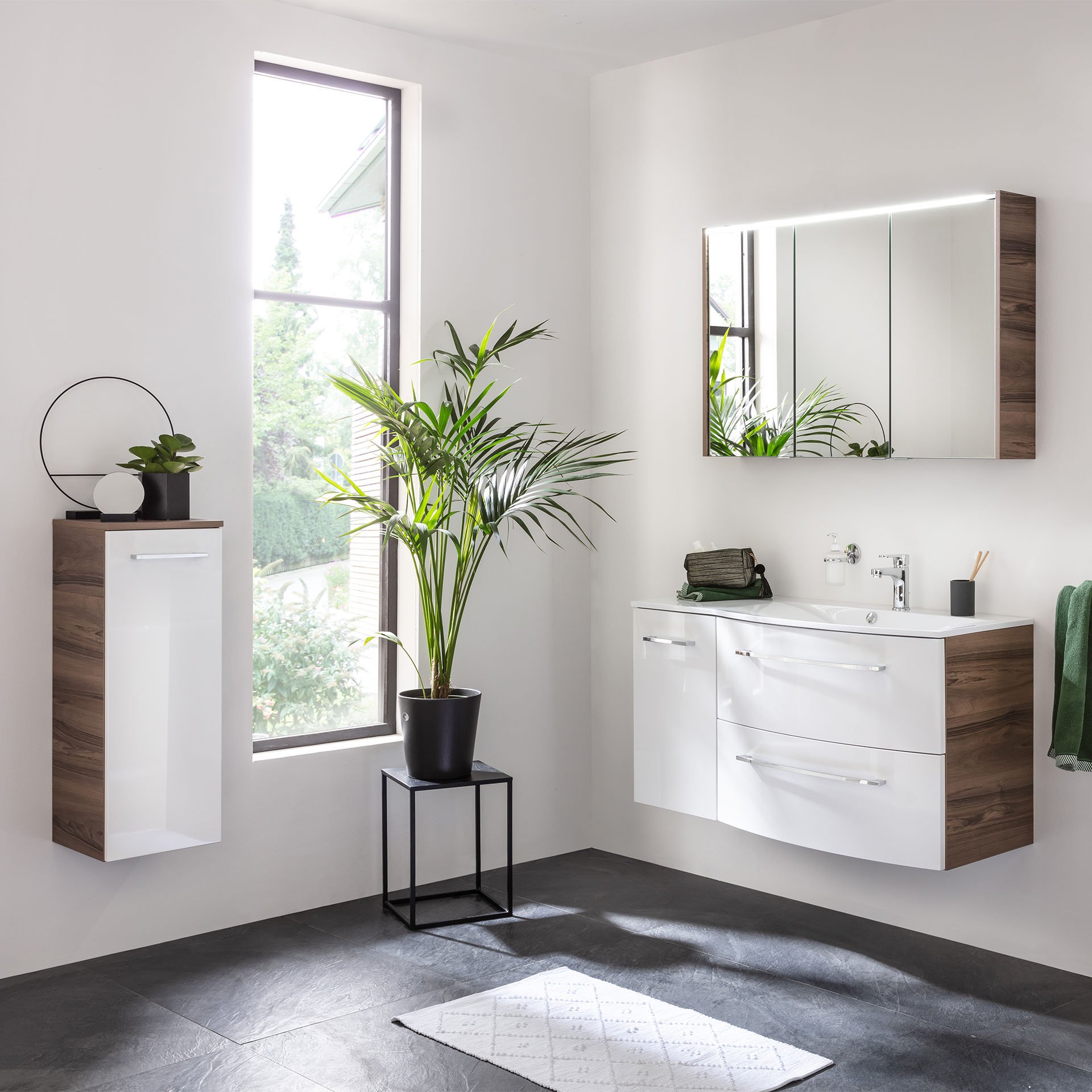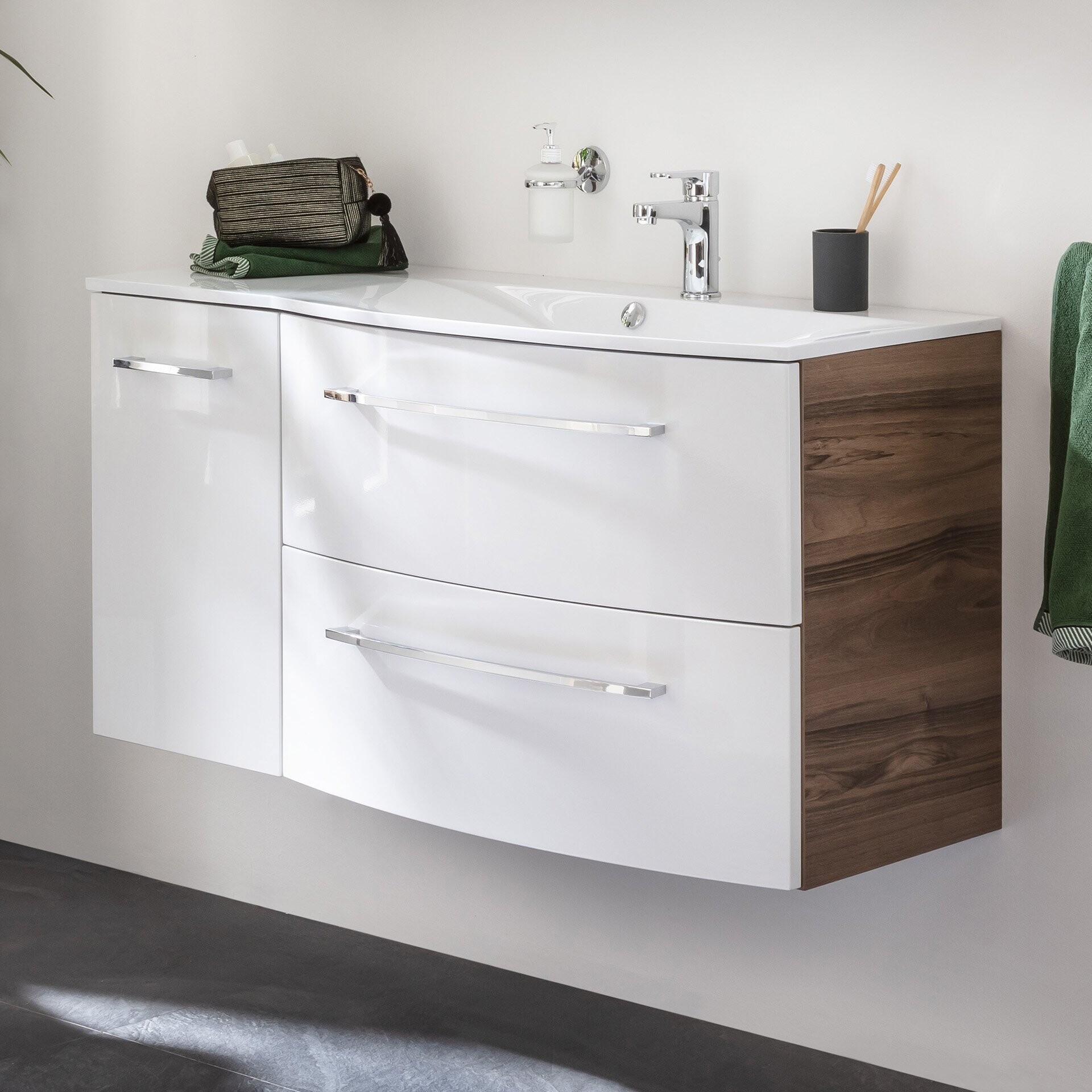 Eleganz trifft Funktionalität im 3-teiligen Badmöbel Set aus der Serie VERONA von Fackelmann. Ein wahrer Hingucker ist der Waschtischunterschrank in Braun Dunkel/Weiß Hochglanz. Seine leicht geschwungene Front reflektiert eine besondere Designästhetik. Zwei geräumige Schubladen, ausgestattet mit einem modernen Soft-Close System, bieten genügend Stauraum. Akzentuiert durch einen Korpus in wertvoller Nussbaum Optik setzt Du in deinem Badezimmer luxuriöse Akzente. Nussbaum ist bekannt für seine markante, feine Maserung. Sie verleiht jedem Möbelstück eine individuelle Note und bringt Wärme in jeden Raum. Dank der geschwungenen Waschmulde und der praktischen Ablagefläche auf der linken Seite vereint der Waschtisch Stil und Funktionalität in Perfektion und vollendet die Formensprache. Zusätzlich bietet der Unterschrank durch seine clevere Aufteilung im Innenraum weiteren Stauraum. Badmöbel von Fackelmann werden mit viel Liebe zum Detail in Deutschland hergestellt. Das Fackelmann VERONA Badmöbel Set 3-teilig 115 cm breit, Braun/Weiß, Ablage links + Unterschrank ist vormontiert und kann so schnell und einfach in Dein neues Badezimmer einziehen.