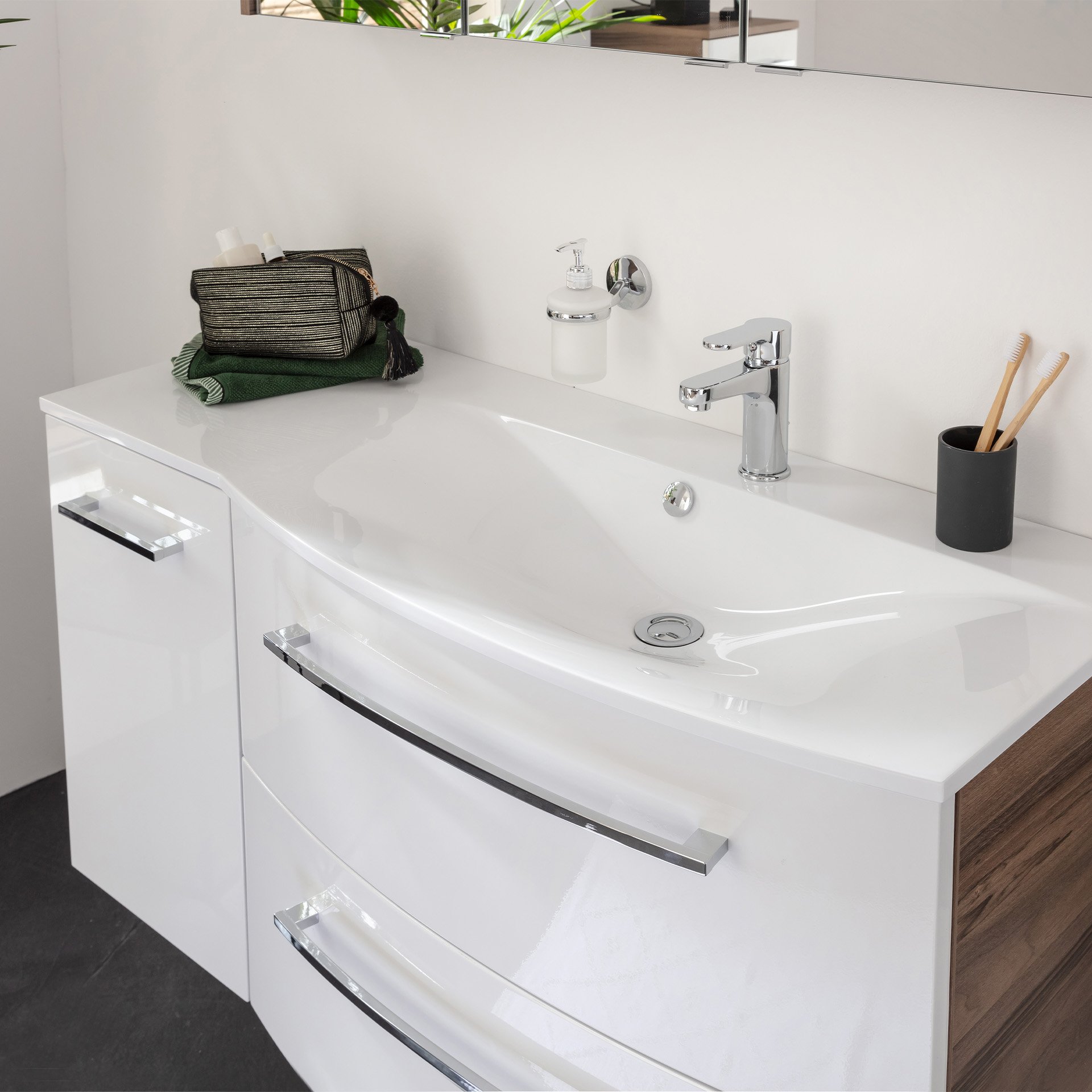- Besonderheit: geschwungene Waschmulde rechts, Ablage links