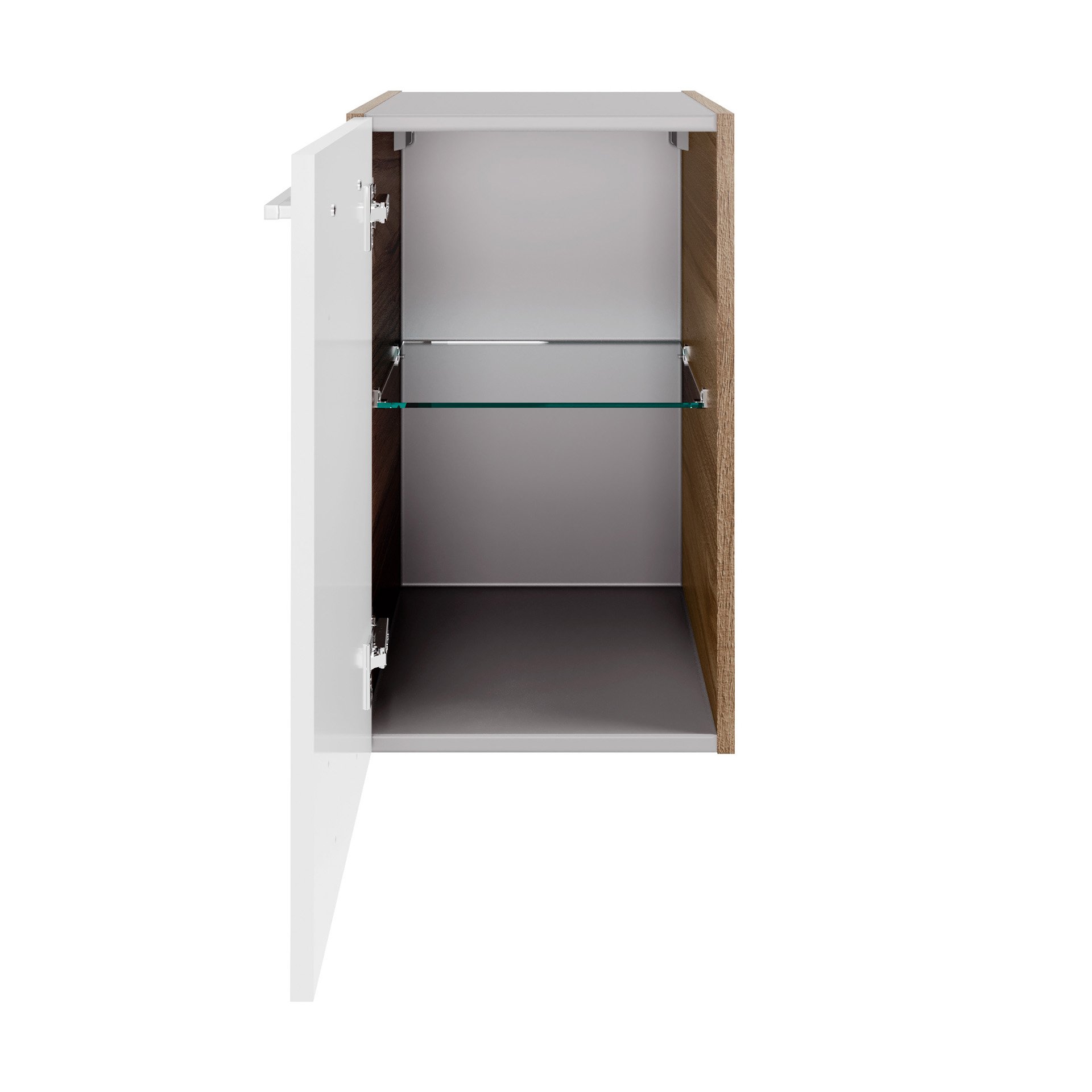 - Ausstattung: 1 Tür (Türanschlag links), 1 Glaseinlegeboden, gedämpfte Scharniere