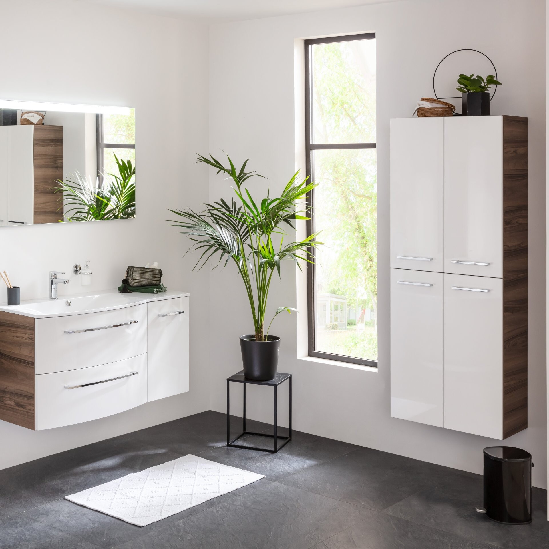 Du suchst einen Badschrank der durch seine Größe mit überragendem Stauraum jeden Ordnungsliebhaber überzeugt? Dann triffst Du mit dem Doppel-Hochschrank aus der Serie VERONA von Fackelmann genau die richtige Wahl! Gleichzeitig punktet der Schrank mit durchdachter Funktionalität und sorgt stilvoll für Ordnung in Deinem Badezimmer. Die weiß glänzende Front bildet eine perfekte Symbiose mit dem Korpus in einem warmen Nussbaum Ton. Der elegante Kontrast schafft in Deinem Bad eine wohnliche Atmosphäre, die durch Ruhe und Wertigkeit gekennzeichnet ist. Hinter vier Türen mit moderner Soft-Close-Funktion verbirgt sich praktischer Stauraum mit drei Einlegeböden. Besonders clever ist der integrierte große Wäschekorb mit Auszug. Schmutzige Wäsche ist diskret verstaut. Verchromte Griffe setzen dezente Akzente und unterstreichen den hochwertigen Look des vormontierten Badschranks. Somit ist der FACKELMANN VERONA Doppel Hochschrank 60 cm, Braun Dunkel/Weiß Hochglanz mit Wäschekorb sofort einsatzbereit und im Handumdrehen installiert. Badmöbel von Fackelmann werden mit großer Sorgfalt in Deutschland gefertigt und zeichnen sich durch ihre geschätzte Qualität aus.