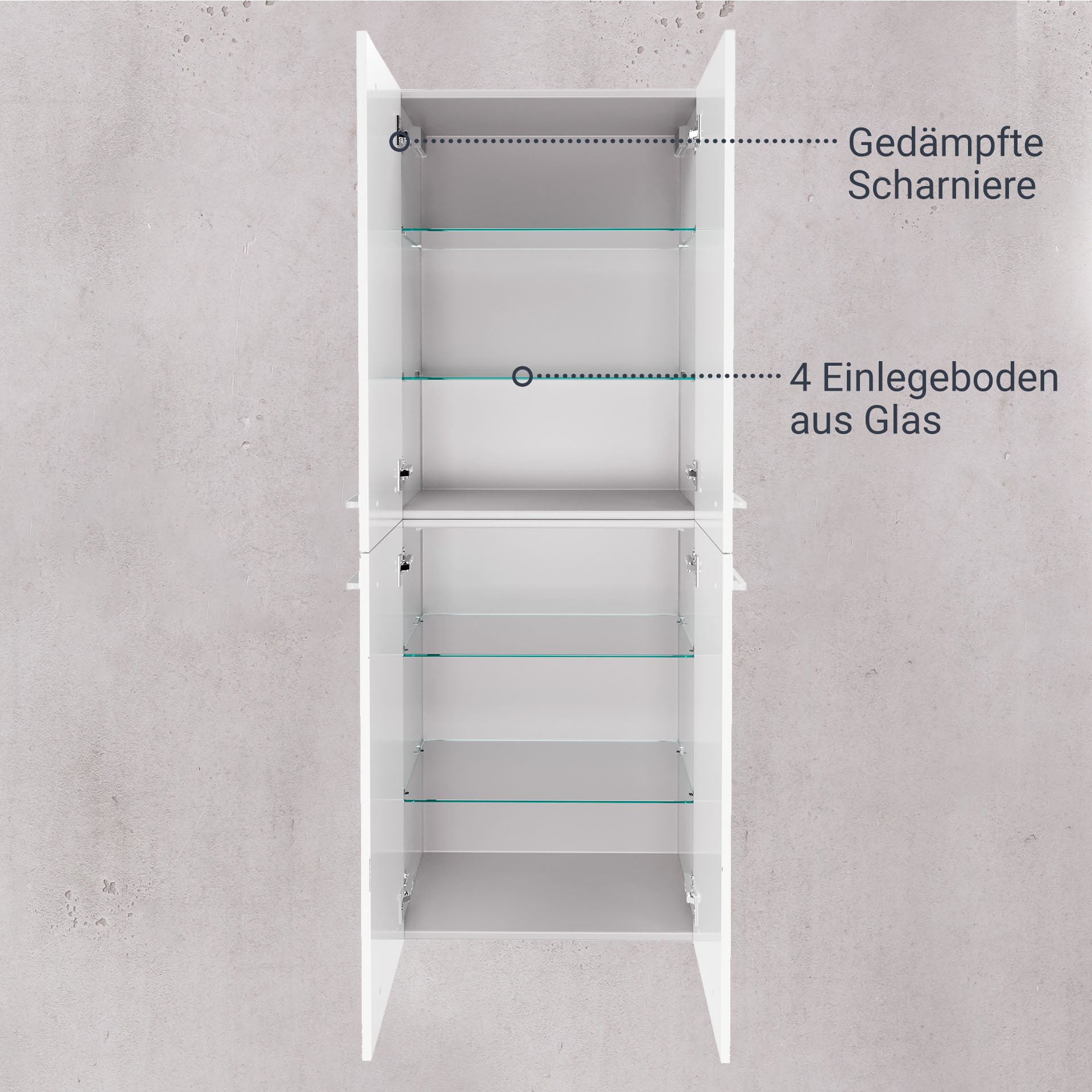 - Ausstattung: 4 Türen, 4 Glaseinlegeböden, 4 Griffe verchromt, gedämpfte Scharniere