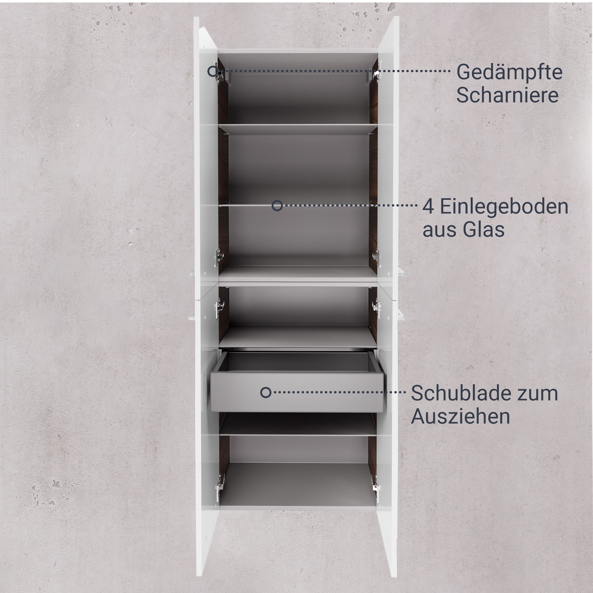 - Ausstattung: 4 Türen, 4 Glaseinlegeböden, 4 Griffe verchromt, gedämpfte Scharniere, 1 Innenschublade