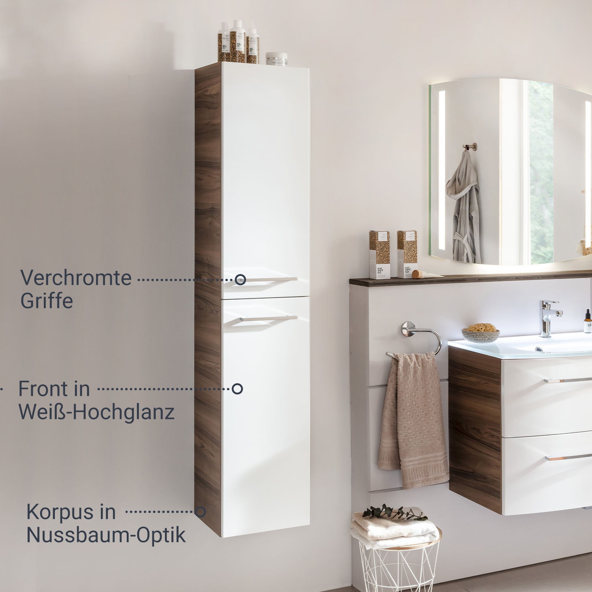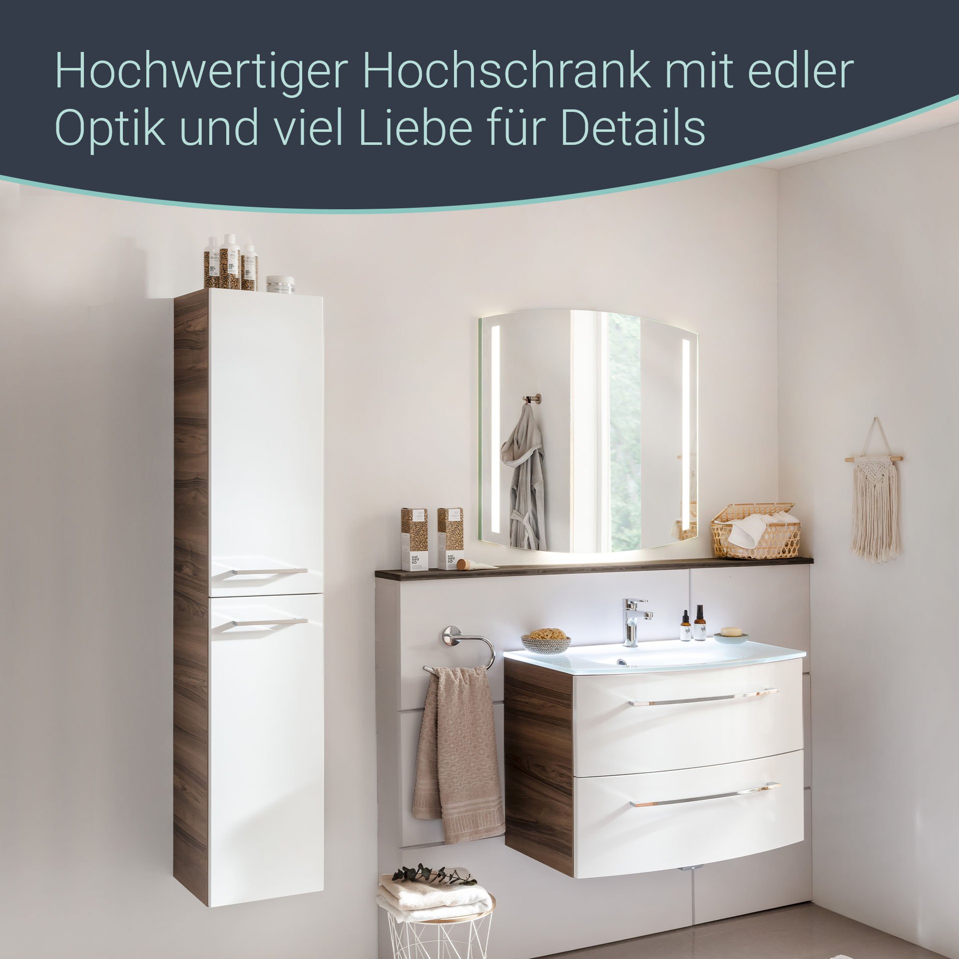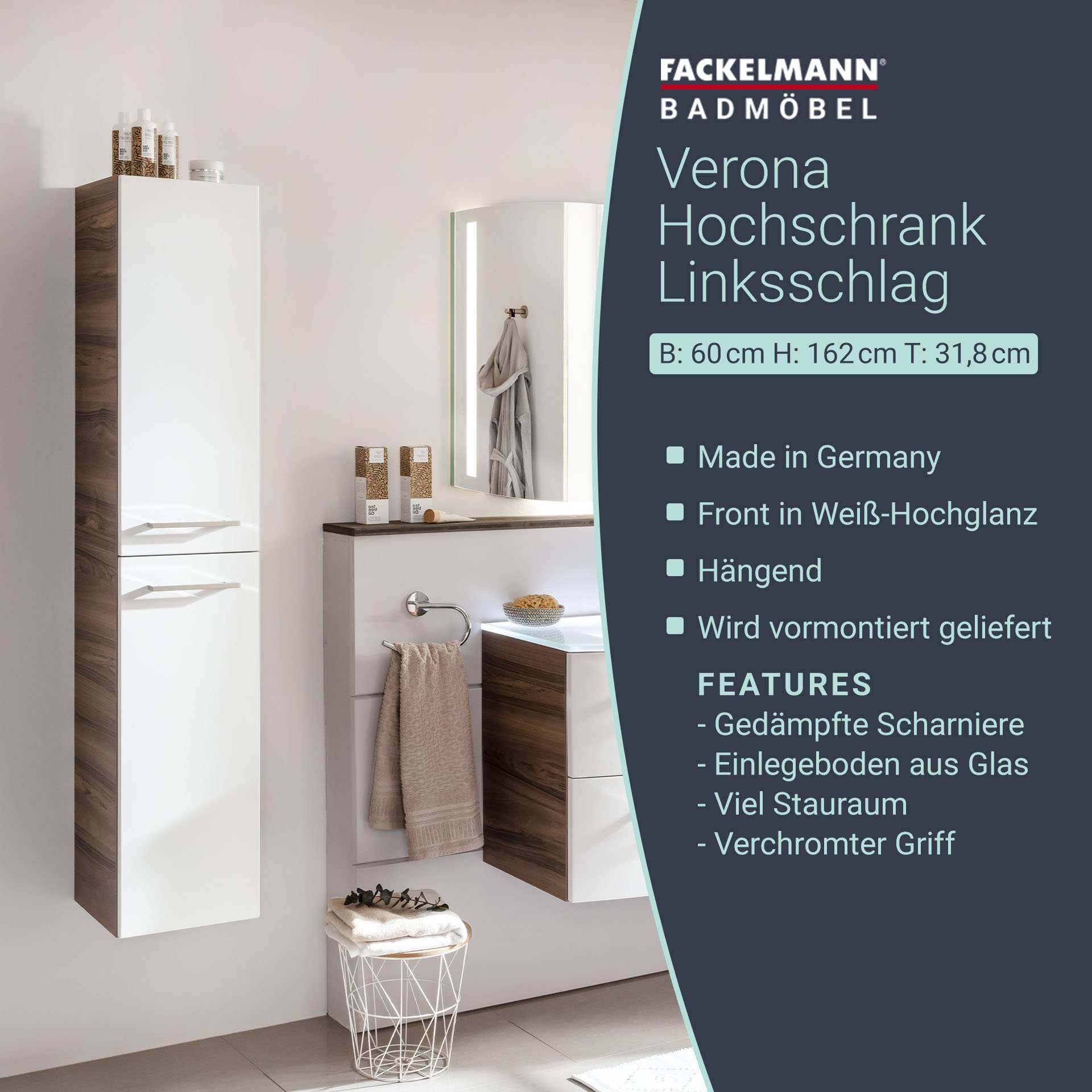 Du wünscht Dir Ordnung in Deinem Bad? Dann haben wir ein Stauraumwunder für Dein neues Badezimmer. Der Hochschrank mit linkem Türanschlag aus der Serie VERONA von Fackelmann überzeugt nicht nur durch seine zeitlose Gestaltung sondern vor allem durch sein überragendes Platzangebot. Mit der praktischen Aufteilung im Inneren hast Du immer Zugriff auf alle Deine Badeaccessoires. Vier Glaseinlegeböden unterteilen den Innenraum und geben ihm Struktur. Zwei verchromte Stangengriffe veredeln die weiße hochglänzende Front und gestatten ein leichtes Öffnen und Schließen der Türen. Der Korpus ist dem einzigartig gemaserten Edelholz Nussbaum nachempfunden. In Kombination mit der weißen Front entsteht ein edles und unverwechselbares Ambiente in Deinem Bad. Badmöbel von Fackelmann werden mit viel Liebe zum Detail in Deutschland hergestellt. Der Fackelmann VERONA Hochschrank 30 cm, links, Braun Dunkel/Weiß Hochglanzist vormontiert und kann so schnell und einfach in Dein neues Badezimmer einziehen.