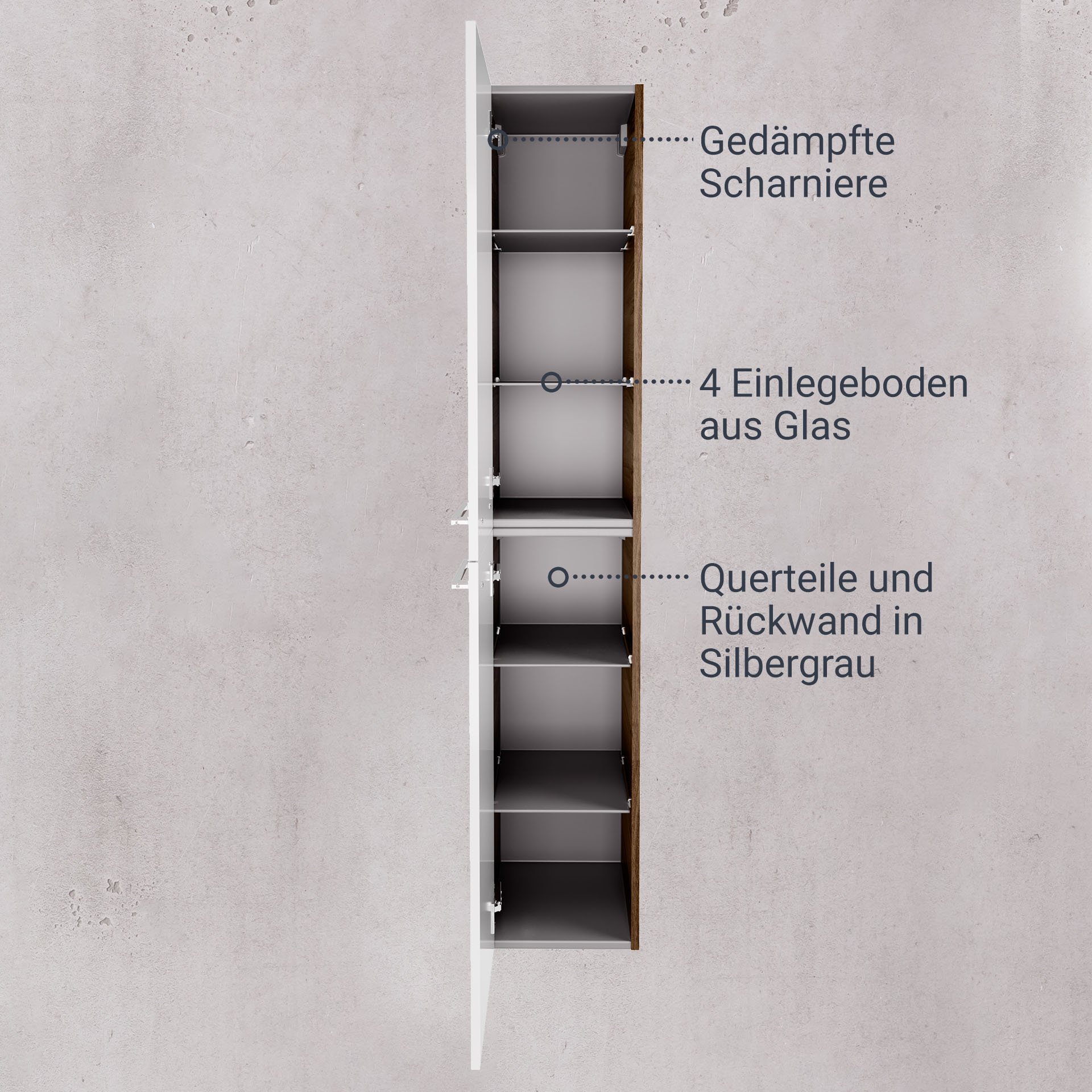 - Besonderheit: Querteile und Rückwand silbergrau, Korpus 2 Teile, linker Türanschlag