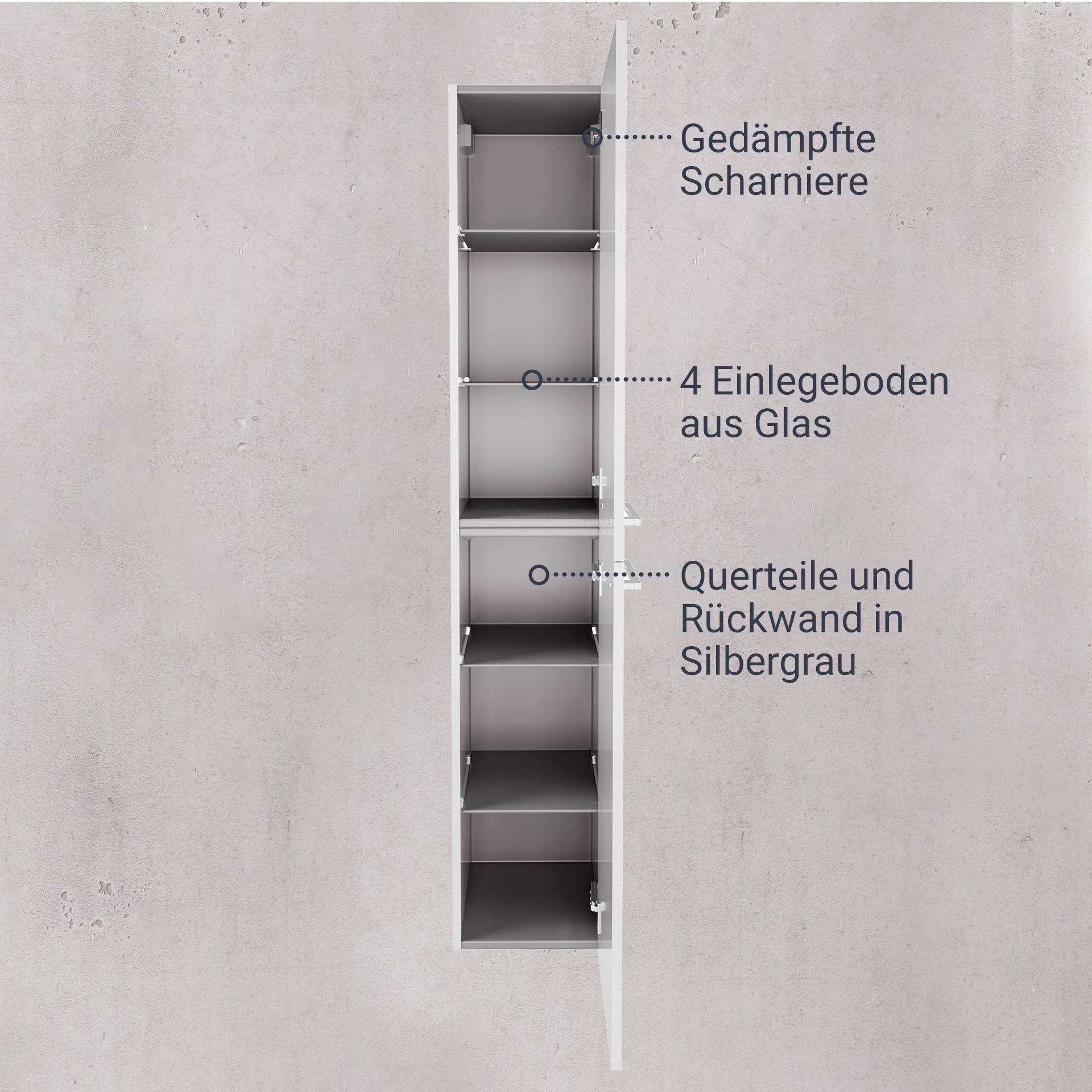- Besonderheit: Querteile und Rückwand silbergrau, Korpus 2 Teile, rechter Türanschlag