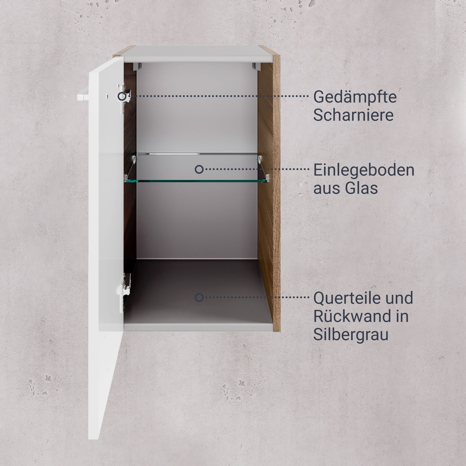 - Ausstattung: 1 Tür (Türanschlag links), 1 Glaseinlegeboden, gedämpfte Scharniere