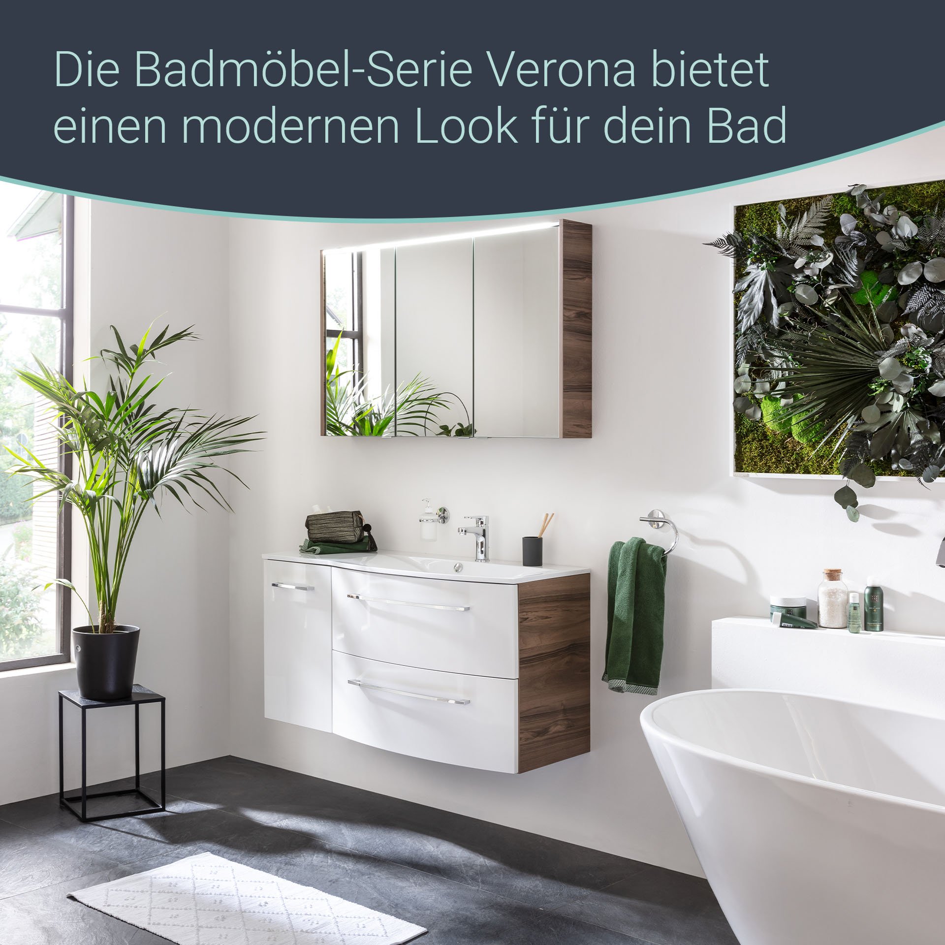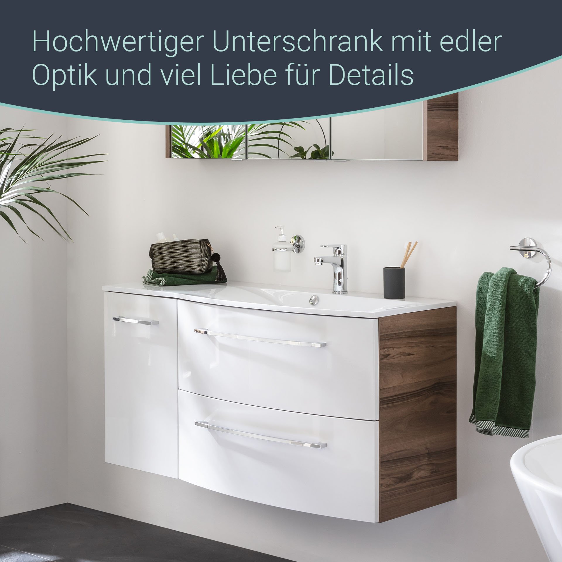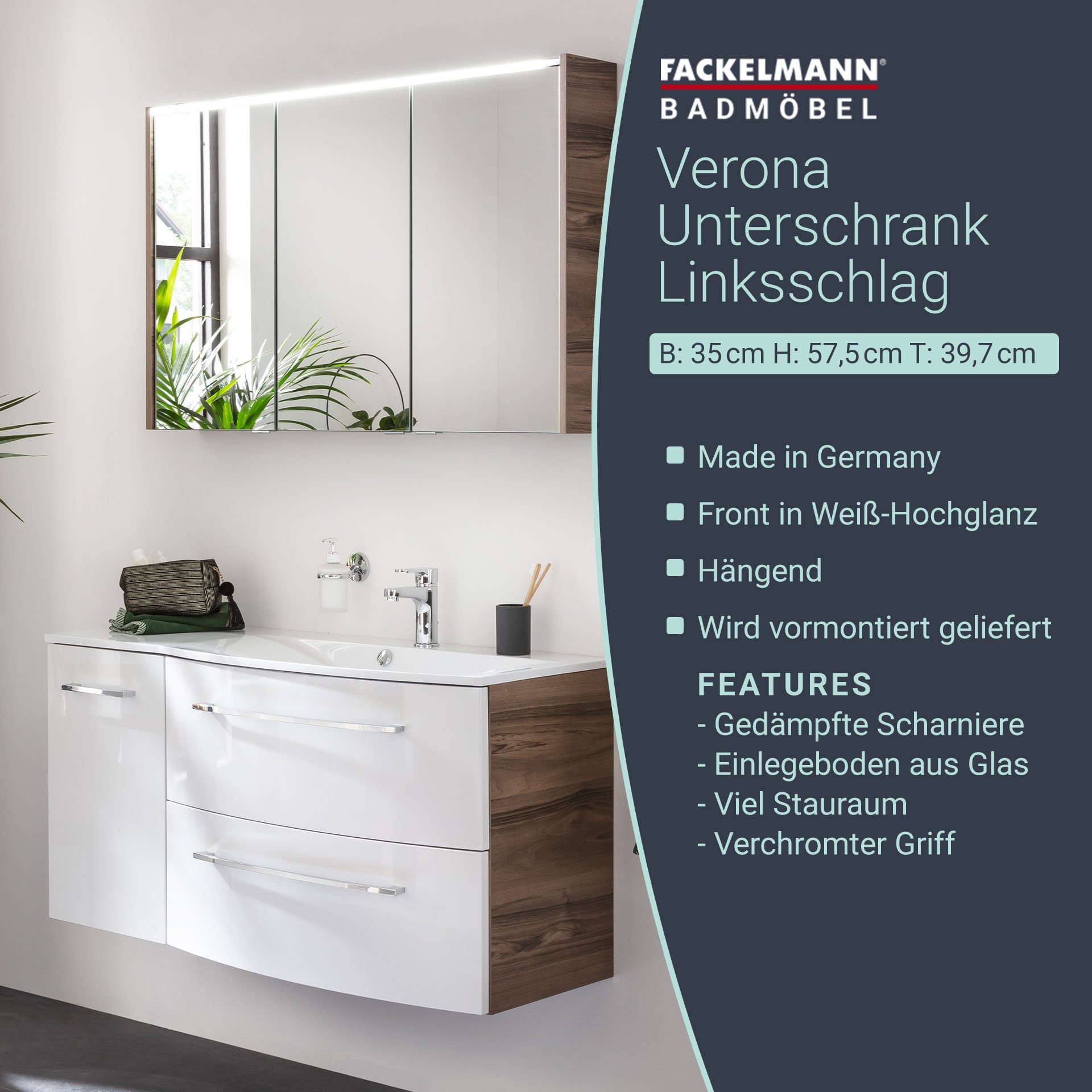 Damit in Deinem Badezimmer alles harmonisch aufeinander abgestimmt ist, benötigst Du für den weißen Waschtisch aus Gussmarmor mit seiner linken Ablagefläche (Art.Nr. 73608) und den Waschtischunterschrank mit der Artikelnummer 73101 den Unterbauschrank mit einer Breite von 35 cm. Der Schrank verfügt über eine Tür mit linkem Türanschlag und einen Einlegeboden aus Glas. Die einzigartige, gemaserte Struktur von Nussbaum findet im Korpus seine Verwendung. Im Zusammenspiel mit der hochglänzend weißen Front entsteht so ein beeindruckendes Farbspiel. Badmöbel von Fackelmann werden mit viel Liebe zum Detail in Deutschland hergestellt. Der Fackelmann VERONA Unterschrank 35 cm, links, Braun Dunkel/Weiß Hochglanzist vormontiert und kann so schnell und einfach in Dein neues Badezimmer einziehen.