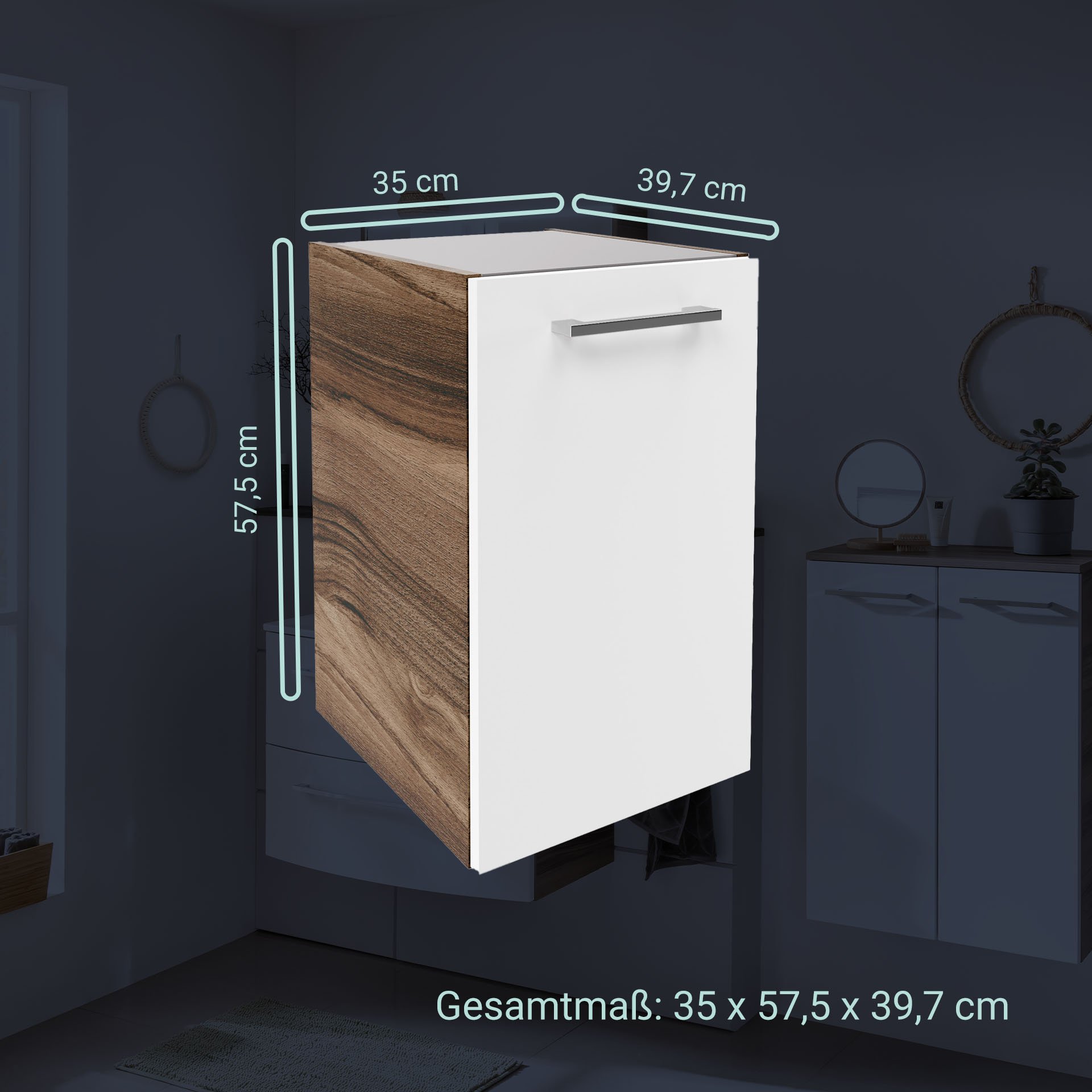 - Maße: 35 cm Breite, 57,5 cm Höhe, 39,7 cm Tiefe