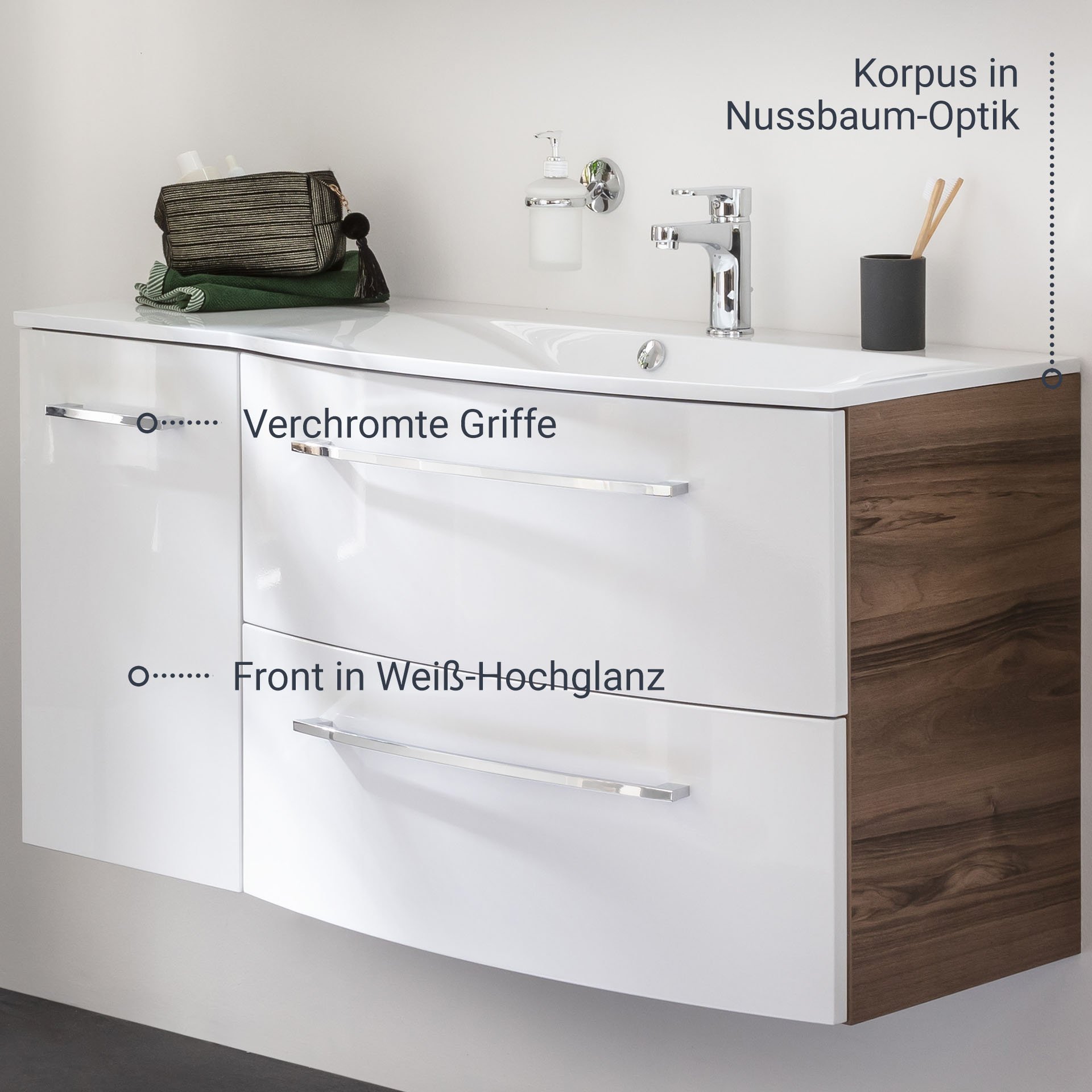- Design: Korpus Nussbaum, Front Weiß Hochglanz