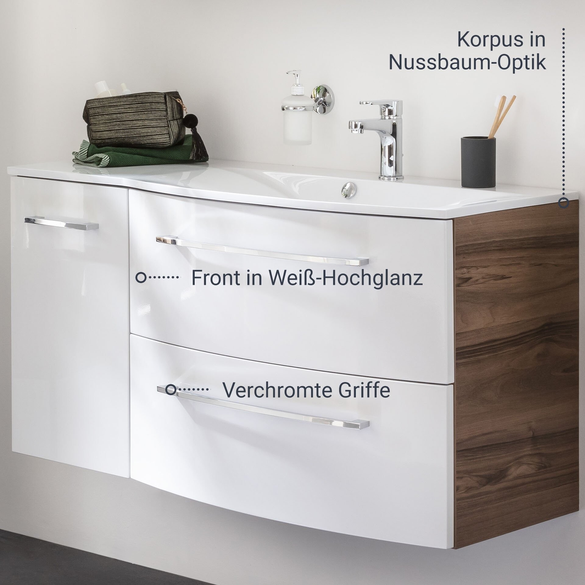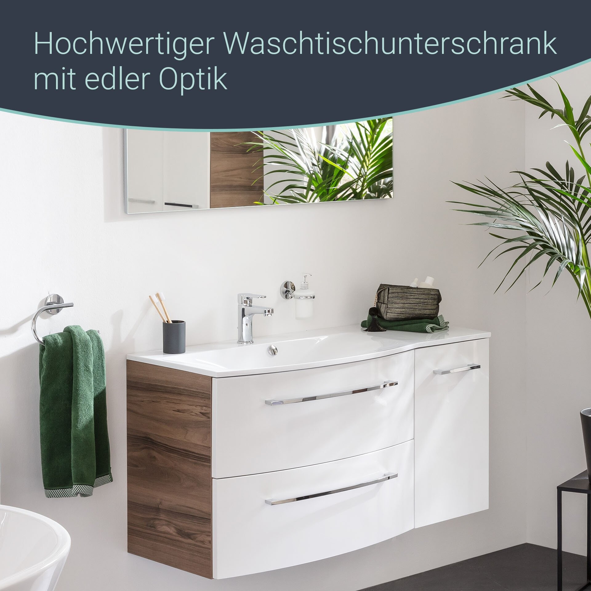 Die leicht geschwungene Front des 79,5 cm breiten Waschtischunterschranks aus der Serie VERONA von Fackelmann nimmt die Formensprache des Waschbeckens auf und bildet ein harmonisches Ensemble. Chromglänzende Stangengriffe auf der hochglänzend weißen Front verleihen dem Möbel Exklusivität. Der Korpus ist dem einzigartig gemaserten Edelholz Nussbaum nachempfunden. In Kombination mit der weißen Front entsteht ein edles und unverwechselbares Ambiente in Deinem Bad. Selbstverständlich sind beide Schubladen des Waschbeckenunterschranks mit einem modernen Soft-Close-System ausgestattet. Es gestattet ein nahezu lautloses Schließen der Schübe. Im geräumigen Innenraum finden Deine Badaccessoires einen geeigneten Platz und sind immer griffbereit. So schaffst Du Ordnung in Deinem Badezimmer. Passgenau für den Waschtischunterschrank sind das Glasbecken (Art.Nr. 73609) und der Gussmarmor Waschtisch (Art.Nr. 73600). Sie sind nicht im Lieferumfang enthalten und müssen separat bestellt werden. Badmöbel von Fackelmann werden mit viel Liebe zum Detail in Deutschland hergestellt. Der Fackelmann VERONA Waschbeckenunterschrank 79,4 cm breit, Braun Dunkel/Weiß Hochglanz ist vormontiert und kann so schnell und einfach in Dein neues Badezimmer einziehen.