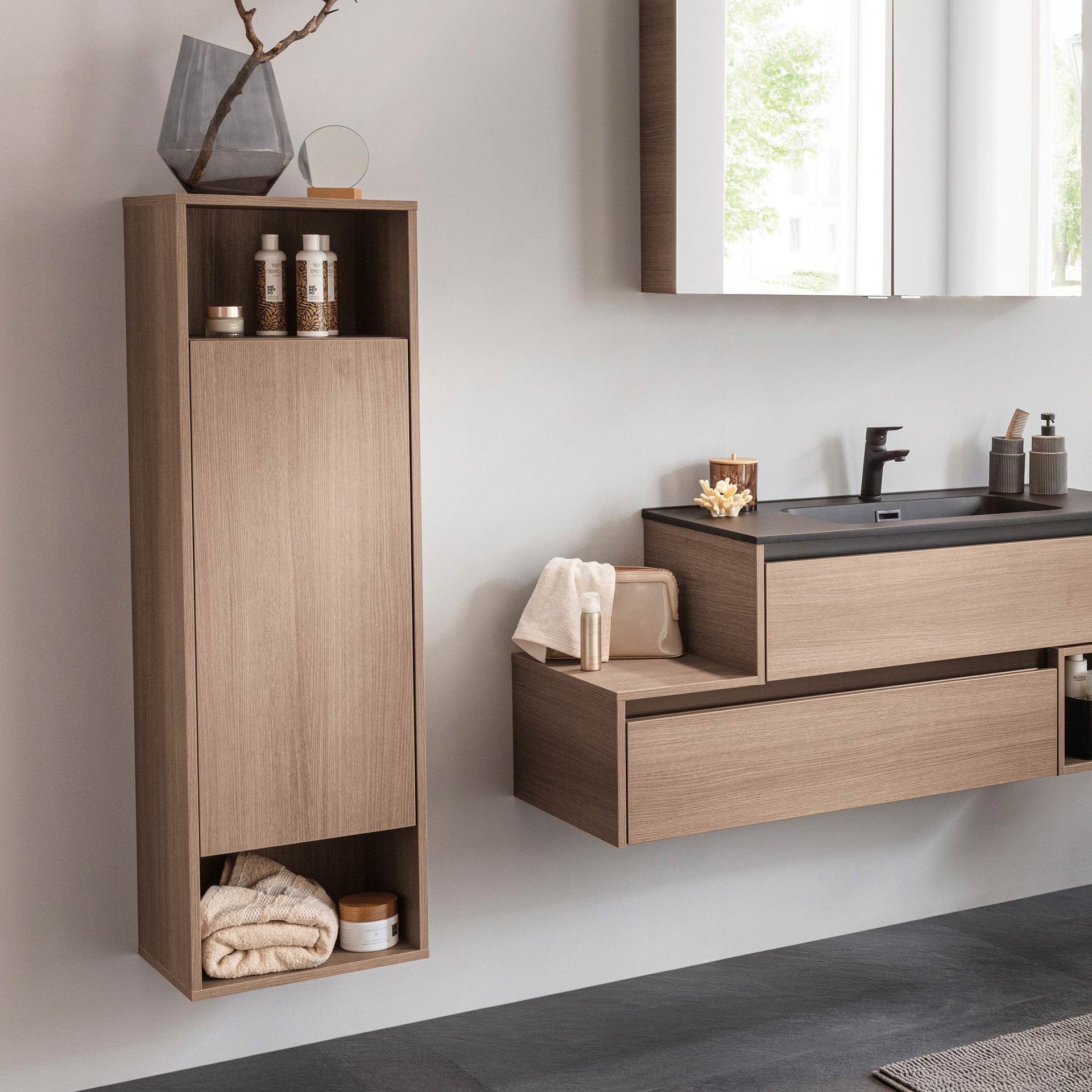 - Ausstattung: 1 Tür, Push-to-open-Technik, Türanschlag links, 2 offene Fächer, 2 Glaseinlegeböden