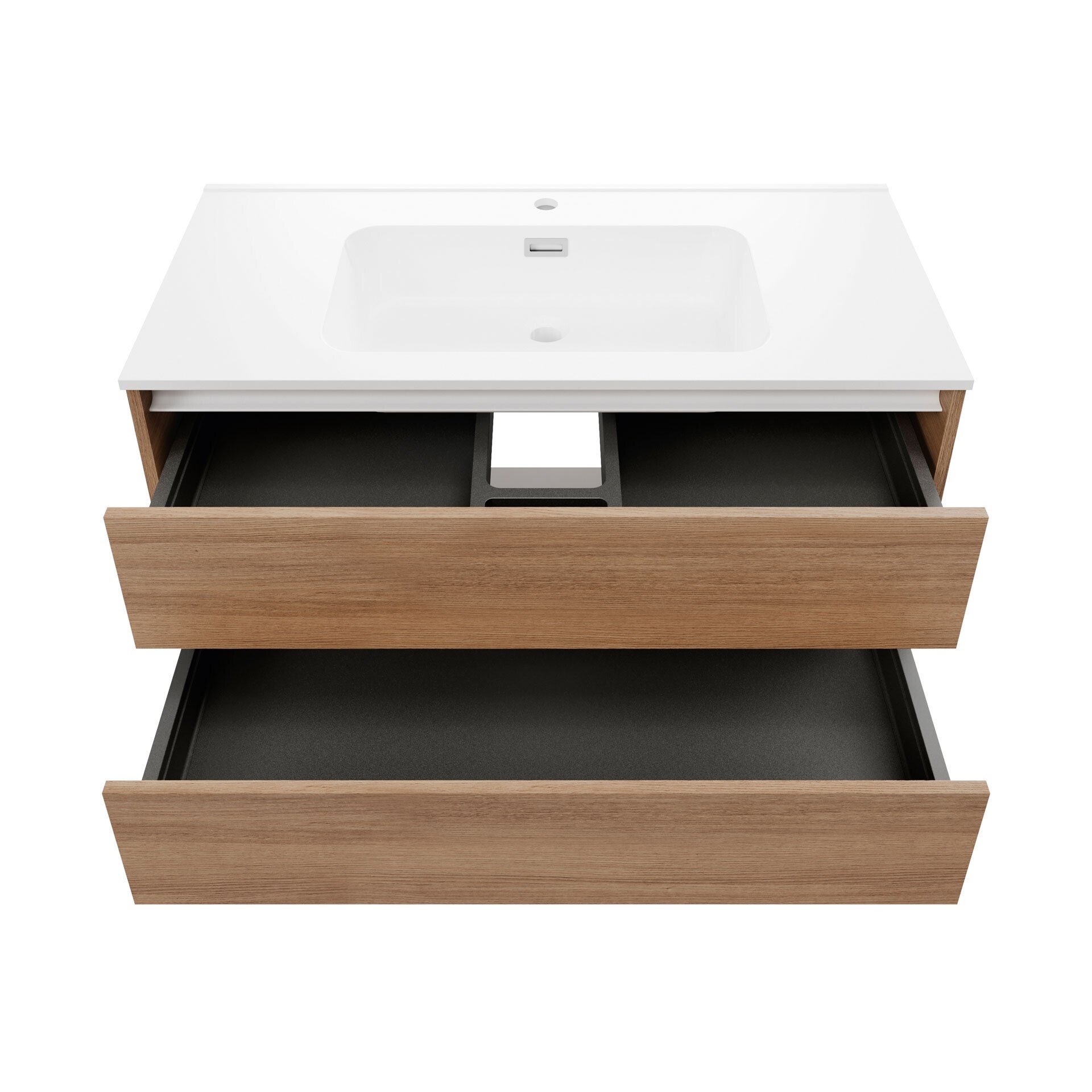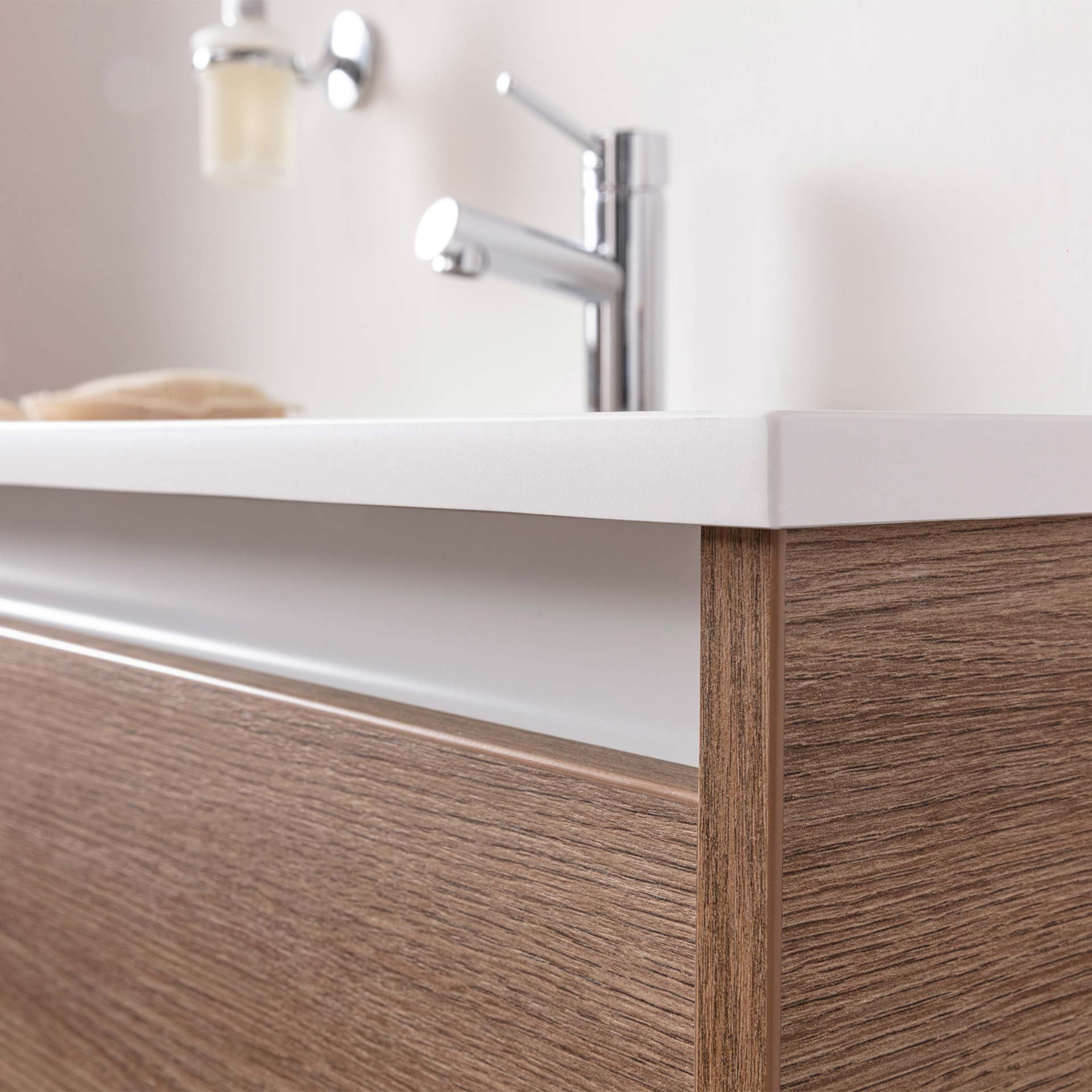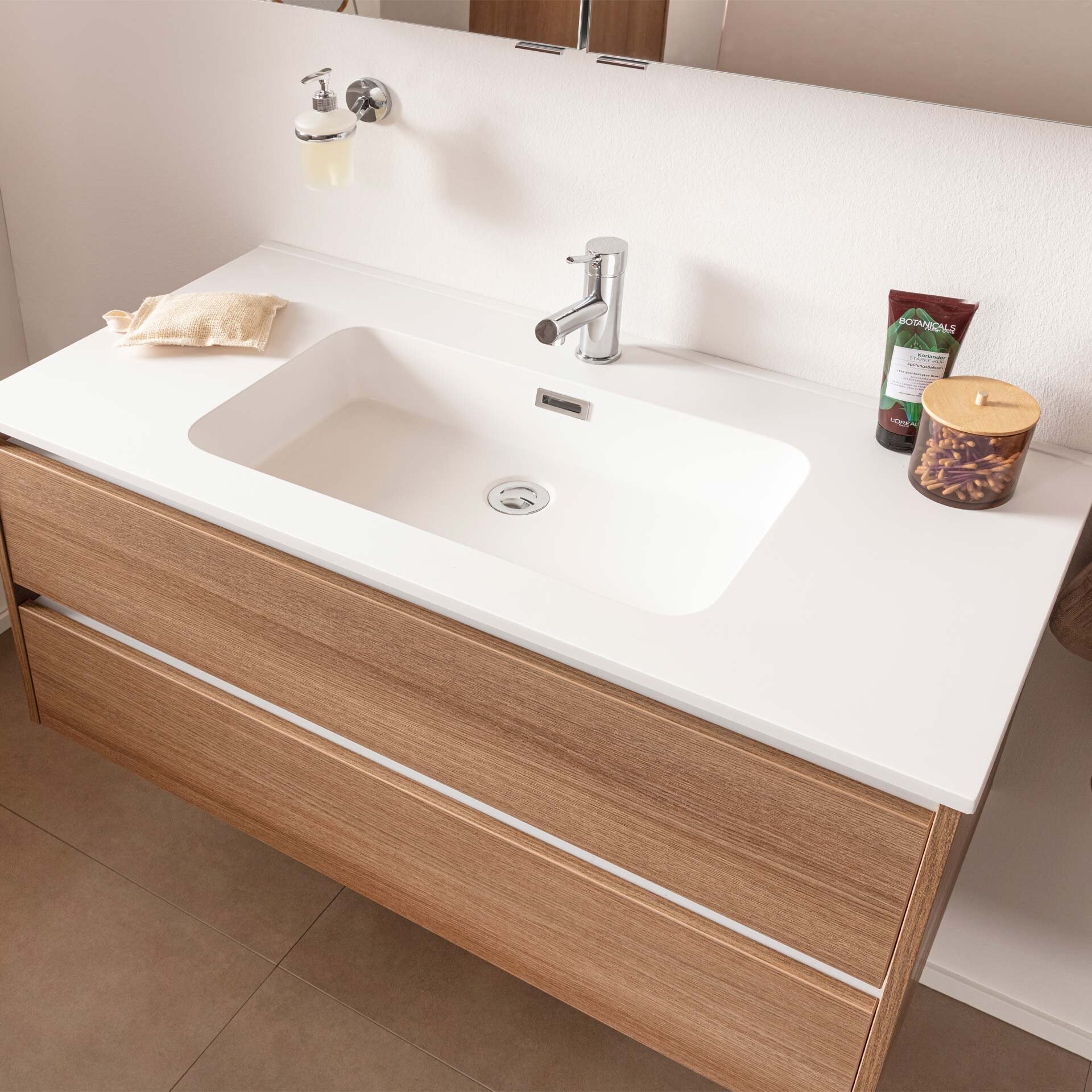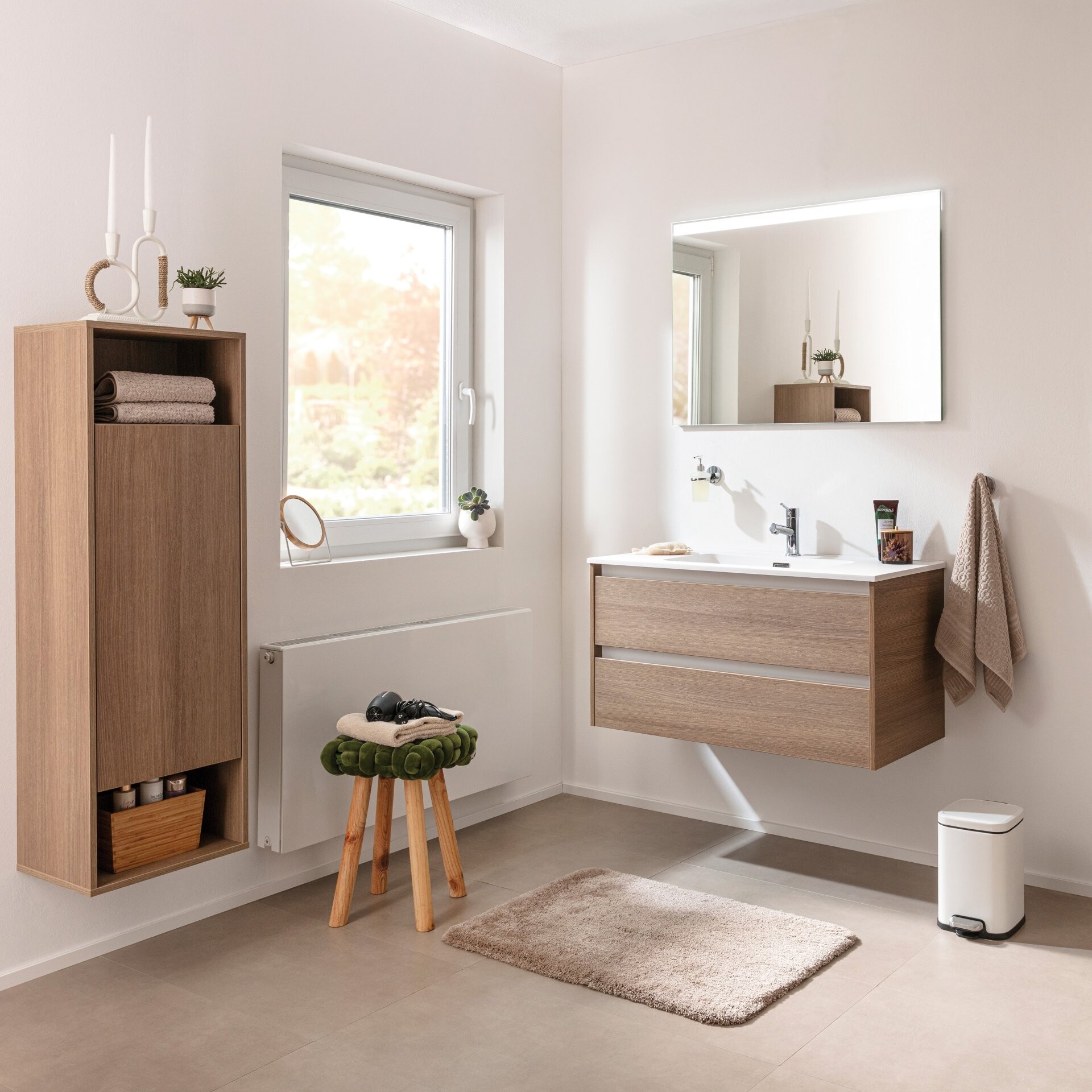 Strahlendes Weiß trifft auf die beruhigende Holzstruktur der Eiche. Ein perfektes Ensemble für Dein Badezimmer mit WOW-Effekt. Mit dem zweiteiligen Badmöbelset aus der Serie VITA von Fackelmann holst Du Dir Funktionalität und stilvolle Eleganz in Dein Bad. Das Set für Dein Badezimmer besteht aus einem hochwertigen Waschbecken aus robustem Gussmarmor und einem Waschtischunterschrank für Ordnungsliebhaber. Zwei voll ausziehbare Schubladen bieten Dir den Stauraum, den Du Dir schon immer gewünscht hast. Deine Badaccessoires, wie Handtücher oder Kosmetikartikel, sind perfekt aufgeräumt und übersichtlich organisiert. Die grifflose Optik setzt den hellen braunen Farbton der Eiche perfekt in Szene. Formvollendet sitzt das weiße Waschbecken aus Gussmarmor auf dem Waschtischunterschrank. Gussmarmor besticht durch seine makellose, matte Oberfläche, die Deinem Bad einen modernen und edlen Look verleiht. Auf Grund seiner Beschaffenheit lässt sich Gussmarmor besonders leicht reinigen und bleibt hygienisch sauber. Badmöbel von Fackelmann werden mit viel Liebe zum Detail in Deutschland hergestellt. Qualität Made in Germany!. Das FACKELMANN VITA Waschbecken mit Unterschrank 101 cm breit, Braun hell, Waschbecken Gussmarmor Weiß matt vereint modernes Design mit durchdachter Funktionalität und hochwertiger Verarbeitung. Mit Deiner Entscheidung für dieses zweiteilige, vormontierte Set triffst Du die perfekte Wahl für Stil und Komfort. Denn es ist schnell und einfach in Deinem Badezimmer integriert.