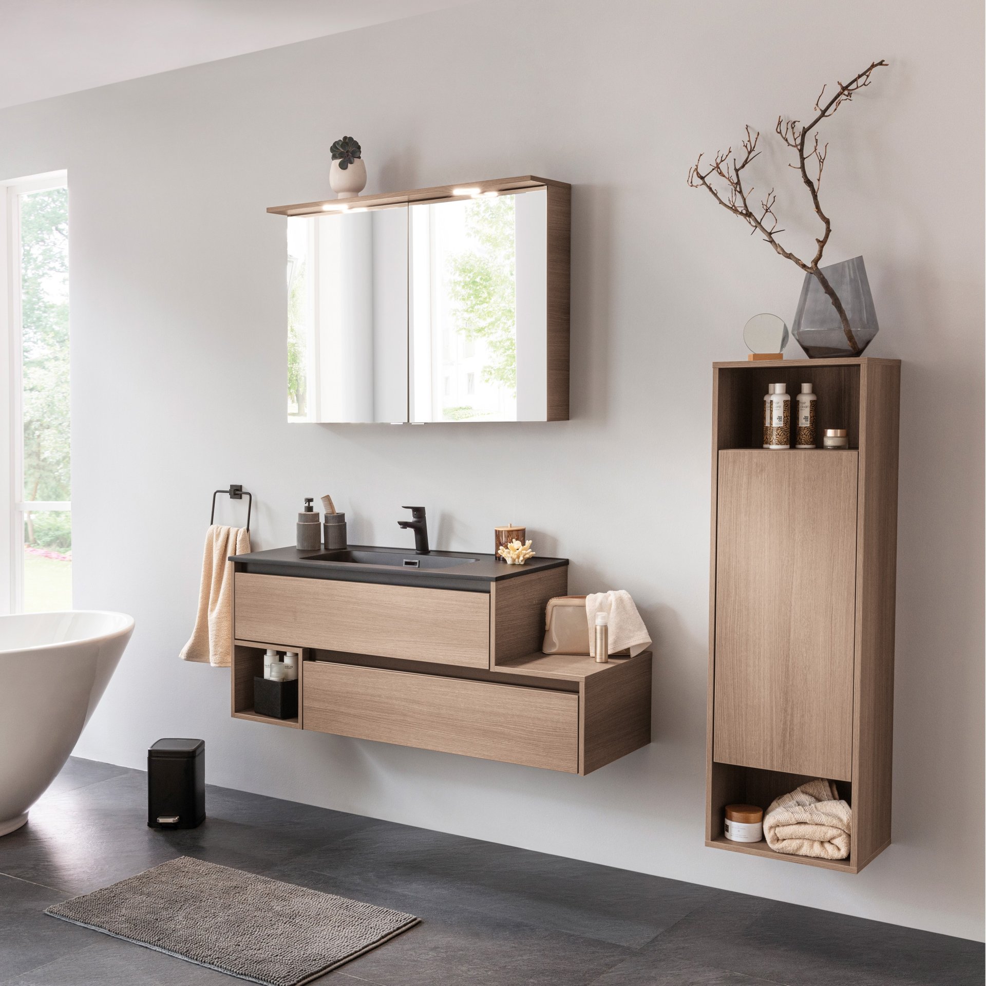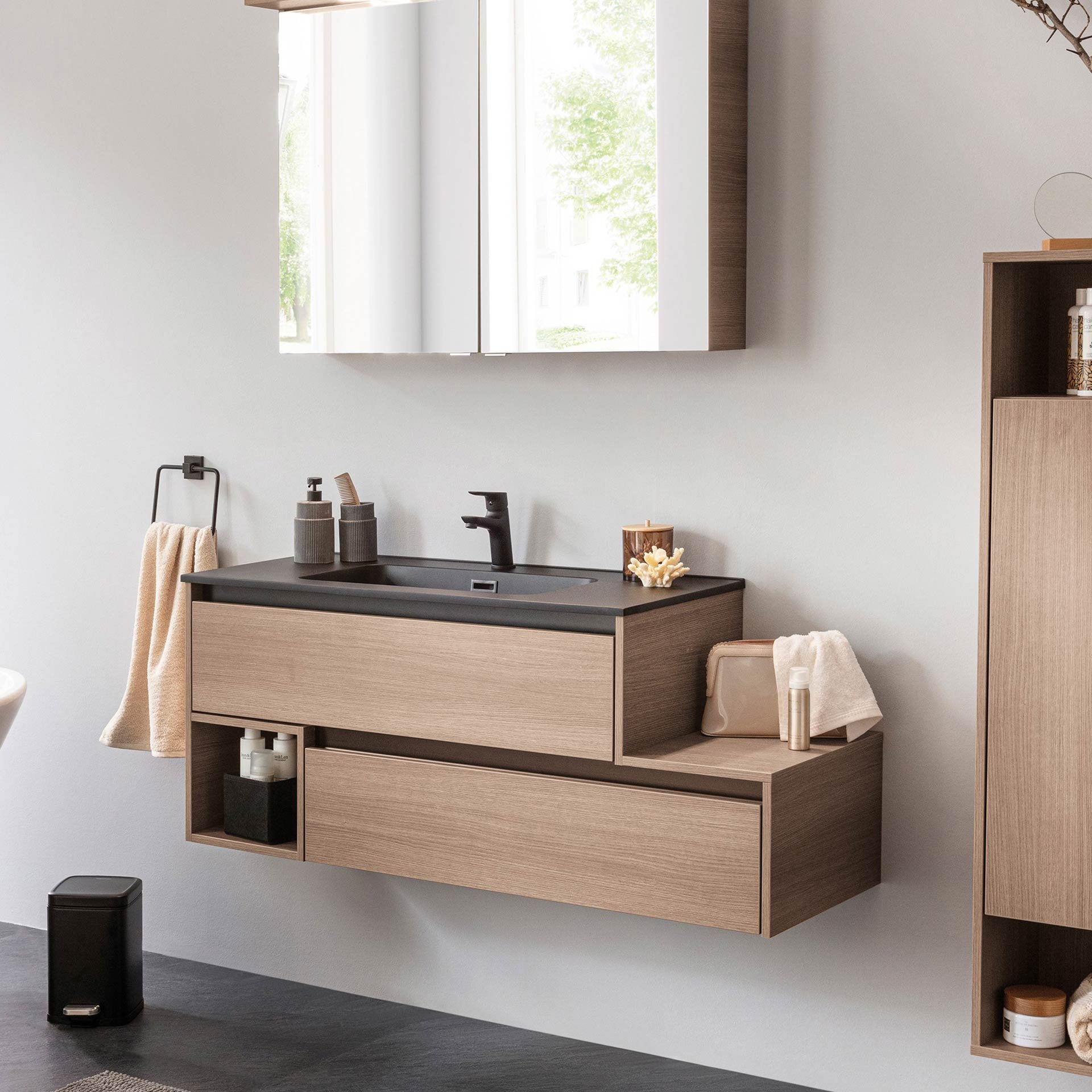 Du willst ein Statement setzen und suchst nach einem exklusiven Blickfang für Dein Badezimmer? Dann hast Du mit dem 129 cm breiten asymmetrischen Waschtischunterschrank und Waschtisch aus der Serie VITA von Fackelmann mit schwarzen Blenden genau das Richtige gefunden! Ein asymmetrisches Ensemble für Dein Badezimmer mit WOW-Effekt. Mit dem zweiteiligen Badmöbelset aus der Serie VITA von Fackelmann holst Du Dir Funktionalität und stilvolle Eleganz in Dein Bad. Das Set für Dein Badezimmer besteht aus einem hochwertigen Waschbecken aus robustem Gussmarmor und einem asymmetrischen Waschtischunterschrank für Ordnungsliebhaber. Durch die Asymmetrie entsteht eine Ablagefläche auf der rechten Seite und auf der linken Seite ein offenes Regal. Inspiration für individuelle Dekorationen. Zwei voll ausziehbare Schubladen bieten Dir den Stauraum, den Du Dir schon immer gewünscht hast. Deine Badaccessoires, wie Handtücher oder Kosmetikartikel, sind perfekt aufgeräumt und übersichtlich organisiert. Die grifflose Optik setzt den hellen braunen Farbton der Eiche perfekt in Szene. Formvollendet sitzt das schwarze Waschbecken aus Gussmarmor mit einer samtigen Oberfläche auf dem Waschtischunterschrank. Gussmarmor besticht durch seine makellose, matte Oberfläche, die Deinem Bad einen modernen und edlen Look verleiht. Auf Grund seiner Beschaffenheit lässt sich Gussmarmor besonders leicht reinigen und bleibt hygienisch sauber. Badmöbel von Fackelmann werden mit viel Liebe zum Detail in Deutschland hergestellt. Qualität Made in Germany! Das FACKELMANN VITA Waschbecken mit Unterschrank 129 cm breit, Braun hell, Waschbecken Gussmarmor Schwarz matt, Ablage rechts, asymmetrisch vereint modernes Design mit durchdachter Funktionalität und hochwertiger Verarbeitung. Mit Deiner Entscheidung für dieses zweiteilige, vormontierte Set triffst Du die perfekte Wahl für Stil und Komfort. Es ist schnell und einfach in Deinem Badezimmer integriert.