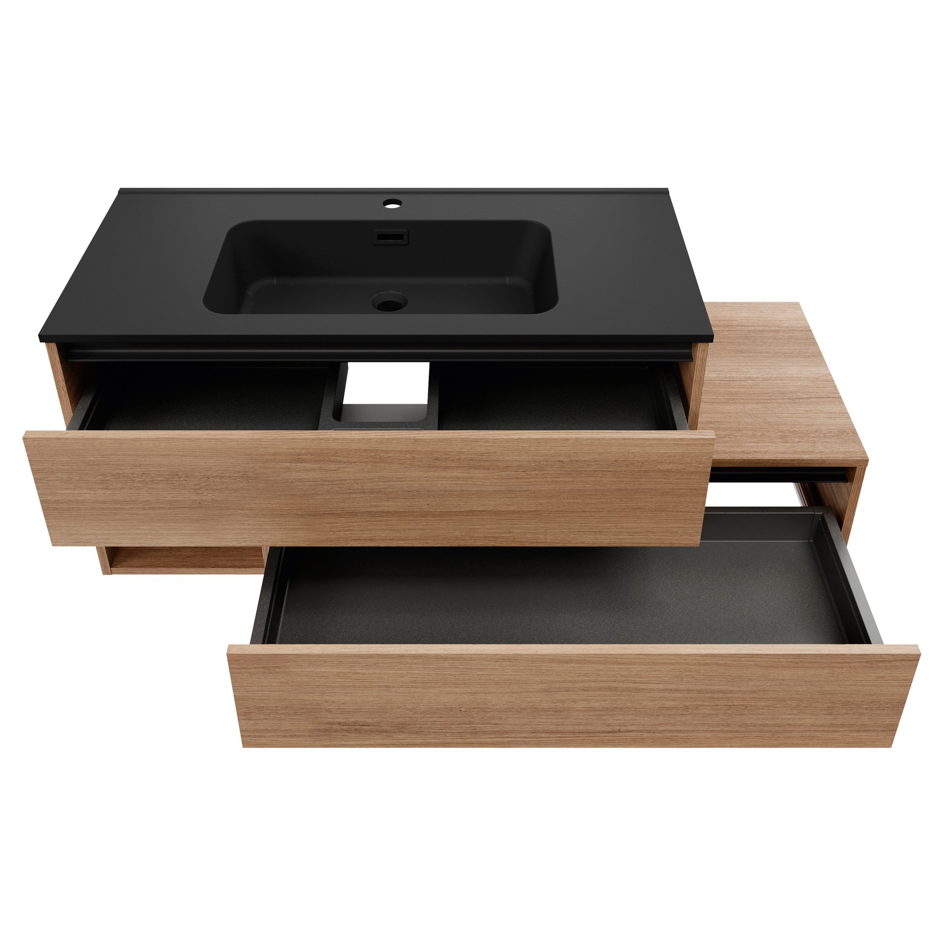 - Ausstattung: 2 Schubladen mit Soft-Close-System, 2 schwarze Griffleisten, 1 Fach, Ablage rechts