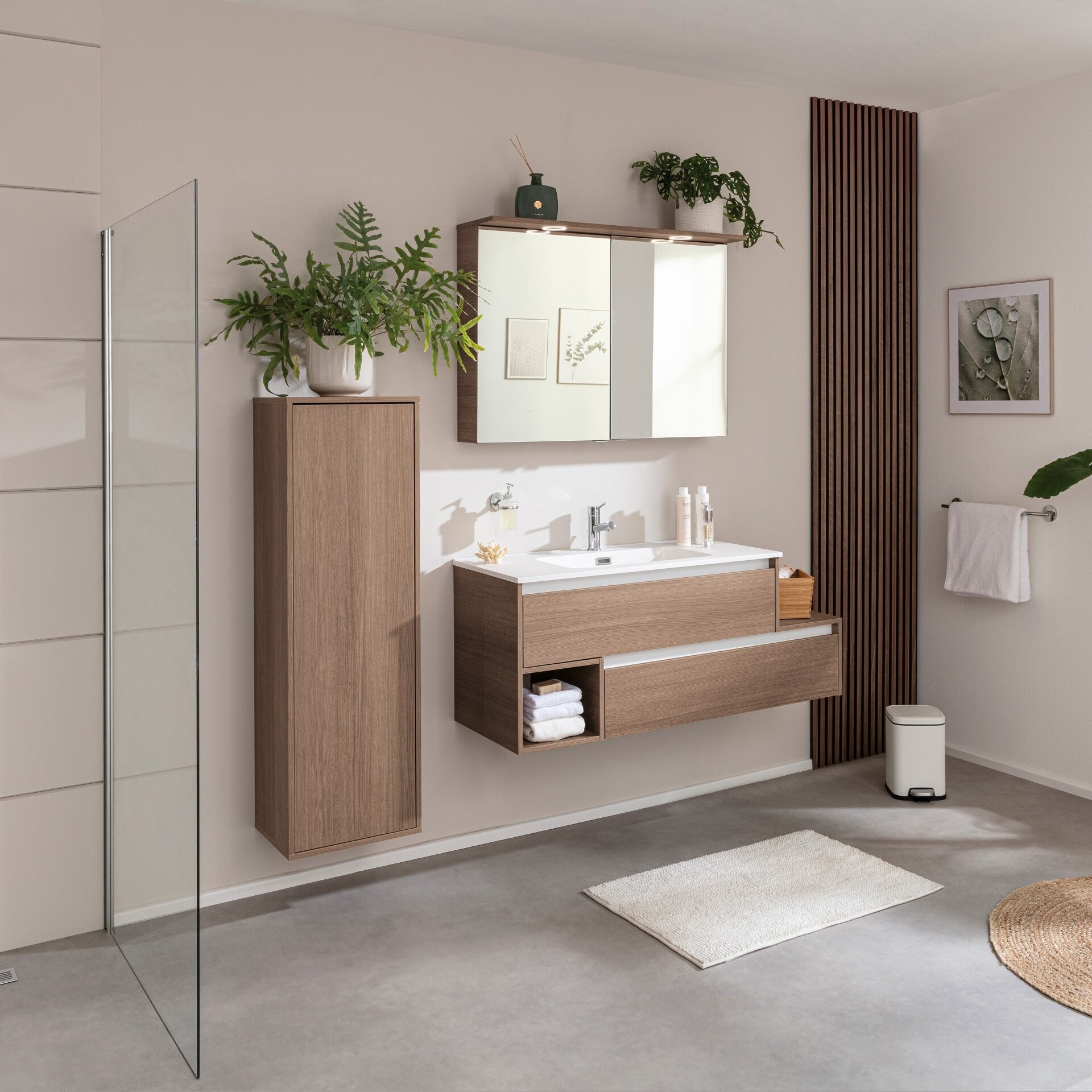 Strahlendes Weiß trifft auf die beruhigende Holzstruktur der Eiche. Ein asymmetrisches Ensemble für Dein Badezimmer mit WOW-Effekt. Mit dem zweiteiligen Badmöbelset aus der Serie VITA mit weißer Blende von Fackelmann holst Du Dir Funktionalität und stilvolle Eleganz in Dein Bad. Das Set für Dein Badezimmer besteht aus einem hochwertigen Waschbecken aus robustem Gussmarmor und einem asymmetrischen Waschtischunterschrank für Ordnungsliebhaber. Durch die Asymmetrie entsteht eine Ablagefläche auf der rechten Seite und auf der linken Seite ein offenes Regal. Inspiration für individuelle Dekorationen. Zwei voll ausziehbare Schubladen bieten Dir den Stauraum, den Du Dir schon immer gewünscht hast. Deine Badaccessoires, wie Handtücher oder Kosmetikartikel, sind perfekt aufgeräumt und übersichtlich organisiert. Die grifflose Optik setzt den hellen braunen Farbton der Eiche perfekt in Szene. Formvollendet sitzt das weiße Waschbecken aus Gussmarmor auf dem Waschtischunterschrank. Gussmarmor besticht durch seine makellose, matte Oberfläche, die Deinem Bad einen modernen und edlen Look verleiht. Auf Grund seiner Beschaffenheit lässt sich Gussmarmor besonders leicht reinigen und bleibt hygienisch sauber. Badmöbel von Fackelmann werden mit viel Liebe zum Detail in Deutschland hergestellt. Qualität Made in Germany! Das FACKELMANN VITA Waschbecken mit Unterschrank 129 cm breit, Braun hell, Waschbecken Gussmarmor Weiß matt, Ablage rechts, asymmetrisch vereint modernes Design mit durchdachter Funktionalität und hochwertiger Verarbeitung. Mit Deiner Entscheidung für dieses zweiteilige, vormontierte Set triffst Du die perfekte Wahl für Stil und Komfort. Es ist schnell und einfach in Deinem Badezimmer integriert.