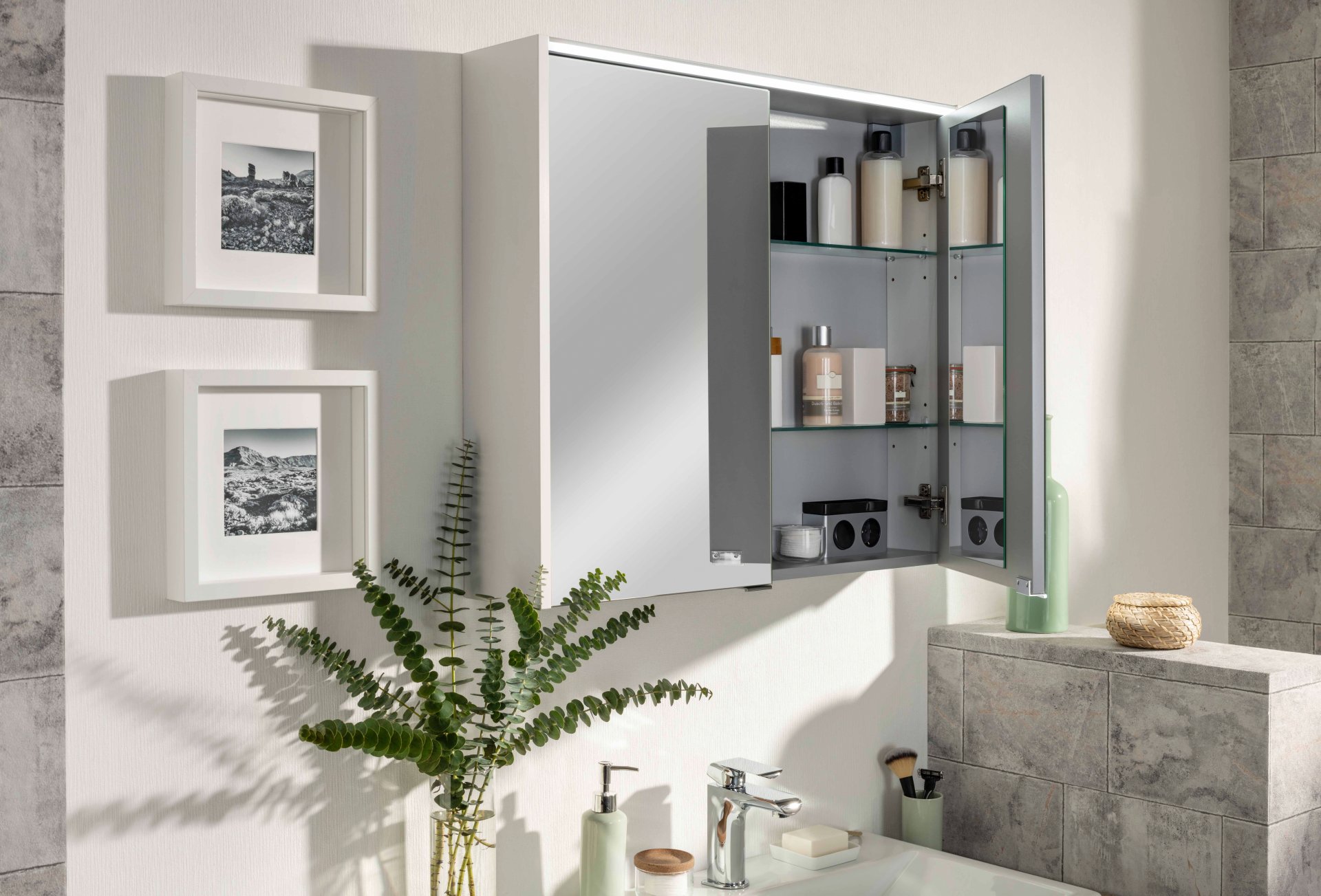 - Besonderheit: Farbtemperatur Kaltweiß, Softclose, Anschlag der Spiegeltüren frei wählbar, Rückwand silbergrau, Kanten der Spiegeltür Alu-Optik