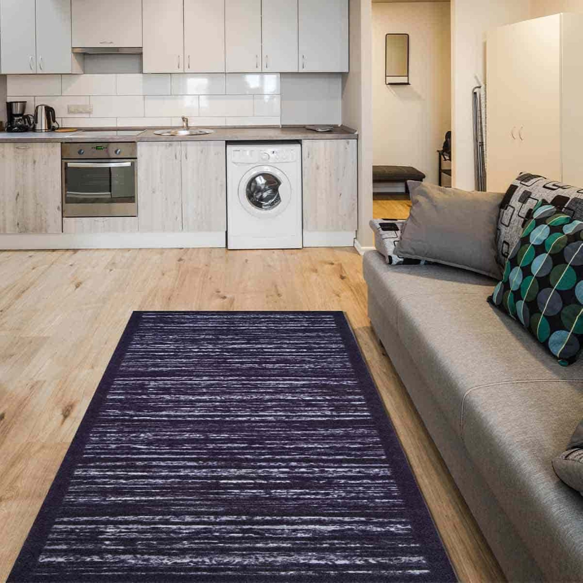 Kaufen Sie den praktischen Allround-Teppich HAMADA, die dezenten Farbtöne des gestromten Motivs ergänzen geschmackvoll jedes Interieur. Wählen Sie aus verschiedenen Größen. Perfekt auch als Läufer zur Küchenzeile. Hohe Verschleißfestigkeit. Der Teppich ist für Stellen mit mittlerer bis höherer Gehfrequenz geeignet. Der Polyamidflor des Teppichs ist weich beim Auftreten und wird zu Ihrem Lieblingshelfer in jedem Haushalt. Der GRUND Allround-Teppich ist mit einer Antirutschschicht auf der Rückseite versehen. Sie können ihn ohne Angst vor Ausrutschen und gefährlichem Sturz benutzen. Bei Verschmutzung waschen Sie einfach den Teppich bei 40 °C in der Waschmaschine. Ihr Motiv wird dadurch nicht beschädigt, die Farben bleiben schön kräftig.