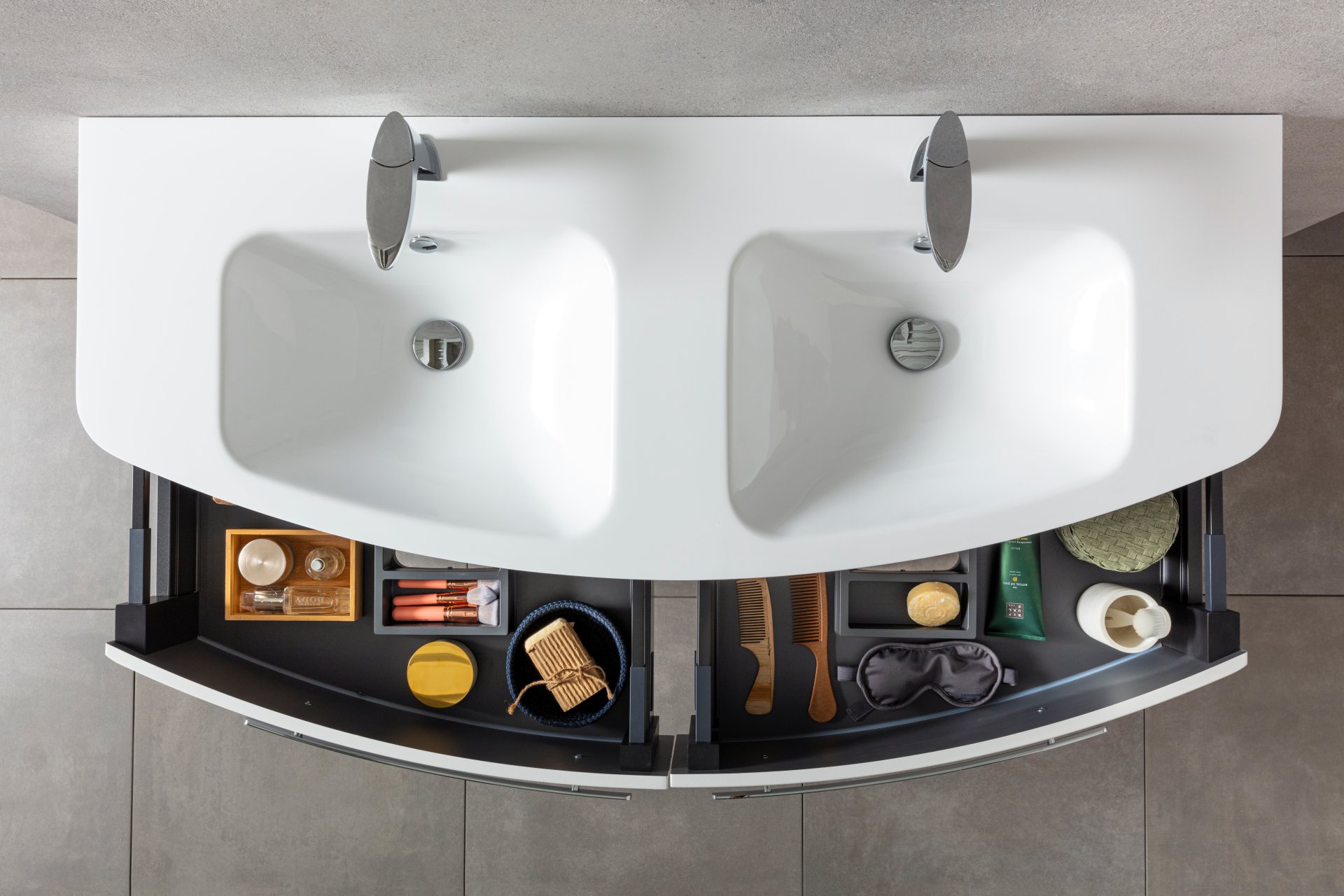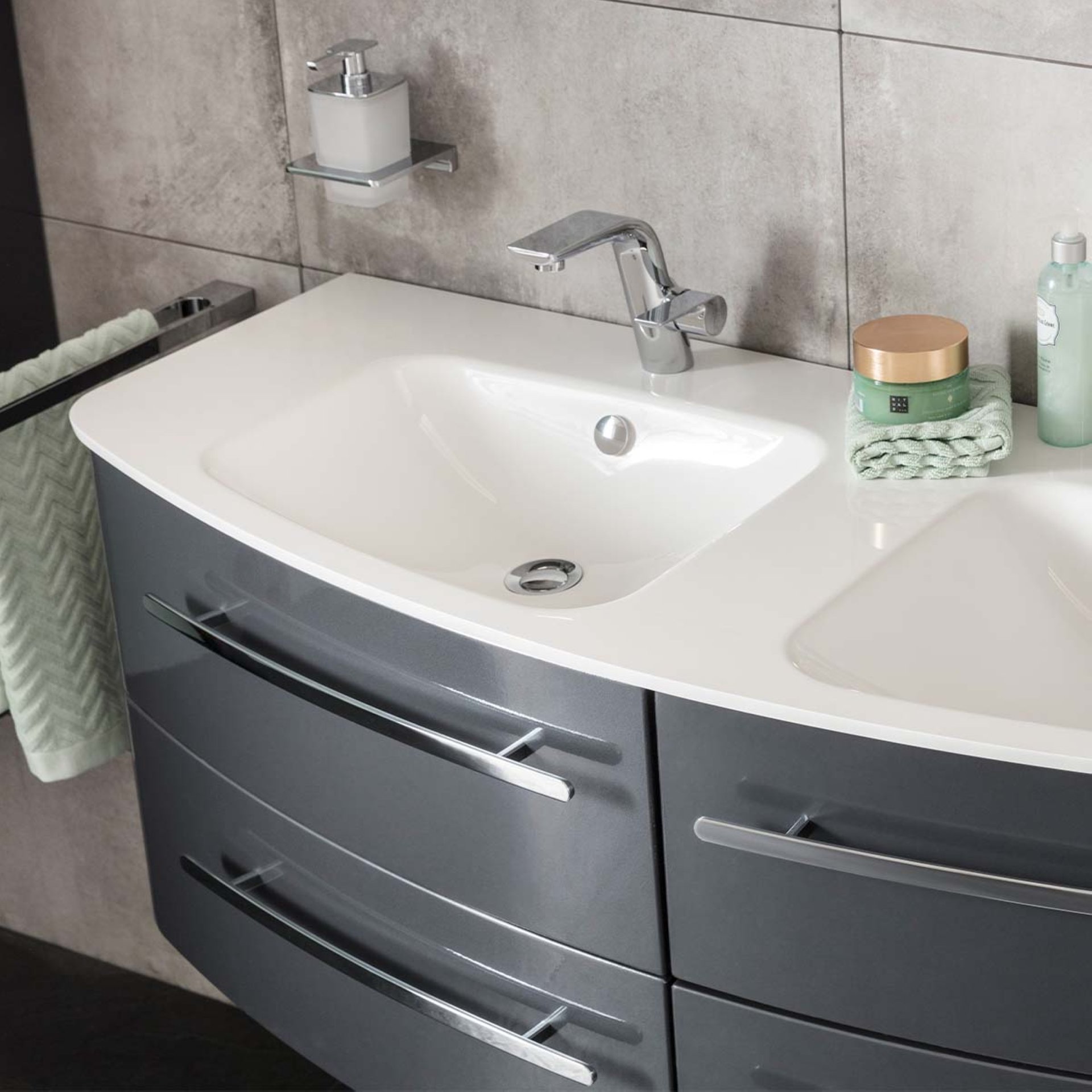 Aufgrund der asymmetrischen Form überzeugt die Badmöbel Serie CLASSICO von Lanzet durch ihr klassisches Design. Dein verfügbarer Platz im Badezimmer wird durch die geschwungene Formgestaltung perfekt ausgeschöpft. Das Dekor des 140 cm breiten Waschplatzes überzeugt mit der Trendfarbe Schwarz-Anthrazit, welche durch eine hochglänzende Front in Szene gesetzt wird. Vier Schubladen mit Einzugsdämpfern und chromglänzenden Griffen sind Teil Deines vormontierten Möbelstücks. Der dazugehörige Doppel-Waschtisch aus Mineralguss in Weiß ist wegen seiner glatten Oberfläche äußerst pflegeleicht und ein richtiger Hingucker. Der Doppelwaschtisch verfügt über Hahnlochbohrungen und integriertem Beckenüberlauf. Durch die verzerrte Positionierung der Becken entstehen links, rechts und mittig jeweils Ablageflächen. Hier findet Dein Seifenspender oder Kosmetikspiegel seinen perfekten Platz. Benötigst Du zusätzlichen Stauraum, kannst Du Dein 2-teiliges Badmöbel-Set Lanzet CLASSICO Badmöbel Set 2-teilig, Doppel-Waschtisch 140 cm breit, Anthrazit, Weiß auch mit dem passenden Spiegelschrank (Art. Nr. 7971912) ausstatten. Qualität Made in Germany! Mit viel Liebe zum Detail von fachkundigen Mitarbeitern entwickelt und hergestellt.