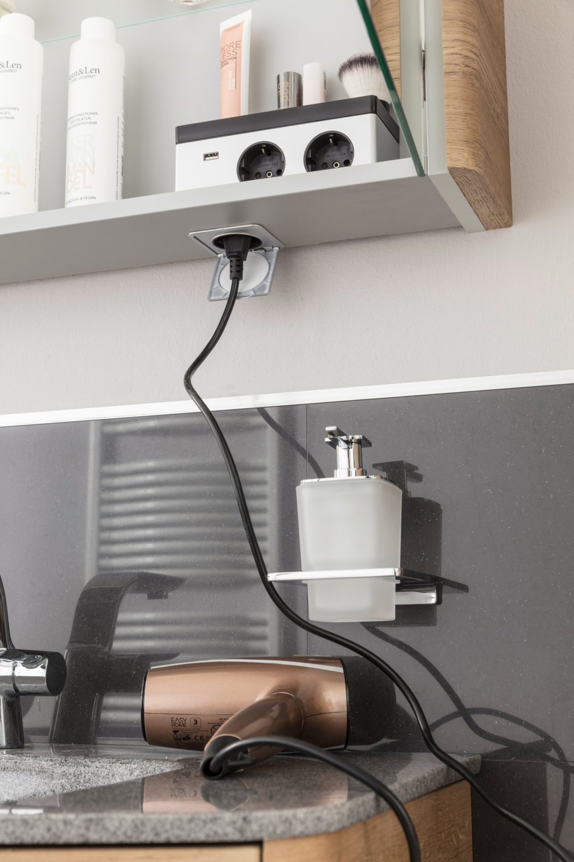 - 2x Magic E-Box bestehend aus: 2 Steckdosen, 1 USB-Anschluss, 1 Außensteckdose mit Klappe, 1 Ablageschale und 1 Sensorschalter