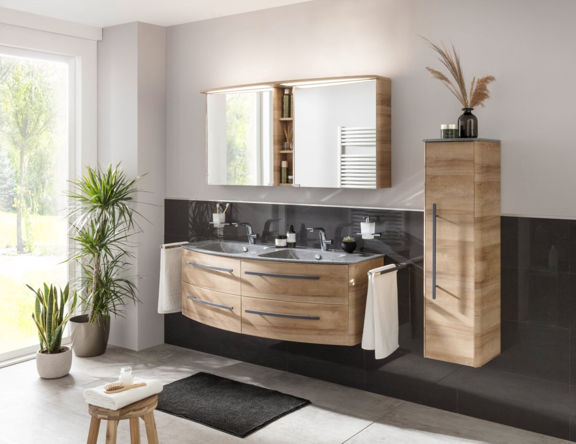 Du bist auf der Suche nach einem Spiegelschrank der Extraklasse? Dann hast Du mit dem 142 cm breiten CLASSICO Spiegelschrank im Design Berg Eiche von Lanzet genau das Richtige gefunden. Sehr auffällig und damit ein Blickfang ist das Zwischenregal mit zwei Ablageböden. Hier dekorierst Du Dein Designobjekt ganz individuell. Zwei grifflose Spiegeltüren lassen sich durch einen leichten Überstand im unteren Bereich bequem öffnen. Gedämpfte Scharniere sorgen für einen sanften Schließvorgang. Auf Grund der cleveren Aufteilung im Innenraum bekommen Deine Badaccessoires Struktur und sind immer griffbereit. Öffnest Du die innen verspiegelten Türen entsteht ein 3D-Effekt. So wird das Styling zu einem neuen, einzigartigen Erlebnis. Weiterhin überzeugt der Innenraum mit seiner modernen, fortschrittlichen Technik. An der Magic E-Box lassen sich elektrische Geräte problemlos anschließen und der USB Anschluss rundet die technischen Details ab. Mit dem geschwungenen LED-Leuchtpaneel erhältst Du ausreichend Licht auf die Spiegelfläche. Fast schon selbstverständlich scheint da das stufenlose Dimmen der Beleuchtung. Ein nahezu unsichtbarer Touchpoint im unteren Teil des Korpus ermöglicht diese Funktion. Seit mehr als 150 Jahren produziert die Firma Lanzet Badmöbel in Deutschland. Das spricht für Kompetenz und Erfahrung auf hohem Niveau. Qualität Made in Germany - von engagierten und fachkundigen Mitarbeitern entwickelt und hergestellt.