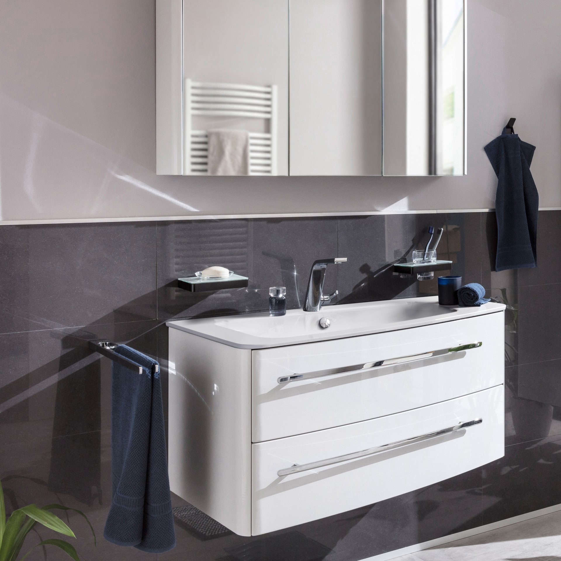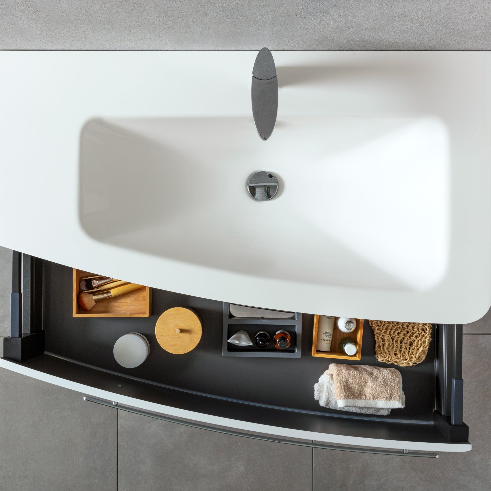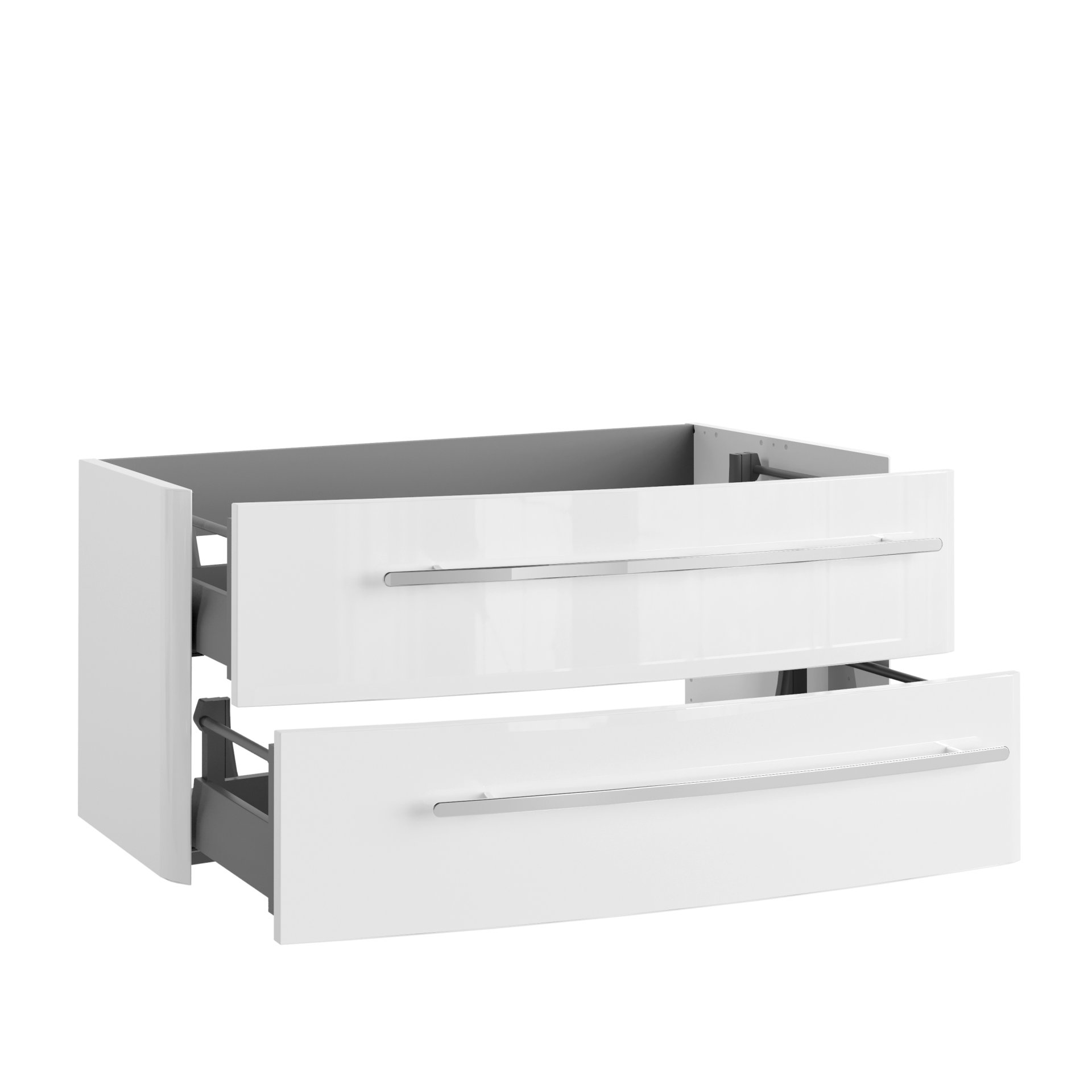 Ein asymmetrisch geschwungener Waschtischunterschrank wertet nicht nur Dein Badezimmer auf, sondern er zeugt von einem individuellen Gespür für das Besondere. Der 100 cm breite weiße Waschtischunterschrank aus der Serie CLASSICO von Lanzet ist auf der linken Seite 32,1 cm tief und auf der anderen Seite 52,4 cm. Aus dieser Asymmetrie ergibt sich die geschwungene Form der beiden Auszüge. Die großzügigen Auszüge bieten ausreichend Stauraum für Deine Badaccessoires. So ist alles ordentlich aufgeräumt und immer griffbereit. Dank der integrierten Einzugsdämpfung schließen die beiden Schubladen nahezu geräuschlos. Formvollendet passen auf den eleganten Waschtischunterschrank das weiße Mineralgusswaschbecken (Art.Nr. 7965512) und der Waschtisch in Grau Metallic (Art.Nr. 7968312) der Firma Lanzet. Der Lanzet CLASSICO Waschtischunterschrank 100 cm Weiß, links kombiniert erstklassiges Design mit herausragender Funktionalität. Badmöbel von Lanzet werden in Deutschland von fachkundigen Personal hergestellt und entwickelt. Sie werden vormontiert geliefert. Das spart Zeit und sorgt für eine einfache Integration in Dein Badezimmer.