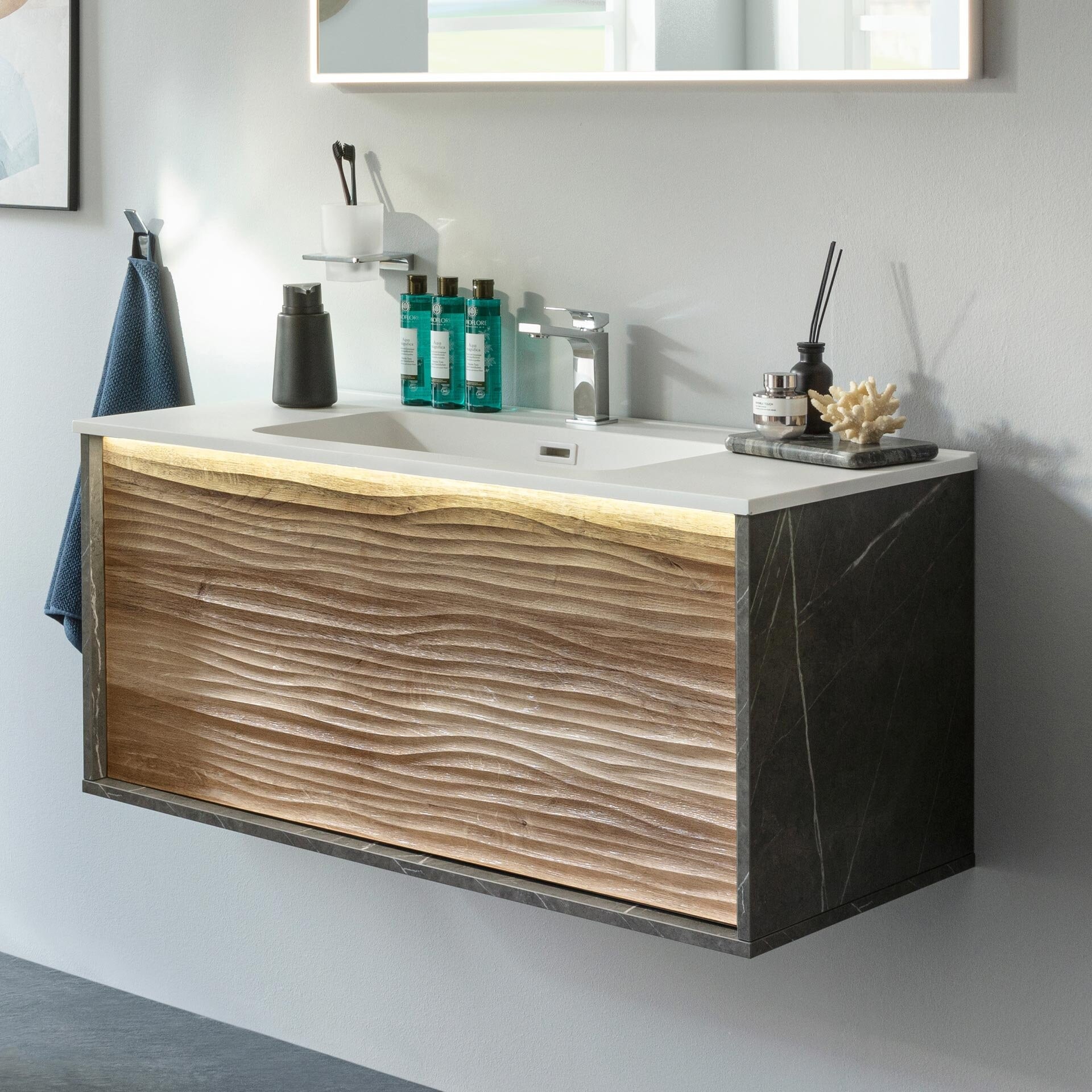 Holz trifft Stein. Eine Front, die in ihrer Struktur an sanfte Brandungswellen erinnert. Korpus in Marmoroptik mit täuschend echter Nähe zum Stein. Diese zwei natürlichen Optiken wurden von den Designern bei dem Waschtischunterschrank aus der Serie DUNE von Lanzet miteinander verheiratet. Herausgekommen ist dabei eine einzigartige Harmonie mit luxuriöser Ausstrahlung. Die 100 cm breite Großraumschublade in Berg Eiche mit einer einzigartigen Haptik wird durch ein LED Band mit Bewegungsmelder illuminiert. Unterschiedliche Strukturen und Linien der Front kommen so eindrucksvoll zur Geltung. Das wohltuende Licht ist Blickfang und Orientierungshilfe in der Dämmerung. Marmor Grau mit unterschiedlichen Schattierungen prägen den Korpus des Unterschranks. In der Schublade finden nicht nur Deine Badaccessoires einen passenden Platz. Die grifffreie Front ist die perfekte Bühne für die Wellenstruktur. Einzigartig, edel und exquisit! Mit der innovativen Push-to-open Technik öffnet sich die Schublade leicht und schließt mit dem Soft-Close Mechanismus sanft. Das Design setzt Maßstäbe in Deinem Bad. Erstklassige Verarbeitung und die Verwendung hochwertiger Materialien des LANZET DUNE Waschbeckenunterschrank 100,3 cm breit, Marmor Grau/Braun hell, inkl. LED Beleuchtung garantieren Langlebigkeit und Beständigkeit. Hier stimmt einfach alles! Das Design! Die Qualität! Die Verarbeitung! Lanzet Badmöbel werden mit viel Liebe zum Detail in Deutschland gefertigt und für Dich vormontiert. Damit finden Sie schnell einen Platz in Deinem modernen Badezimmer.