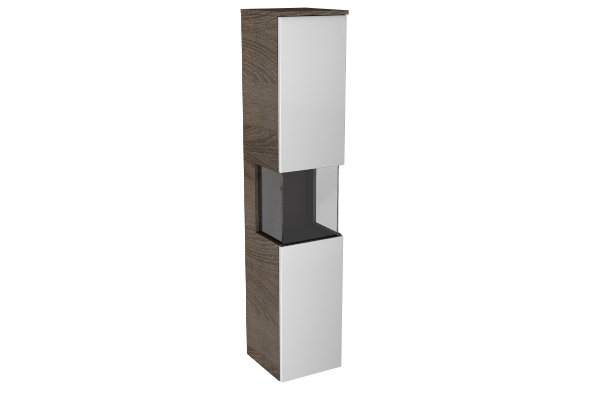 Der in Dunkelbraun gehaltene Hochschrank von Lanzet verleiht Deinem Badezimmer ein edles Aussehen und ist die perfekte Ergänzung zu den Lanzet Waschtischunterschränken. Die hellen Fronten in Weiß Hochglanz bieten einen angenehmen Kontrast zum dunklen Korpus. Der Blickfang ist die Glasfront in der Mitte des Hochschranks sowie die LED-Beleuchtung. Im Design zeitlos und formschön gestaltet bietet der Schrank dank mehrerer Ablagefächer genügend Stauraum und ermöglicht eine praktische Verstauung der Handtücher oder sonstiger Baduntensilien. Der Hochschrank von Lanzet ist auch mit Türanschlag links verfügbar.