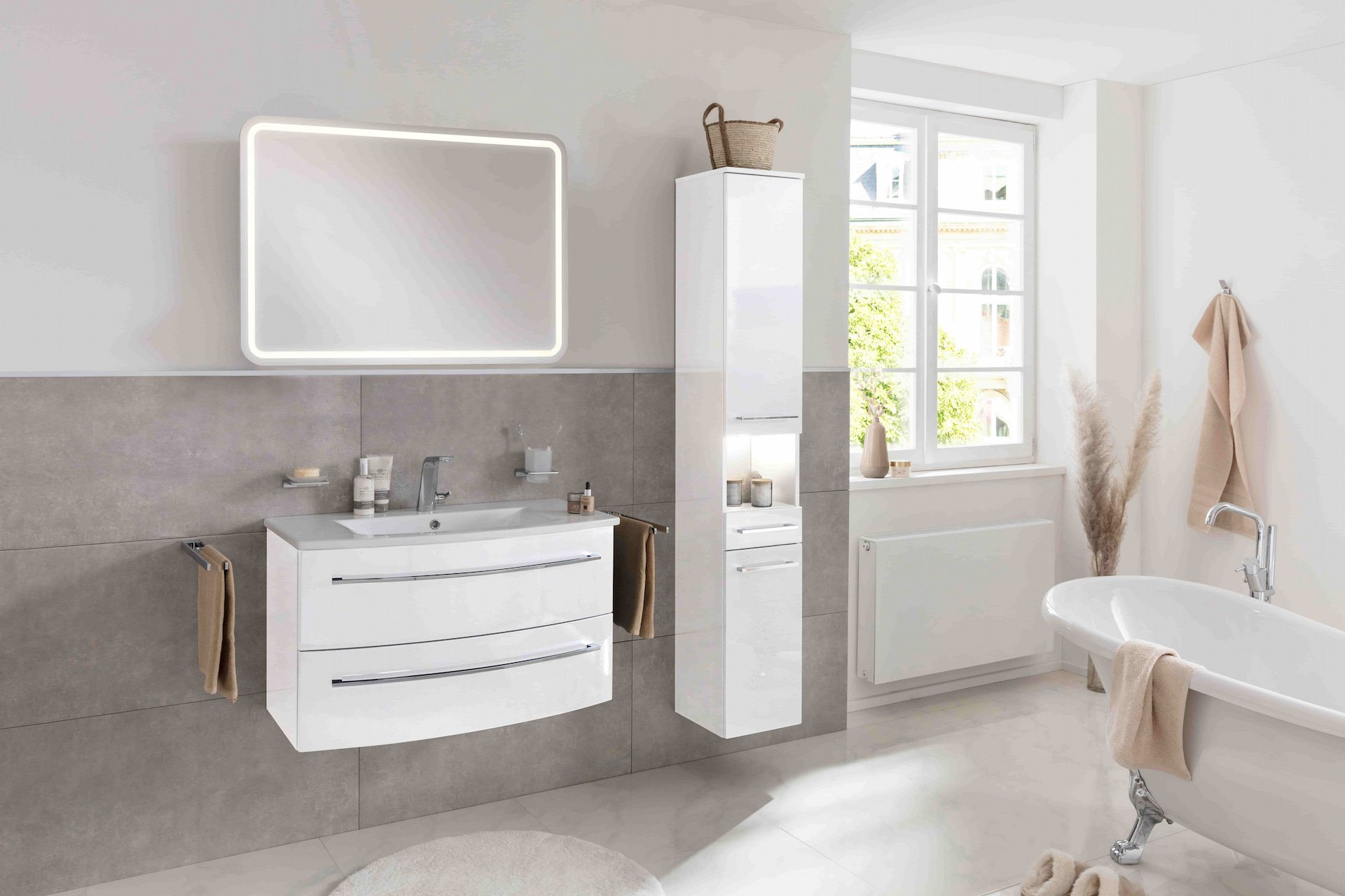 Dein Schatzkästchen aus Form, Farbe und Vielfalt mit der Freiheit zur freien Gestaltung. Das verbirgt sich hinter der Serie IMPULSO der Firma Lanzet. Mit dem 3-teiligen Badmöbel Set holst Du Dir diese Freiheit in Dein Badezimmer. Die leicht geschwungene glänzend weiße Front des Waschtischunterschranks verleiht Deinem Bad Leichtigkeit und Eleganz. Zwei großräumige Schubladen bieten ausreichend Platz für Deine Badaccessoires. Moderne Einzugsdämpfer sorgen für ein nahezu geräuschloses Schließen. Der Waschtisch aus feiner weißer Keramik orientiert sich an der Form des Unterschranks und erzeugt im Zusammenspiel ein harmonisches Bild. Ablageflächen auf der rechten und linken Seite des Waschbeckens eignen sich hervorragend für Seifenspender oder die elektrische Zahnbürste. Optional lässt sich Dein neuer Waschtisch mit einem LED-Band beleuchten (nicht im Lieferumfang enthalten). Damit kreierst Du ein exklusives Ambiente und erhellst zudem das Innenleben der geöffneten Schubladen. Über dem 3-teiligen Bad Set erstrahlt ein 100 cm breites, modernes LED Spiegelelement mit umlaufender Beleuchtung. Auf Grund seiner gerundeten Kanten nimmt der Spiegel die Formensprache von Waschtisch und Waschtischunterschrank auf. So entsteht mit diesem exklusiven 3-teiligen Badmöbel Set ein harmonisches, formvollendetes Bild in Deinem neuen Badezimmer. Als Käufer eines Lanzet Badmöbels kannst Du sicher sein, dass alles stimmt. Das Design! Die Qualität des Materials! Die Verarbeitung! Alle Möbel von Lanzet werden von fachkundigem Personal mit viel Liebe zum Detail in Deutschland hergestellt und für Dich vormontiert. Damit sind sie rasch in Deinem Badezimmer aufgestellt.