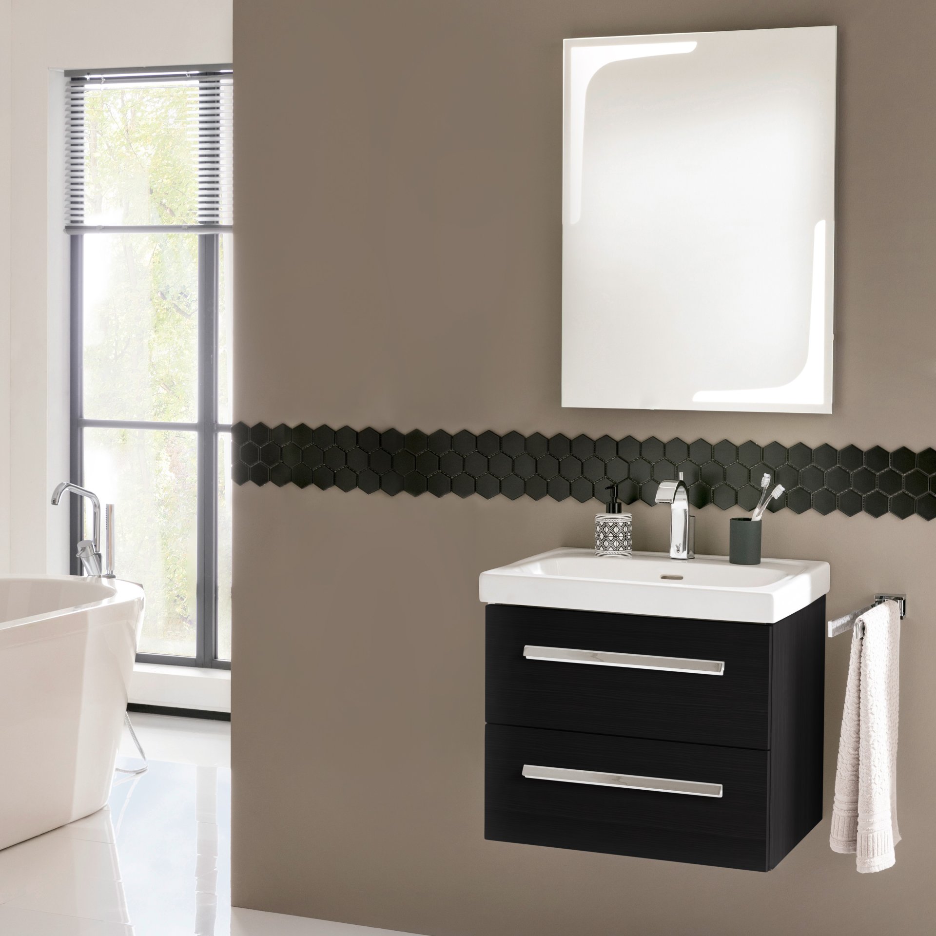 Der in Schwarz gehaltene Waschtischunterschrank von Lanzet K1 verleiht Deinem Badezimmer ein edles Aussehen. Der Unterschrank ist im Design zeitlos und formschön gestaltet. Dank seiner Breite von nur 59,2 cm eignet er sich besonders für kleine Bäder und Gäste-WCs und bietet genügend Stauraum für Handtücher und weitere Badutensilien.