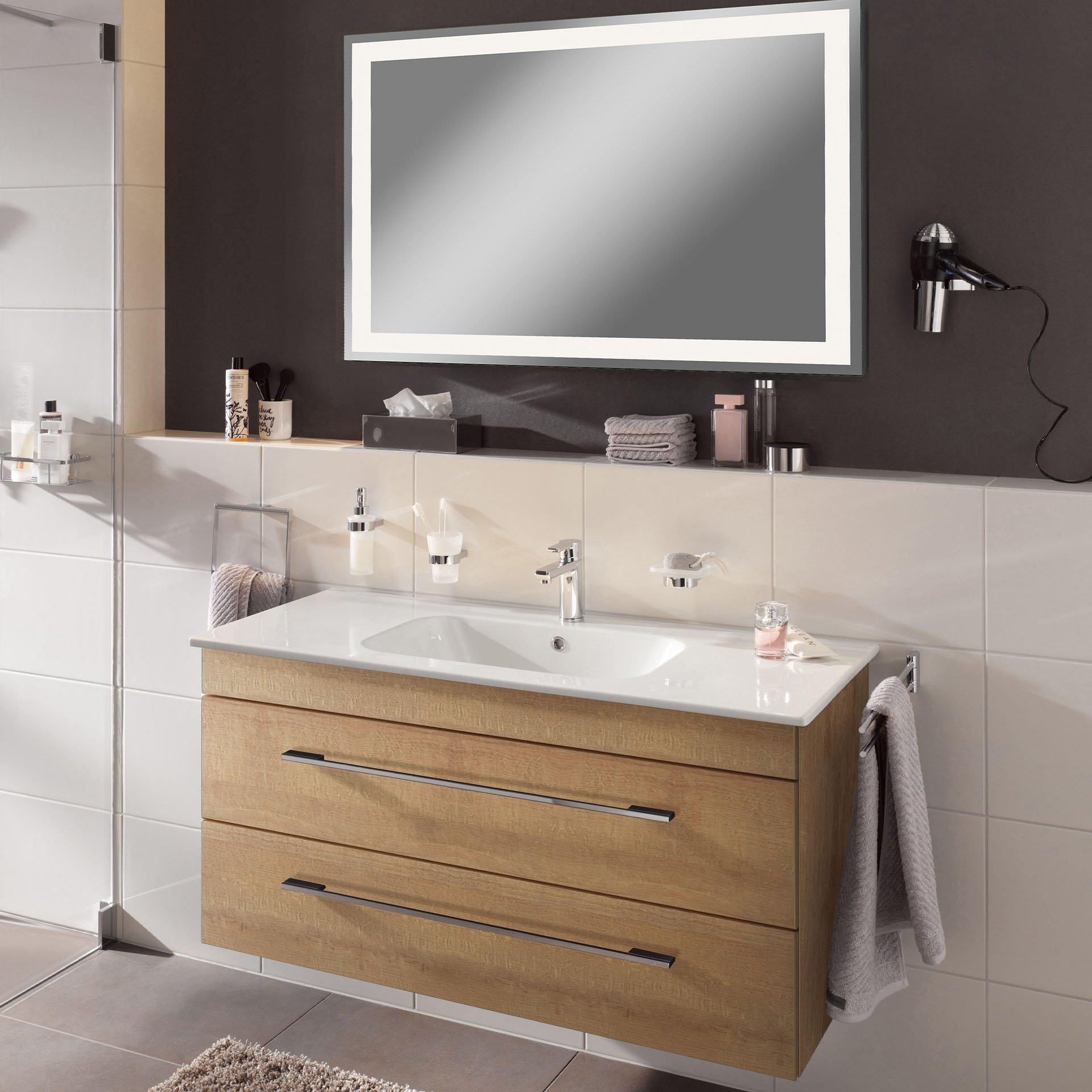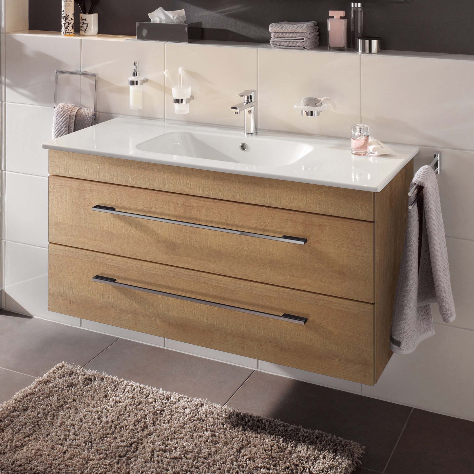 Die Farbe Braun steht für Natürlichkeit und Wärme im Bad. Gleichzeitig sorgt das Design Berg Eiche für Entspannung und erinnert an einen Spaziergang im Wald. Zeitlos schöner Chic! Der 116 cm breite Waschtischunterschrank in Braun hell aus der Serie K8 von LANZET zeichnet sich durch seine abgerundeten Kanten und seine sanfte Formensprache aus. Die zwei großzügigen Schubladen mit Einzugsdämpfung bieten viel Stauraum. So sind Deine Badutensilien schnell verstaut und immer griffbereit. Auf Grund seiner Maße eignet sich der Waschbeckenunterschrank mit seiner Breite von 116 cm besonders für große Bäder und das Familienbad. So entsteht eine Kommunikationsinsel für die ganze Familie. Möbel von LANZET werden von fachkundigem Personal für Dich mit viel Liebe zum Detail in Deutschland hergestellt. Damit ist der Lanzet K5 Waschbeckenunterschrank 118 cm, Braun hell rasch in Deinem Badezimmer aufgestellt.