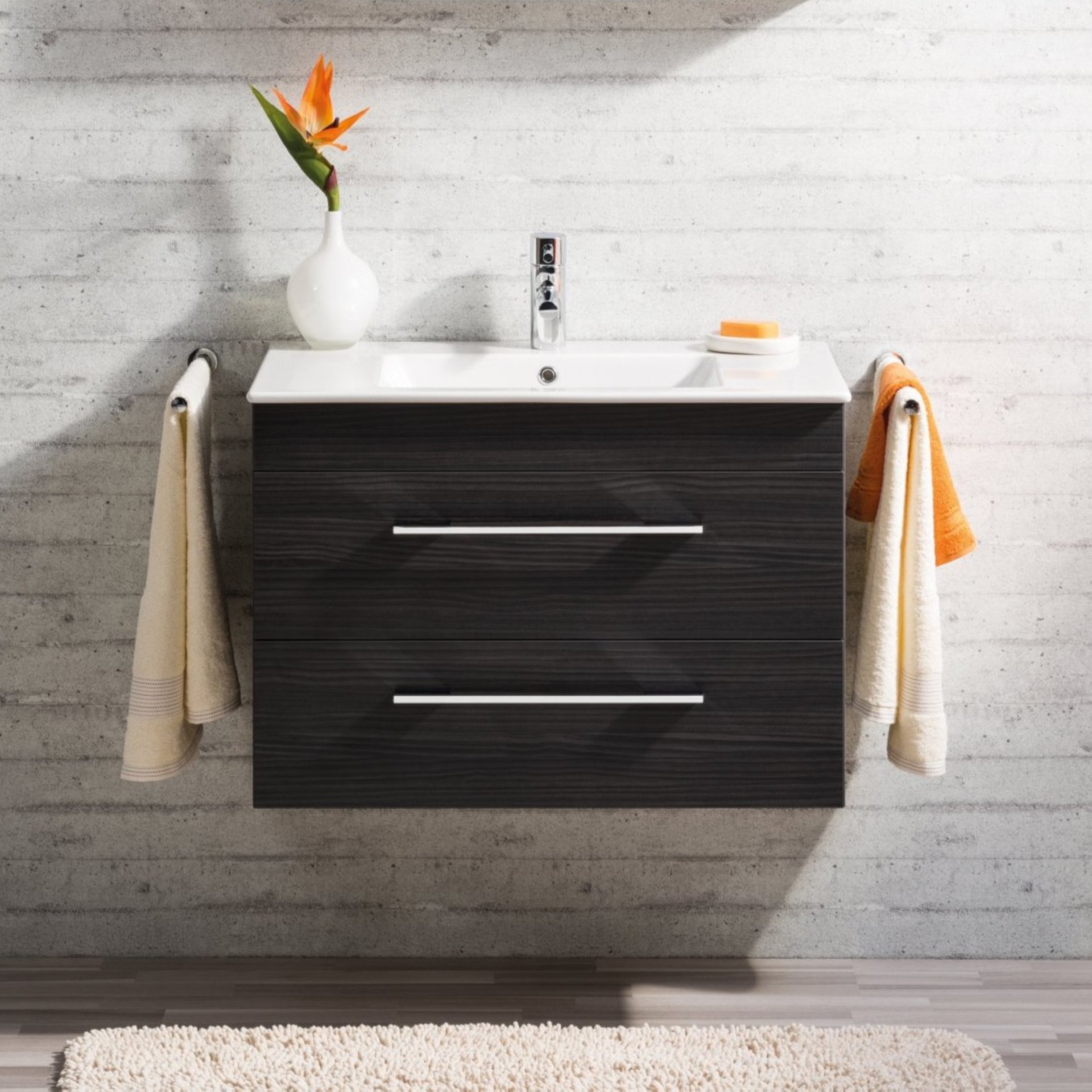 Der in Schwarz gehaltene Waschtischunterschrank von Lanzet K5 verleiht Deinem Badezimmer ein edles Aussehen. Der Unterschrank ist im Design zeitlos und formschön gestaltet. Mit seiner Breite von 88 cm und zwei ausziehbaren Schubladen mit Einzugsdämpfung bietet der Waschtischunterschrank ausreichend Stauraum für Handtücher und sonstige Badutensilien.