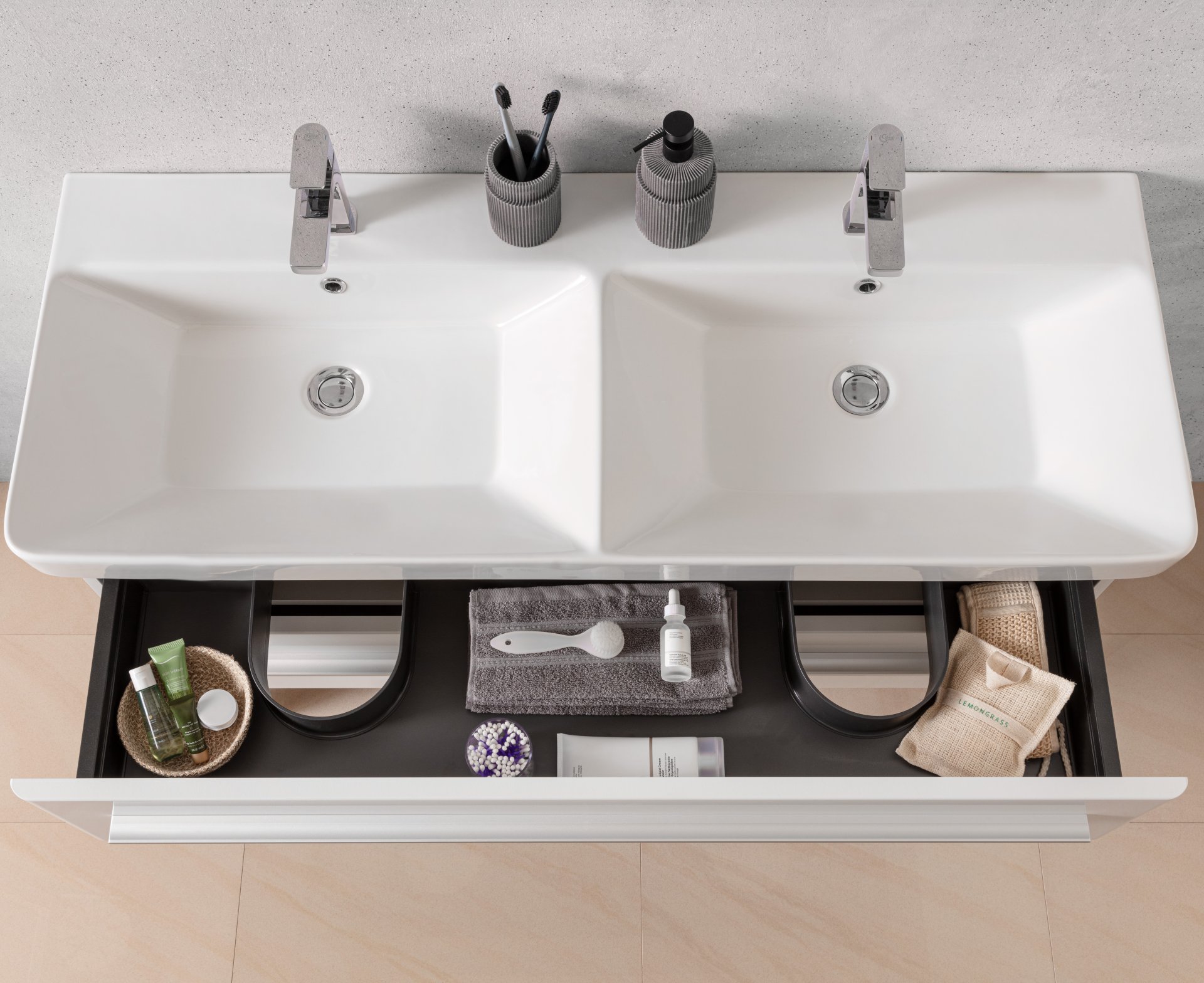 - Ausstattung: 2 Auszüge mit Einzugsdämpfung, 2 Griffe Aluminium matt