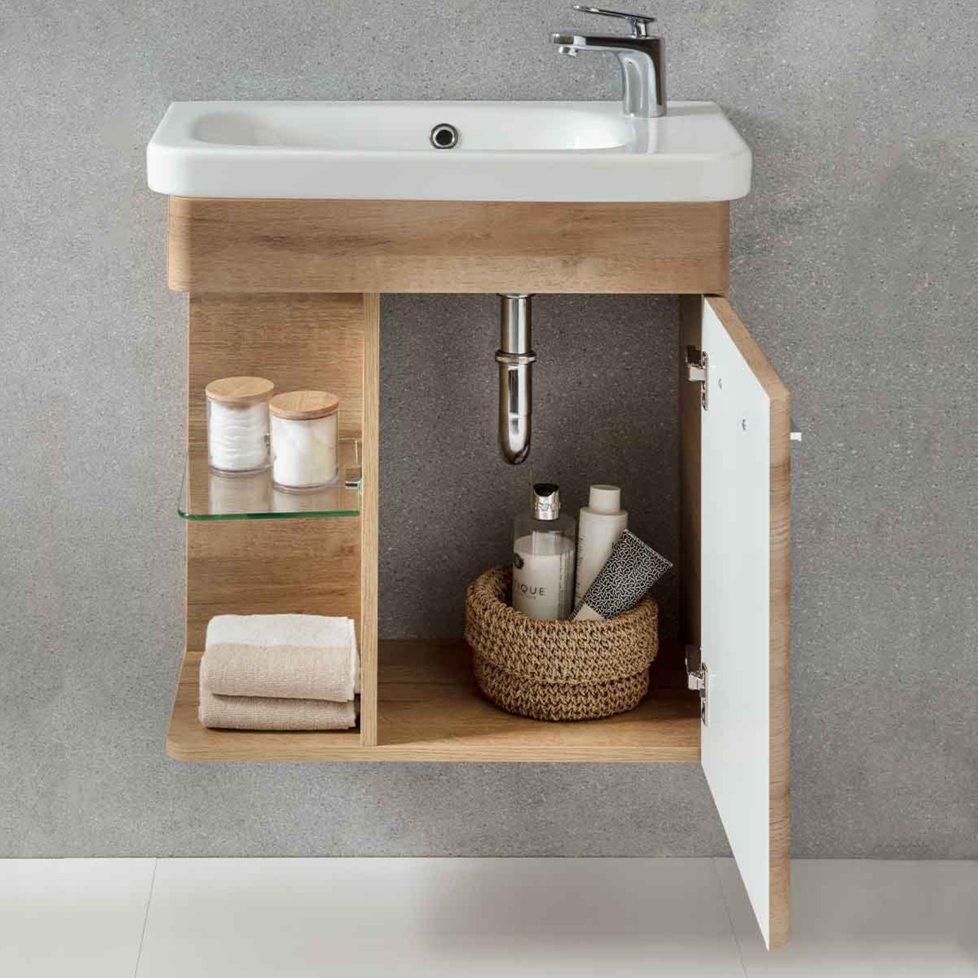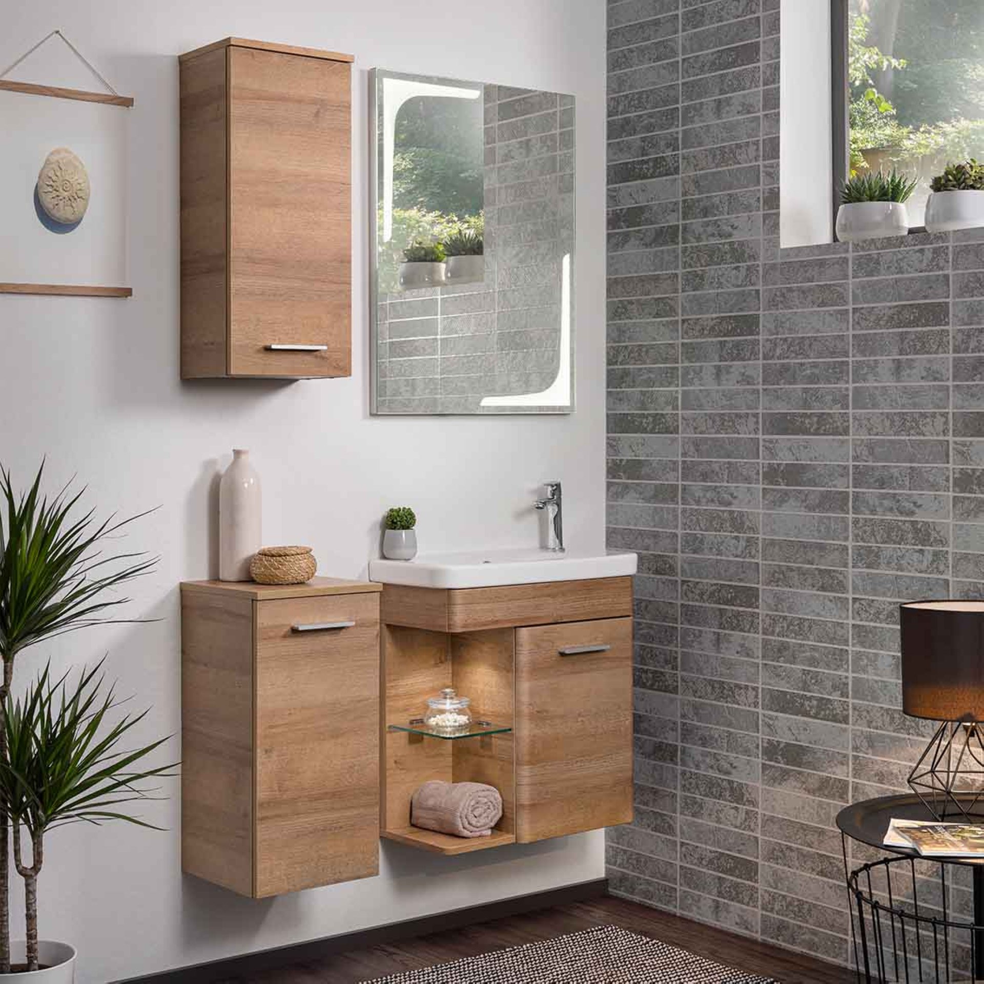 Die natürlichen Farbspektren der Eiche sind einzigartig. Der in Berg Eiche/Farbton hellbraun gehaltene Waschtischunterschrank aus der Serie K8 von LANZET bringt diese Farbgebung der Natur in Dein Badezimmer. Das Badmöbel Set eignet sich besonders gut für das moderne Gästebad. Durch die abgerundeten Kanten und seine sanfte Linienführung ist es zeitlos. Sehr gelungen ist der offene Glaseinlegeboden mit dem LED Spot. Er ist Blickfang und Ablagefläche für Deine täglichen Badaccessoires. Indirektes Licht bringt ein beruhigendes und exklusives Ambiente in Dein Bad. Das Besondere: Das Licht ist durch die LED-Technik energiesparend und wird mithilfe eines Bewegungsmelders aktiviert. Er ist unterhalb des Waschtischunterschranks befestigt. Das LANZET K8 Gäste WC Set 60 cm Hellbraun wird gekrönt durch seinen hochwertigen Keramikwaschtisch in Weiß mit seiner tiefen Waschmulde. Das Waschbecken passt sich formvollendet an die Linienführung des Unterschranks an und ist nur als rechte Ausführung erhältlich. Die Waschtischarmatur befindet sich rechts. Als Käufer eines LANZET Badmöbels kannst Du sicher sein, dass alles stimmt. Das Design! Die Qualität des Materials! Die Verarbeitung!. Alle Möbel von LANZET werden von fachkundigem Personal mit viel Liebe zum Detail in Deutschland hergestellt und für Dich vormontiert. Damit sind sie rasch in Deinem Badezimmer aufgestellt.
