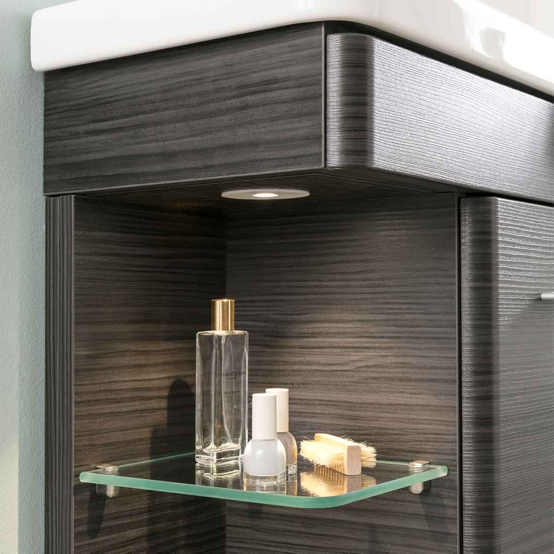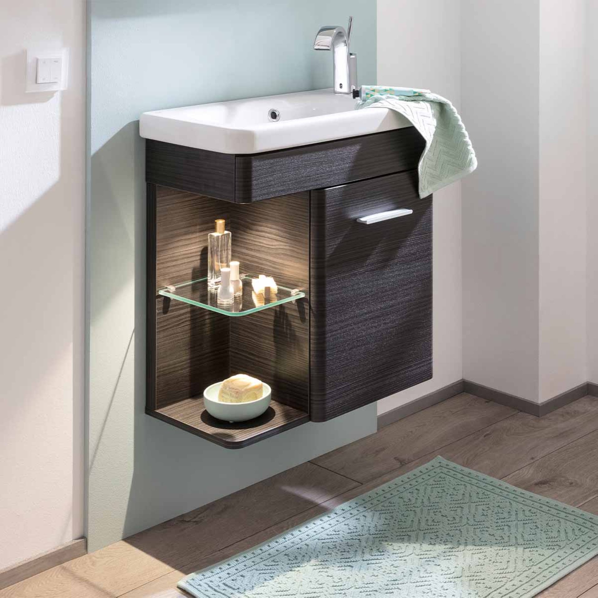 Schwarz: Die aktuelle Trendfarbe für Dein Badezimmer. Der in Schwarz gehaltene Waschtischunterschrank aus der Serie K8 von LANZET im Design Dark Oak eignet sich besonders gut für das moderne Gästebad. Durch die abgerundeten Kanten und seine sanfte Linienführung ist er zeitlos. Sehr gelungen ist der offene Glaseinlegeboden mit dem LED Spot. Er ist Blickfang und Ablagefläche für Deine täglichen Badaccessoires. Indirektes Licht bringt ein beruhigendes und exklusives Ambiente in Dein Bad. Das Besondere: Das Licht ist durch die LED-Technik energiesparend und wird mithilfe eines Bewegungsmelders aktiviert. Er ist unterhalb des Waschtischunterschranks befestigt. Dieses Badmöbelset wird gekrönt durch seinen hochwertigen Keramikwaschtisch in Weiß mit seiner tiefen Waschmulde. Das Waschbecken passt sich formvollendet an die Linienführung des Unterschranks an und ist nur als rechte Ausführung erhältlich. Die Waschtischarmatur befindet sich rechts. Als Käufer eines LANZET Badmöbels kannst Du sicher sein, dass alles stimmt. Das Design! Die Qualität des Materials! Die Verarbeitung!. Alle Möbel von LANZET werden von fachkundigem Personal mit viel Liebe zum Detail in Deutschland hergestellt und für Dich vormontiert. Damit sind sie rasch in Deinem Badezimmer aufgestellt.
