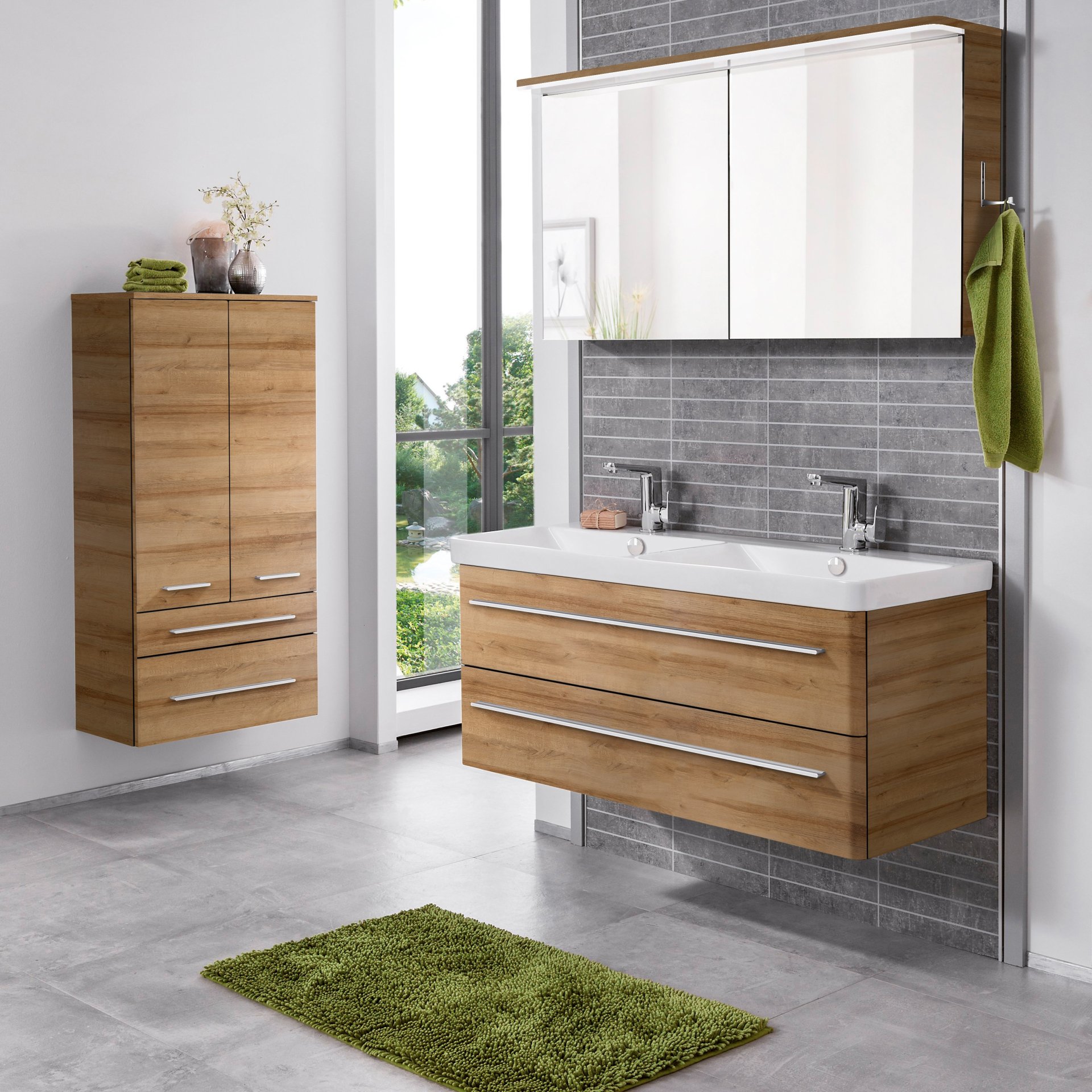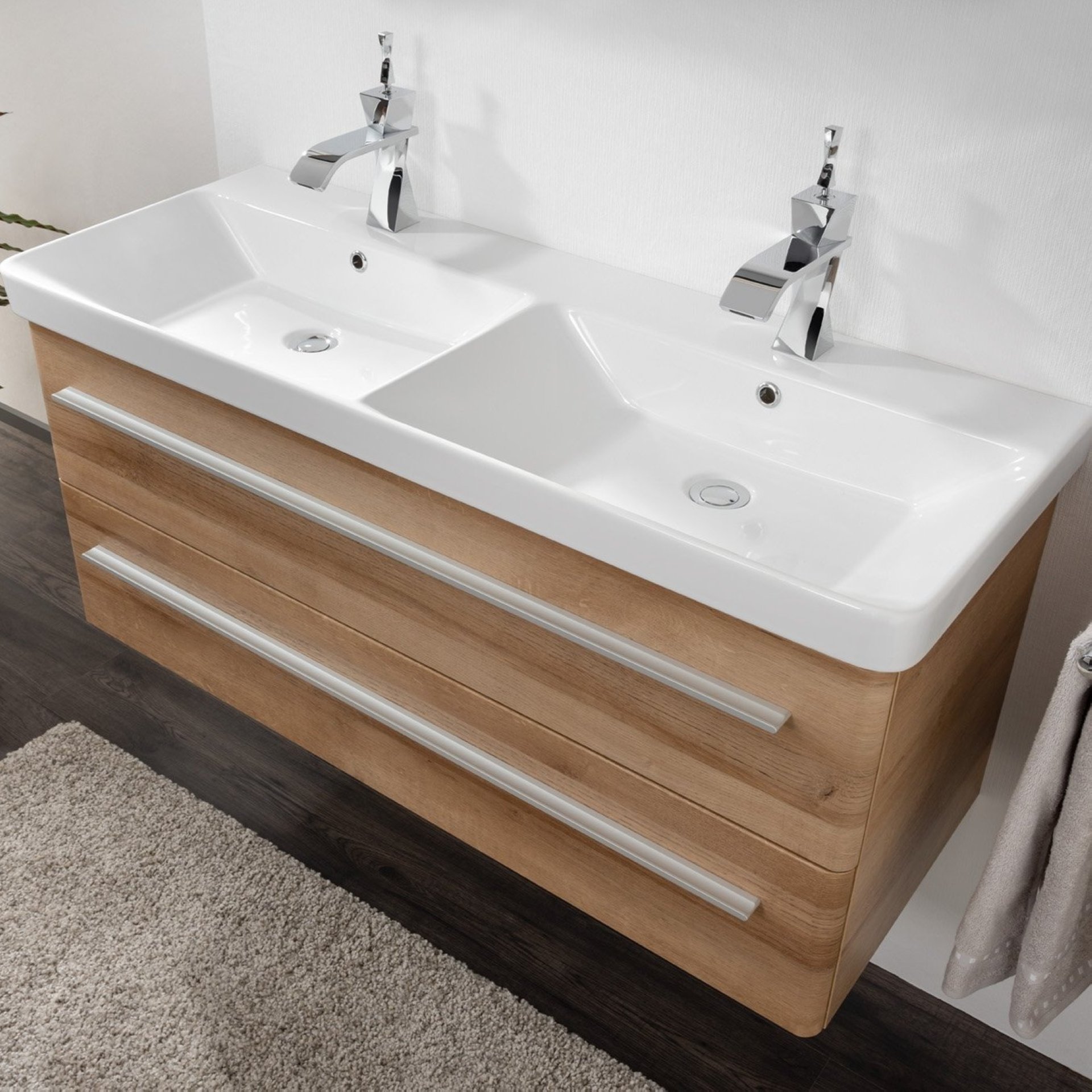 Lanzet K8 Waschtisch Set mit Spiegelschrank 120 cm breit, Braun hell, Doppelwaschbecken Keramik Weiß, LED Spiegelschrank