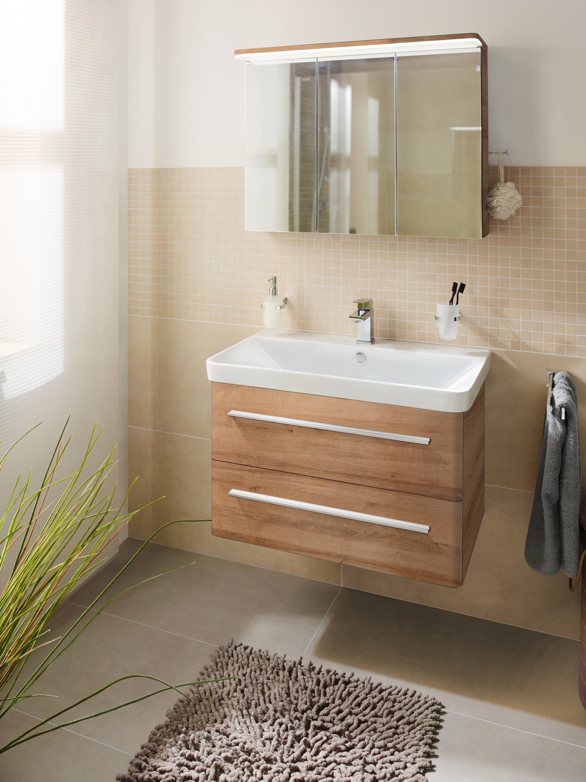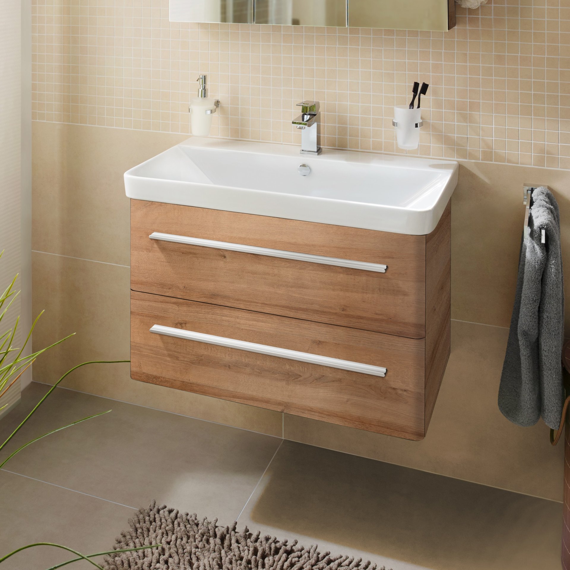 Der 76 cm breite Waschtischunterschrank in hellbraun zeichnet sich vor allem durch seine abgerundeten Kanten und seiner sanften Form aus. Die 2 großzügigen Auszüge mit Einzugsdämpfung bieten viel Stauraum und die Badutensilien sind schnell verstaut und griffbereit.