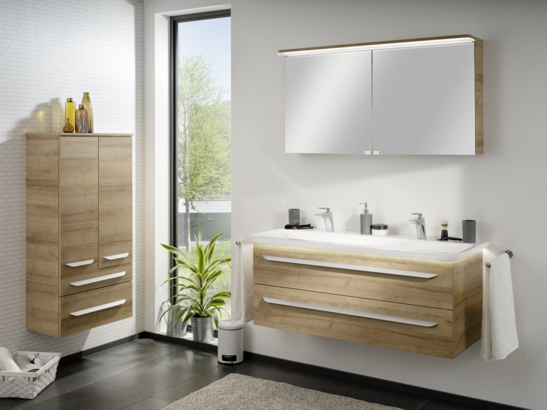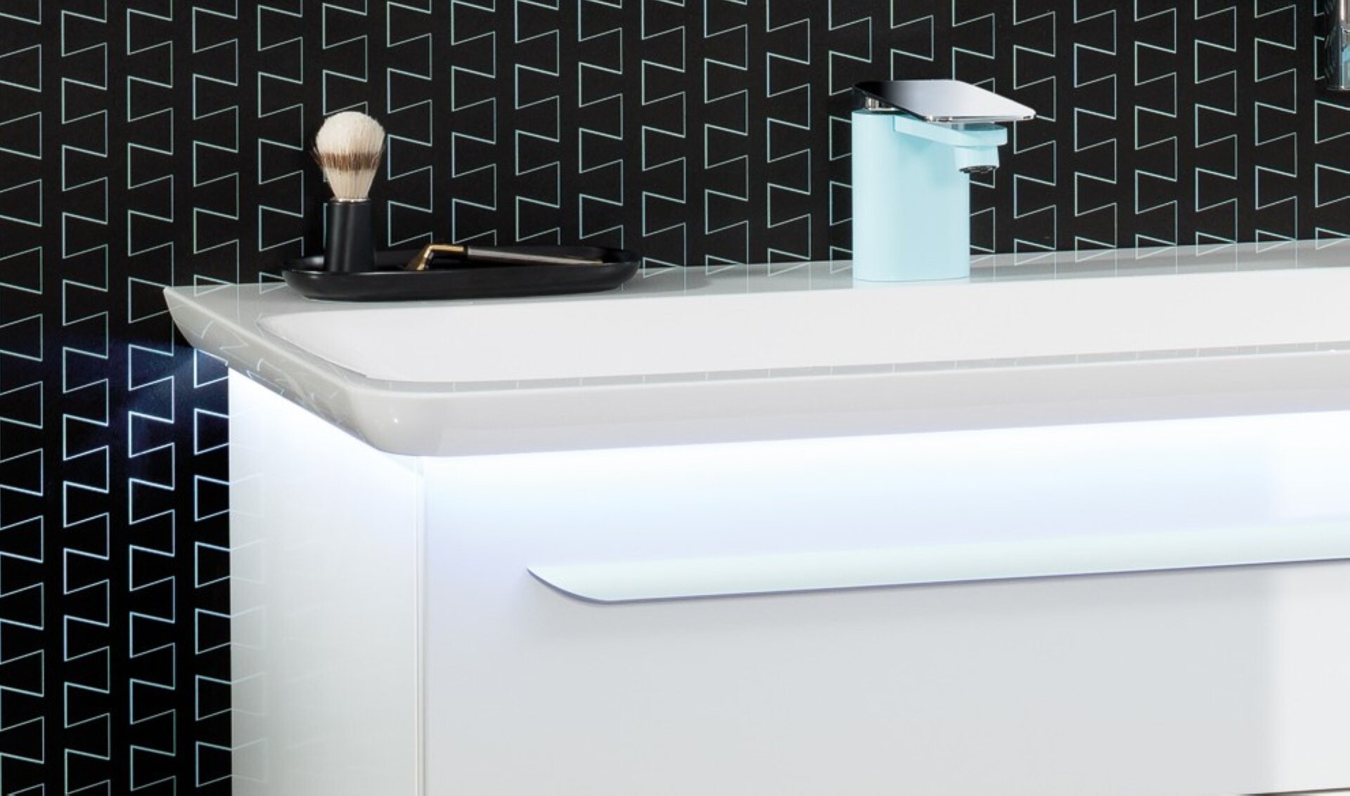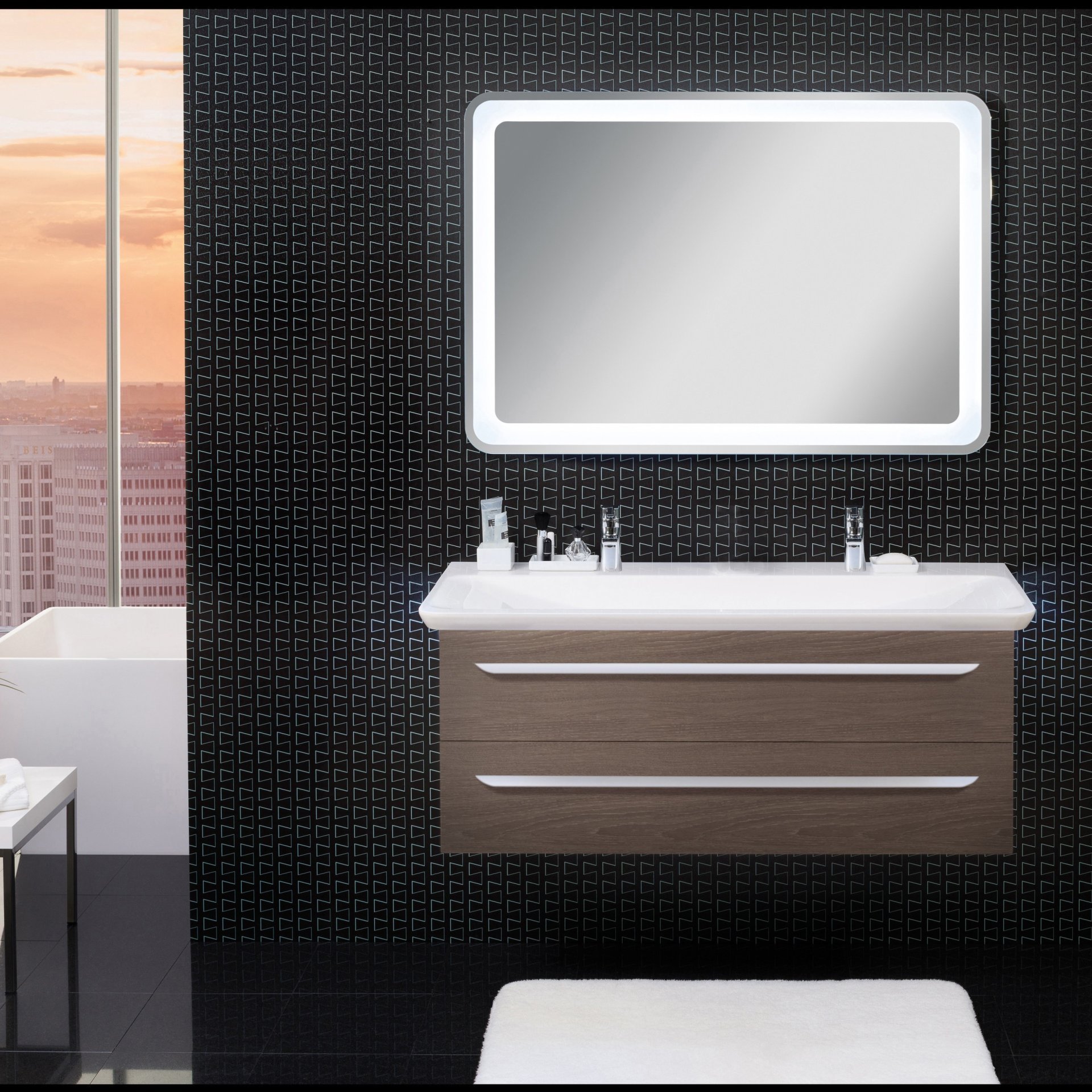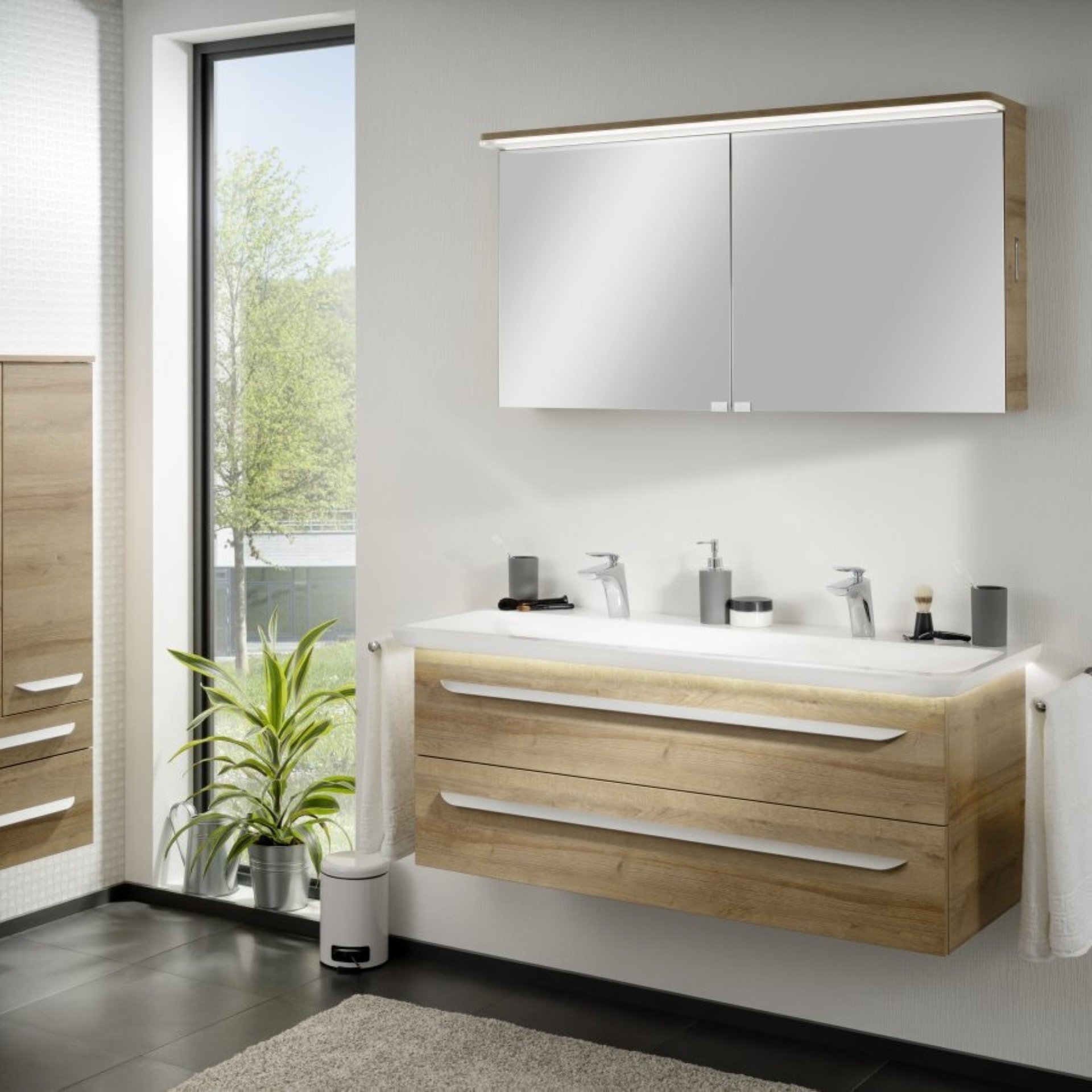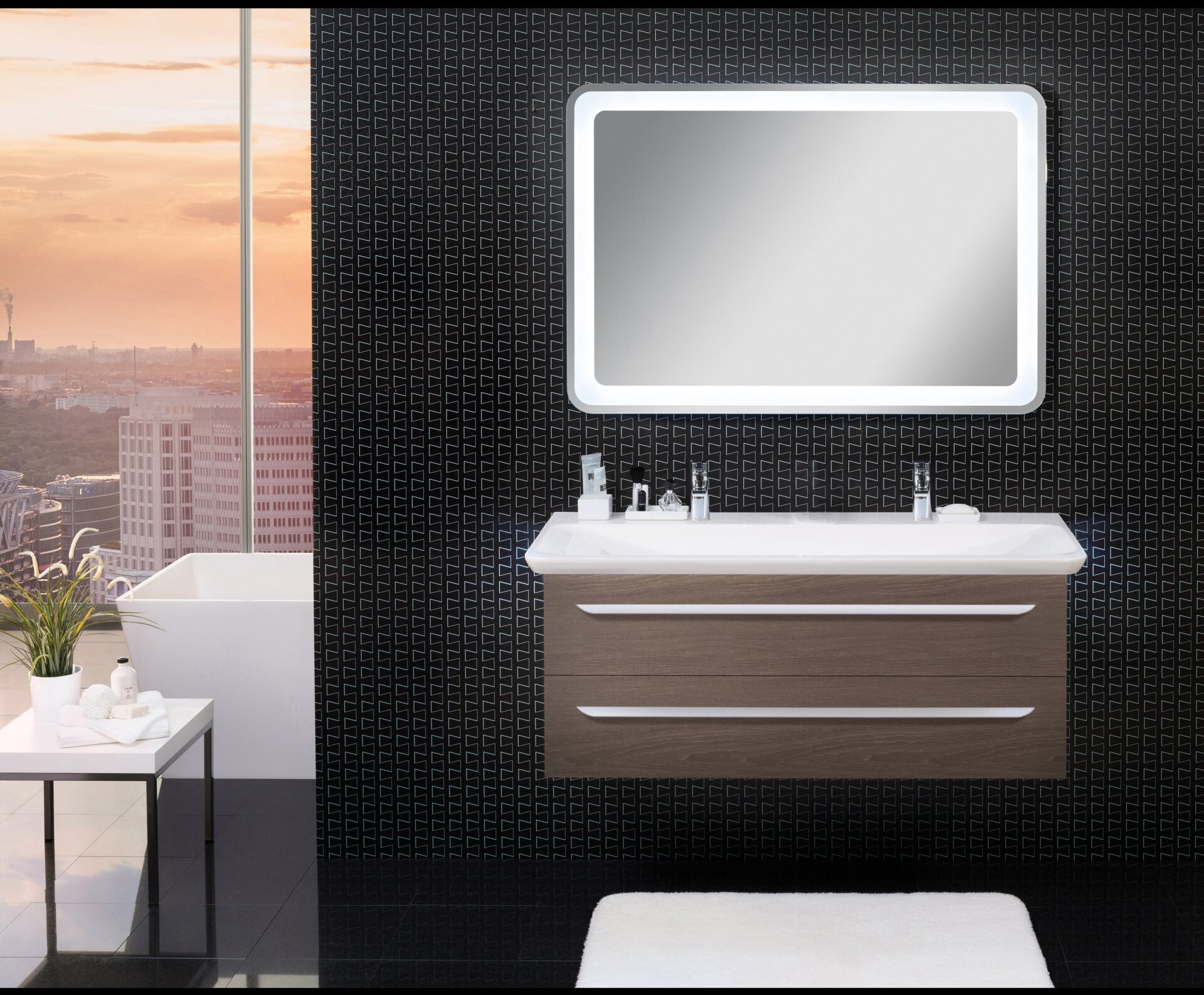 Der 127,5 cm breite Doppelwaschtisch von Lanzet M9 überzeugt durch seine großzügige und ansprechende Gestaltung. Durch die 2 Wasserhähne ist der Doppelwaschtisch insbesondere für Familien oder Bädern für mehrere Personen geeignet. Damit ist der morgendliche Stau im Bad endgültig passé. Besonderes Highlight ist die indirekte LED-Beleuchtung unter dem Waschbecken, die für raffinierte Lichtimpressionen sorgt. Um den Waschtisch zu beleuchten , musst Du einen der folgenden Artikel dazu bestellen: den Bewegungsmelder (Art.Nr. 7934012) oder den LED-Treiber mit Schalter (Art.Nr. 7933012). Ergänze den Waschtisch mit unseren Waschtischunterschränken der Serie M9.