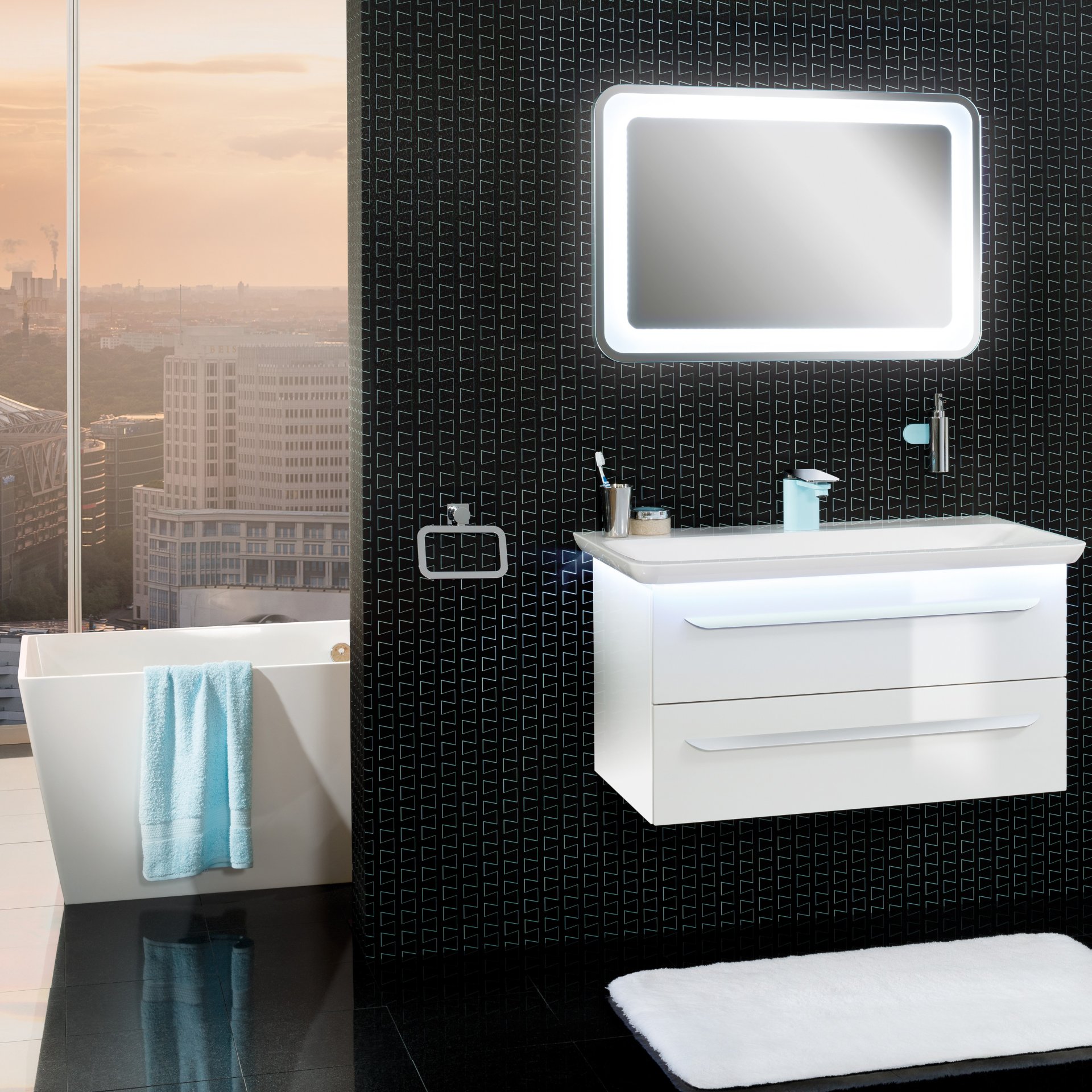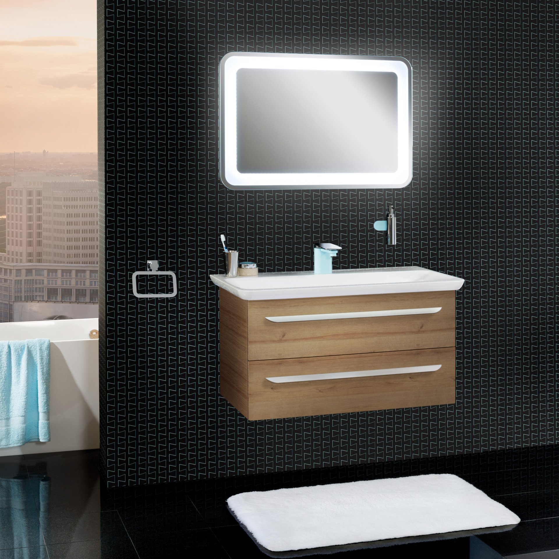 - Design: abgerundete Kanten, umlaufende LED-Beleuchtung