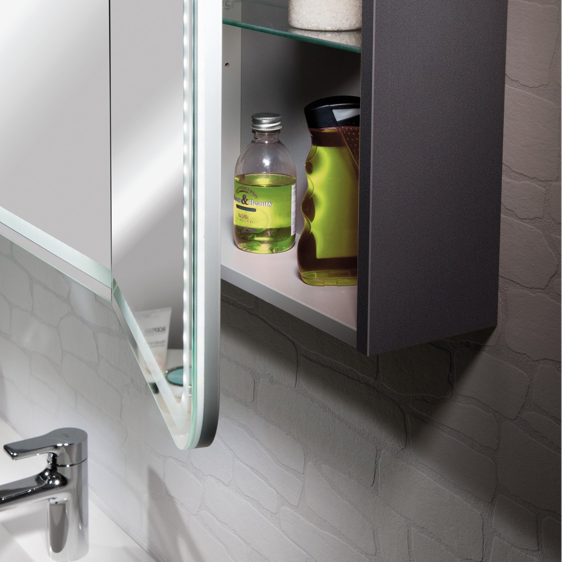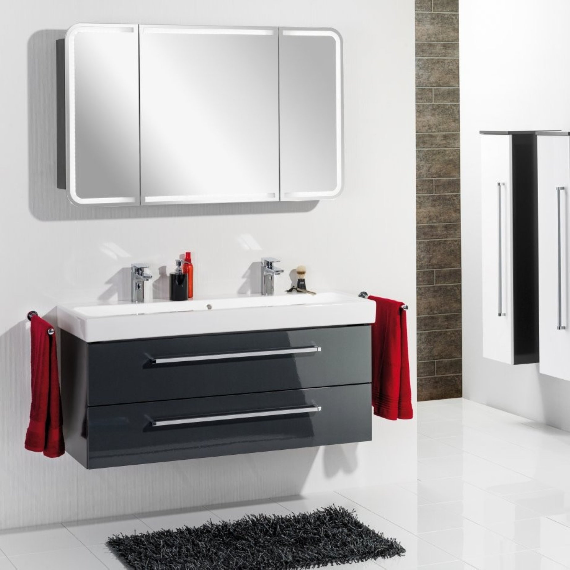 Der M9 Spiegelschrank von Lanzet in einem zeitlosen Design ist der perfekte Hingucker für Dein Badezimmer! Der Schrank verfügt über ein modisches Design und schafft mit der Breite von 120 cm zusätzlichen Stauraum. Der Korpus ist von der Fläche kleiner als die Spiegelfront. Dadurch scheint der Spiegel zu schweben. Diese individuelle Gestaltung hat es den Designern erlaubt, auf Griffe zu verzichten, was den schwebenden Effekt verstärkt. Die LED-Beleuchtung ist elegant in der Tür integriert und sorgt für ein umlaufendes Licht. Dank der LED-Technik ist der luxuriöse Spiegelschrank energieeffizient und extrem stromsparend. Bei geöffneten Außen-Türen ergibt sich eine außergewöhnliche 360 Grad Rundumsicht. Auf Grund der eingebauten Dämpfer schließen die drei Türen des Lanzet M9 Spiegelschrank 120 cm mit umlaufender LED-Beleuchtung, Anthrazit sanft. Ordnung bringen die 6 Glaseinlegeböden im Inneren des Schranks. Alle Deine Kosmetikartikel sind immer griffbereit. Als Käufer eines Lanzet Badmöbels kannst Du sicher sein, dass alles stimmt. Das Design! Die Qualität des Materials! Die Verarbeitung! Alle Möbel von Lanzet werden von fachkundigem Personal mit viel Liebe zum Detail in Deutschland hergestellt und für Dich vormontiert. Damit sind sie rasch in Deinem Badezimmer aufgestellt.