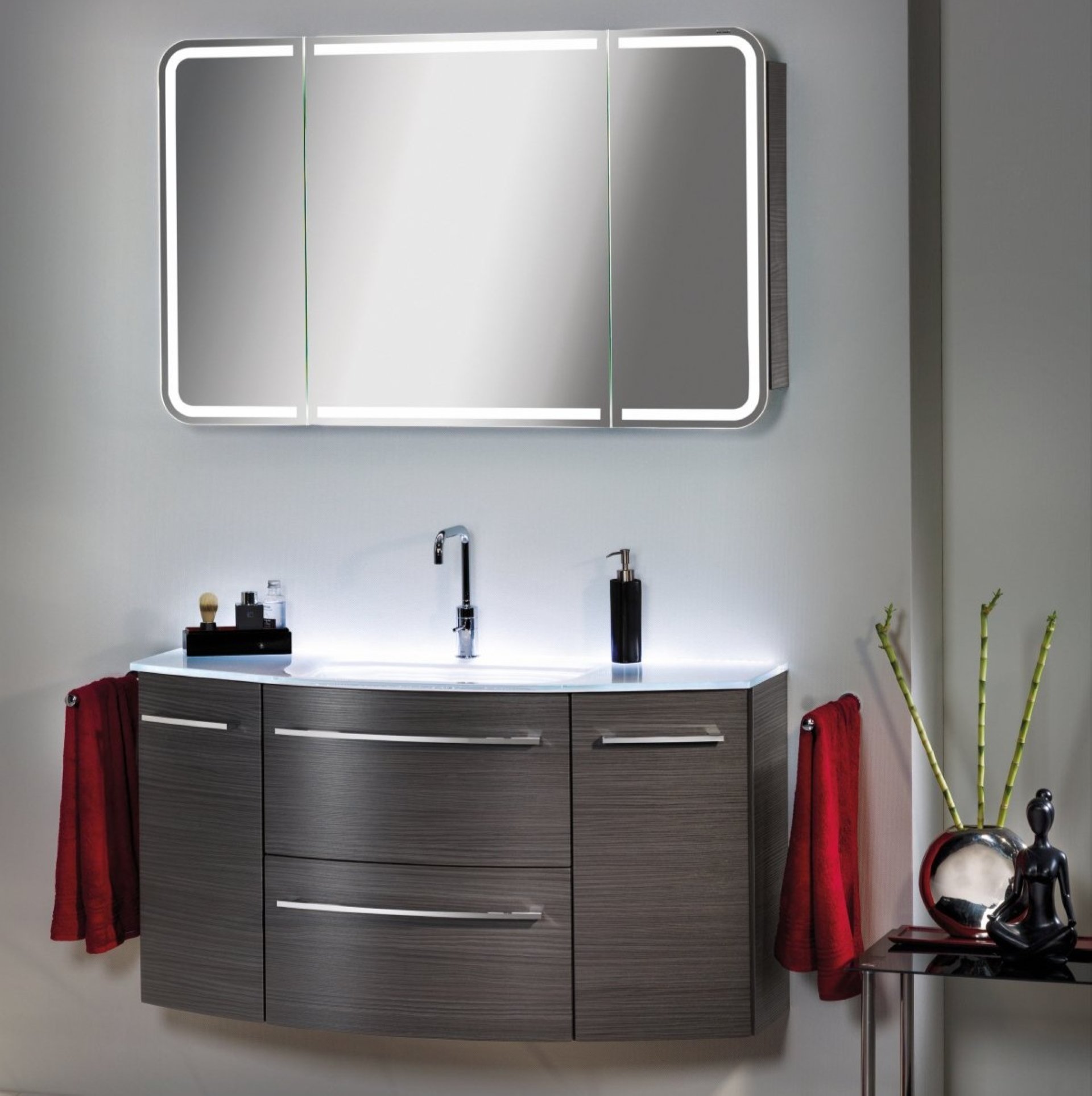- Beleuchtung: 3 Spiegeltüren mit LED-Beleuchtung, je 26 cm breit (4250 Kelvin)
