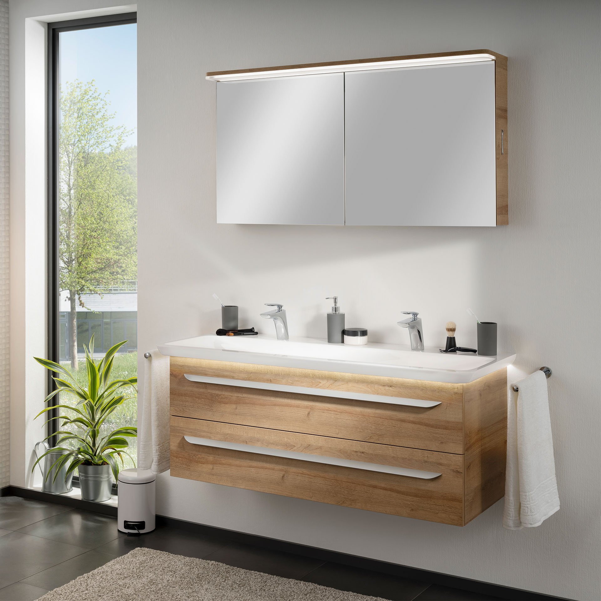Der in hellbraun gehaltene Waschtischunterschrank von Lanzet M9 verleiht Deinem Badezimmer ein edles Aussehen. Der Unterschrank ist im Design zeitlos und formschön gestaltet. Mit seiner Breite von 120 cm bietet er genügend Stauraum. Zwei ausziehbare Schubladen mit Einzugsdämpfung ermöglichen eine praktische Verstauung der Handtücher oder sonstiger Badutensilien.