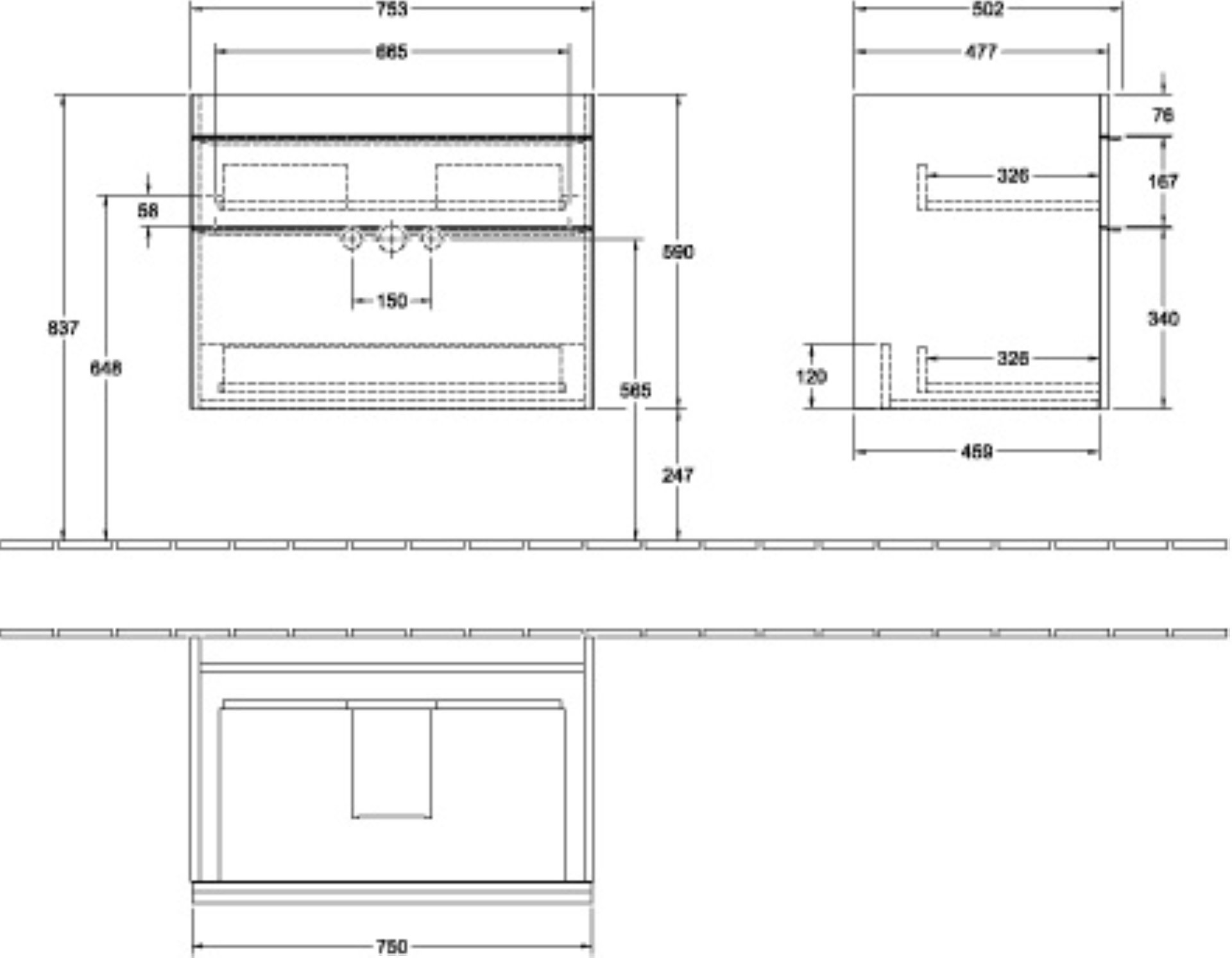 Villeroy & Boch VENTICELLO Waschbeckenunterschrank 75 cm breit, Weiß, Griff Chrom, 2 Schubladen
