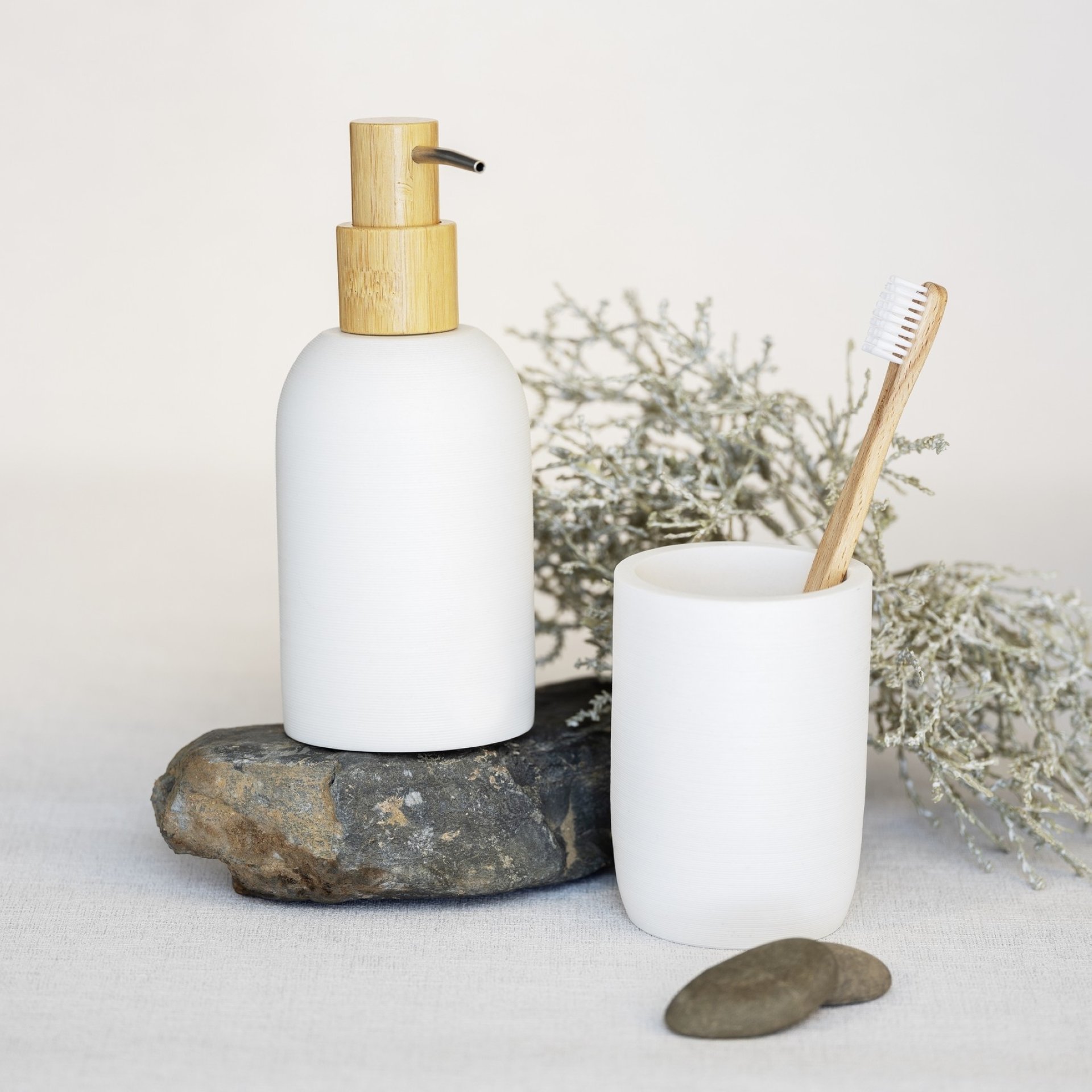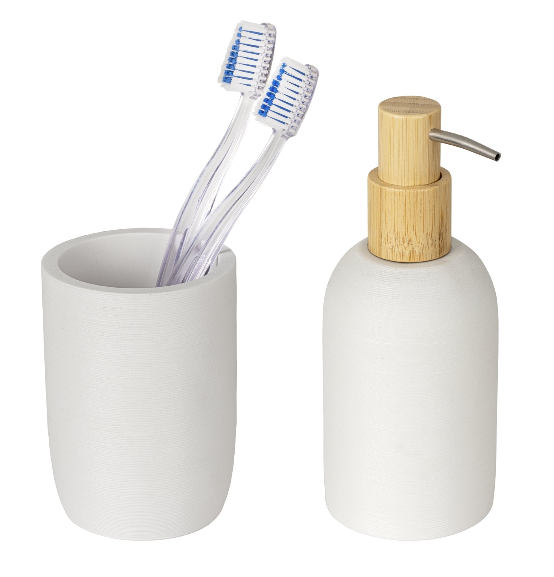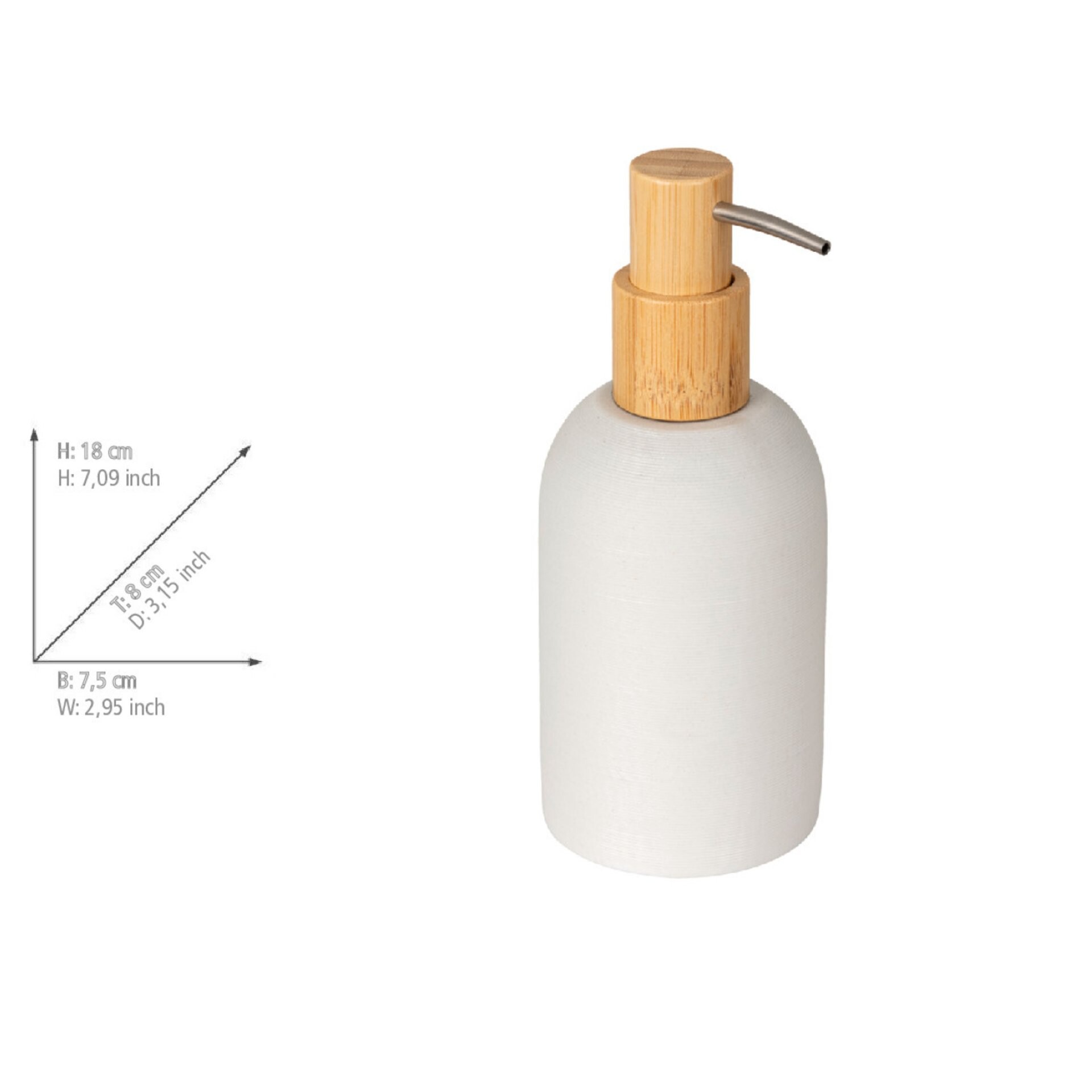 - Das hochwertige Bad-Accessoire Set Altavalle von WENKO bringt mit seinem modernen Design Eleganz in jedes Badezimmer und vereint Funktionalität mit Ästhetik. Bestehend aus einem stilvollen, freistehenden Seifenspender und einem praktischen Zahnputzbecher, ist dieses Bad Zubehör Set die perfekte Lösung für alle, die stilvolles und funktionales Badzubehör suchen. Der elegante, freistehende Seifenspender fasst bis zu 0,25 Liter und sorgt für einen Look in Ihrem Badezimmer, der sich nahtlos in jedes Badezimmerdekor einfügt. Die weiße Farbgebung und die gerade Linienführung wirken klassisch und zeitlos, während die Bambus-Akzente einen Hauch von Natürlichkeit verleihen.