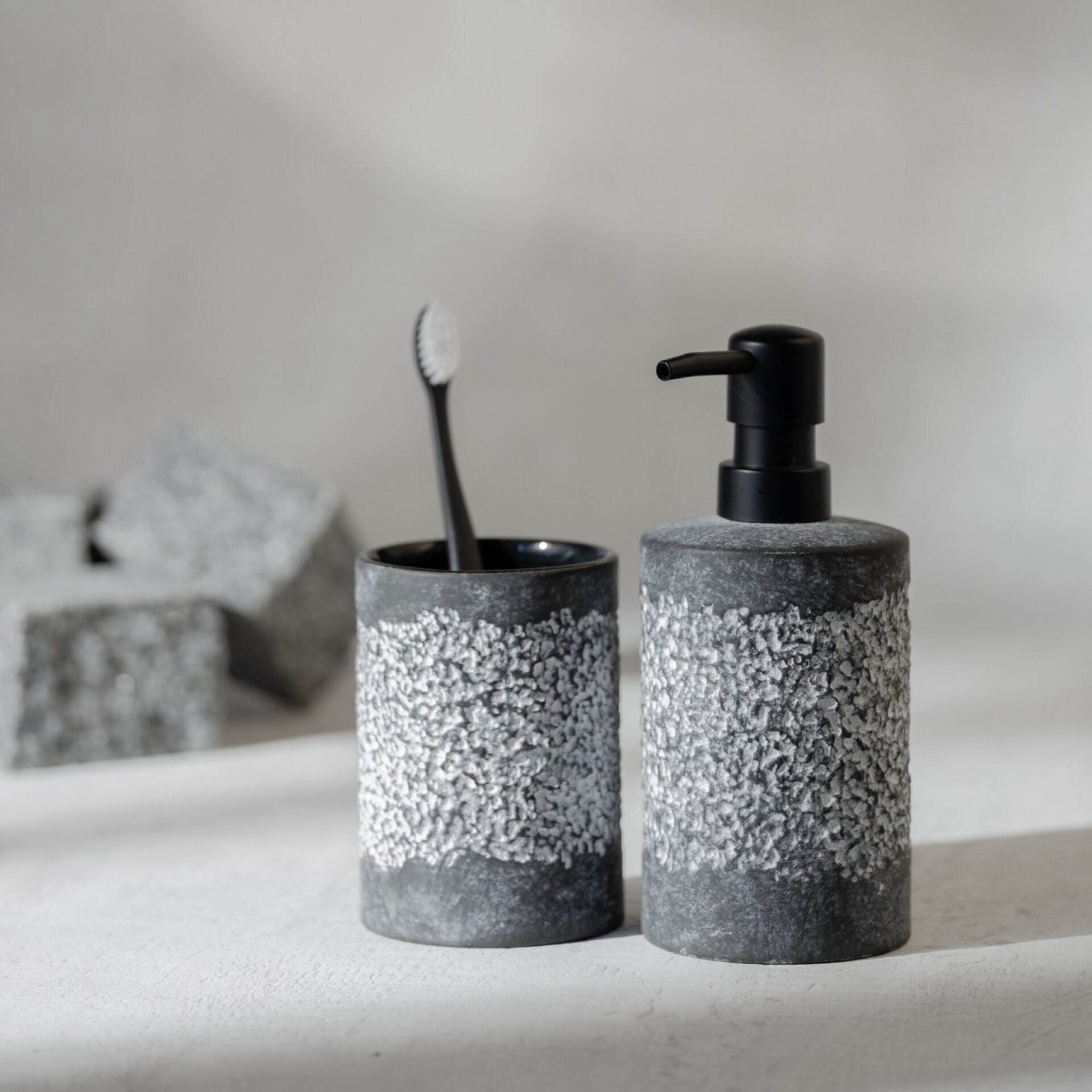 - Mit diesem Rundum-Set holen Sie sich ein geschmackvolles Trio in Ihr Zuhause, das Ihrer Badezimmereinrichtung durch die Stein-Optik und die strukturierte Oberfläche eine authentische Note verleiht. Alle im Set enthaltenen Accessoires sind aus hochwertiger Keramik gefertigt und durch die graue Farbgebung für verschiedene Einrichtungsstile geeignet.